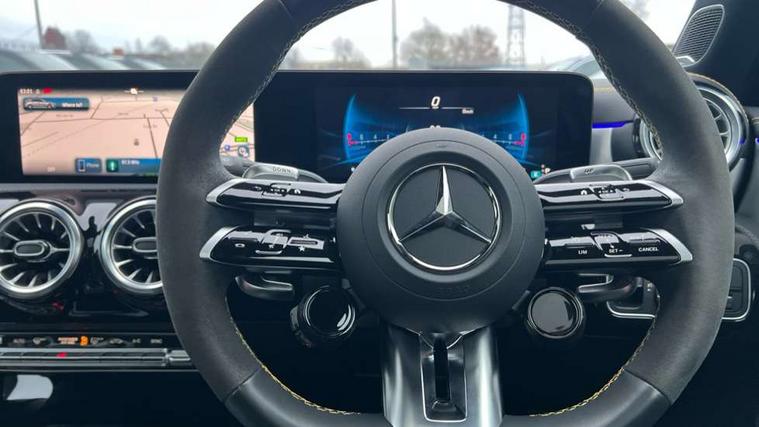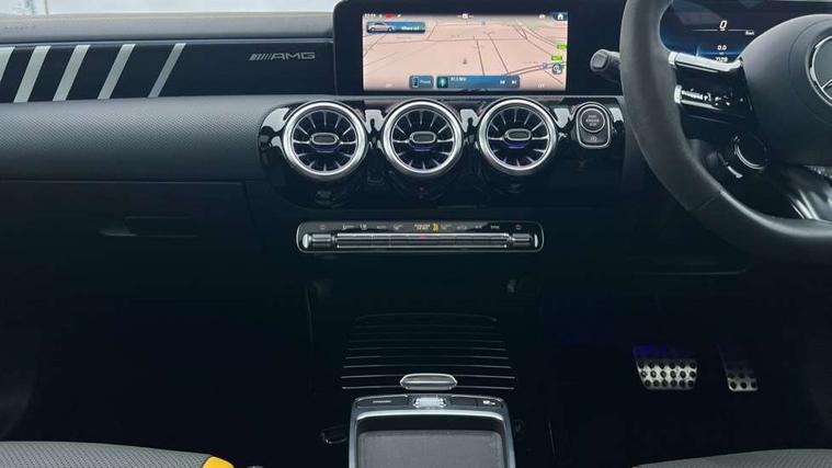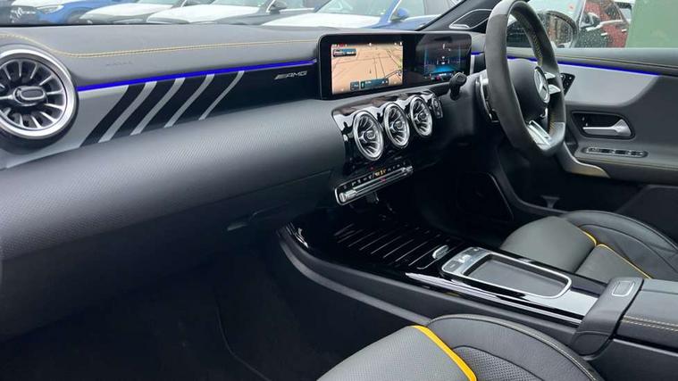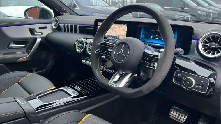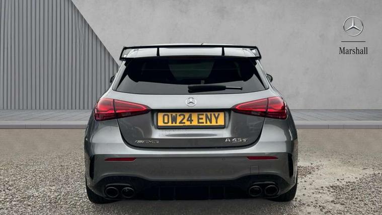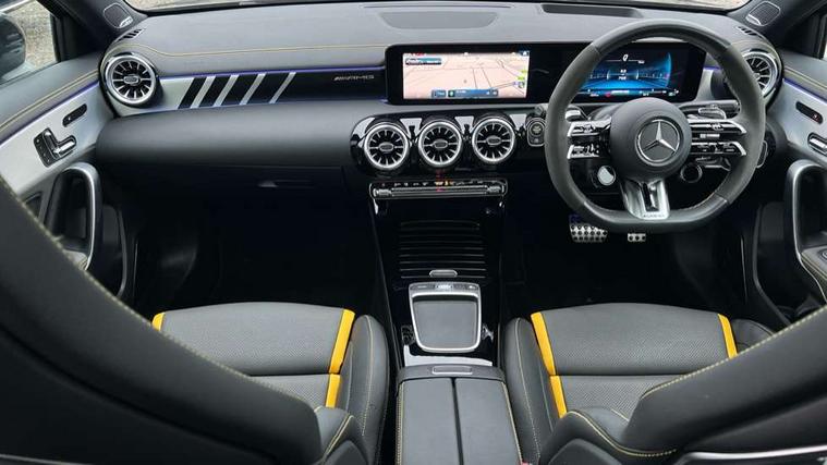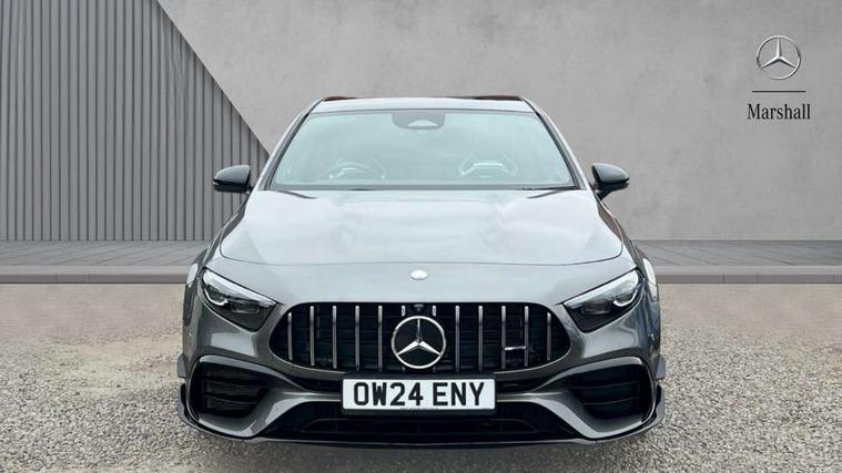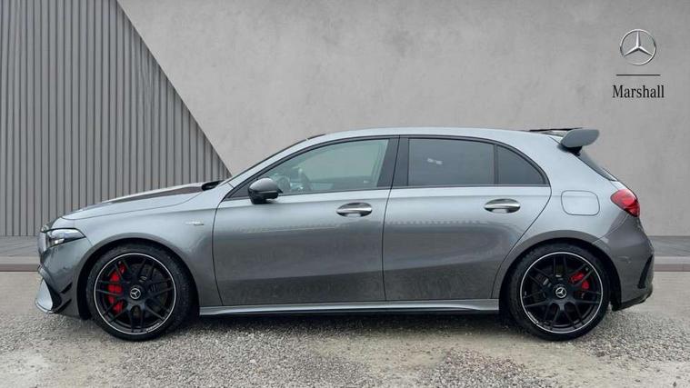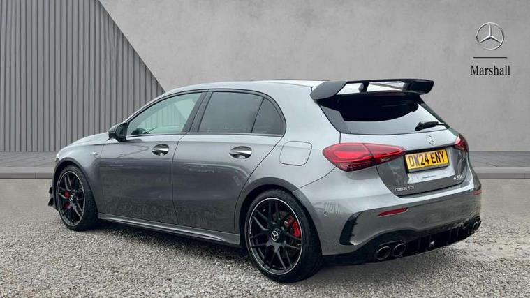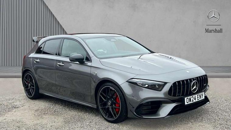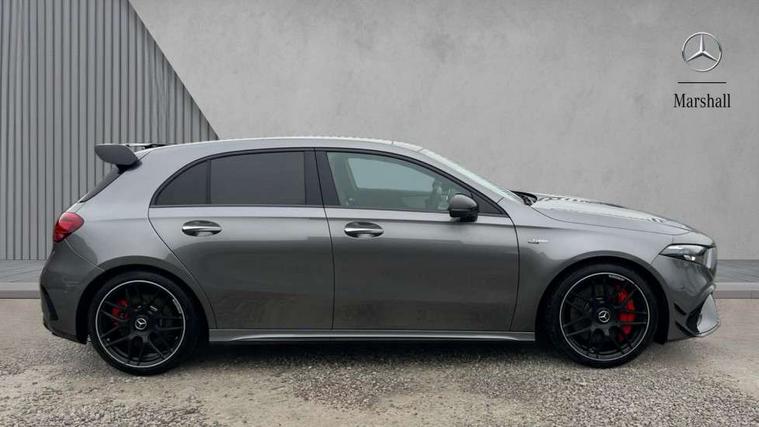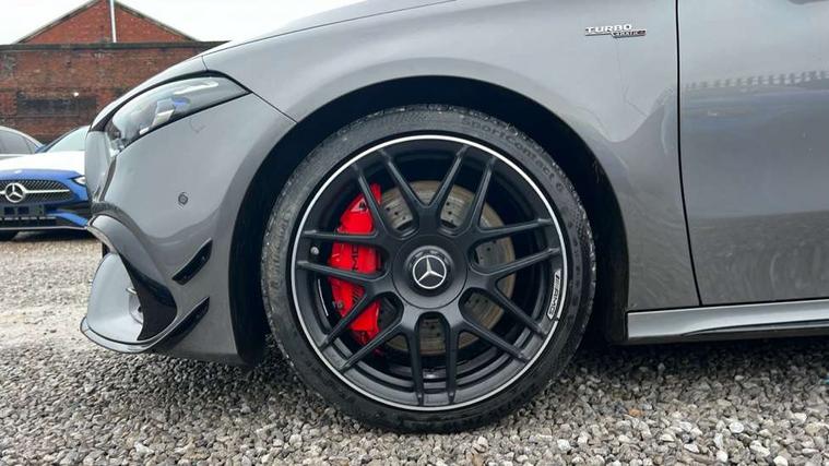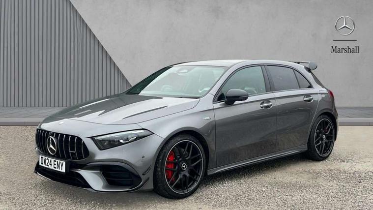 10.25 inch touchscreen central media display with AMG specific, AMG start up logo, visualisation of the AMG drive programs, vehicle and engine data, 10.25" Digital instrument cluster display screen, AMG DYNAMIC SELECT with drive modes(Slippery, Comfort, Sport, Sport+, Individual and Race) incl drift mode via steering wheel shift paddles+Race Start, AMG menu with sporty additional information - Gear indicator with yellow M symbol manual mode, Warm Up menu and Set Up menu, AMG speed sensitive steering with two sets of steering characteristics, Attention assist, Brake pad wear indicator warning light, Car wash mode, Direct steering, Dual bluetooth interfaces, ECO start/stop function, Engine start/stop button, Fingerprint scanner, Fluid level warning indicator for fuel, oil, coolant and washer fluid, Fluorescent jacket for driver, Hard-disk navigation, Head up Display, Hey Mercedes Voice activation, Lamp failure indicator, MBUX augmented reality for navigation, MBUX Interior assistant, Mercedes me connect including emergency call system, accident recovery, breakdown and maintenance management, Mercedes me remote services, Outside temperature gauge, Owners manual in English, Pre-installation of private car share, Preinstallation for Mercedes Benz link, Remote boot closing, Service indicator (ASSYST), Smartphone integration with Apple CarPlay and Android auto, Speed sensitive power steering, Tailgate, Traffic sign assist, Trip computer in multifunction display with current consumption indicator, Wireless charging, AMG performance 4MATIC+ with torque control, AMG suspension including AMG specific axles and sporty spring/damper setup, Suspension with adaptive damping system, Burmester surround sound system (590W) with Dolby atmos, speakers - 1 center+4 doors+2 in C pillars, tweeter, subwoofer, DSP amp, burmester lettering, DAB Digital radio, MBUX multimedia system, 4 Electric Front and Rear windows, Adaptive brake lights, AMG A45 S bodystyling -rear apron, four vertical fins, side sill panels, roof spoiler lip, specific front apron, diffuser look and S label on boot lid, AMG real performance exhaust sound system, AMG specific radiator grille in high gloss chrome with AMG lettering, Beltline strips in High gloss Black, Body colour bumpers, Body colour door handles with chrome inserts, Body colour side skirt, Electric adjustable and heated door mirrors with integrated LED side indicators, Headlamp assist automatic headlamp activation, Heat insulating dark tinted rear and rear side windows, Heated glass rear windscreen + timer control, LED daytime running lights, LED High level third brake light, LED tail lamp, Multibeam LED headlamps with adaptive highbeam assist and cornering function, Panoramic sliding sunroof, Privacy glass, Radio aerial, Rain sensing windscreen wipers with two sensitivity settings, Rear fog lights, Rear side wing doors, Rear windscreen wiper, Surround lighting with logo projection, Two round twin tailpipe trim elements each measuring 90 mm in diameter and AMG lettering plus ribbing on the inside of the pipe, Valve control dependent on drive program, Wider wheel arches for AMG wheels, Window line trim strip in black, 3 seat bench in 2nd row, 3 Spoke flattened lower section sporty design AMG Performance steering wheel in nappa leather/microcut microfibre, 40:20:40 split folding rear seats, Air conditioning - Two zone thermotronic luxury automatic climate control with display, AMG brushed stainless steel sports pedals with rubber studs, AMG centre console finished with trim in silver chrome, AMG floor mats, AMG performance seats, AMG sporty centre console with raised front section and integral control switched for manual transmission mode, AMG steering wheel buttons, Automatic child seat recognition sensor, Black air vents with surround in silver chrome, Black roof lining, Electrically adjustable front memory seats including lumbar support and backrest inclination, Front centre armrest with stowage, Front seat head restraints, Height/reach adjustable steering column, Illuminated AMG front door sills with changeable cover, Interior lighting - 64 colour Ambient lighting, Interior mirror with reading lamps in black and frameless, Rear armrest with 2 cupholders, Rear head restraints, Seat occupancy sensor for front passenger seat, Silver coloured aluminium gear shift paddles on steering wheel, Single front passenger seat, Stowage compartment in centre console with retractable cover, Sunvisors with illuminated vanity mirrors, Twin front cupholders, Aerodynamic pack - A Class, AMG Driver's pack - A Class, AMG night pack - A Class, AMG performance high-end seat pack - A Class, Light and sight package - A Class, Mirror package - A Class, Multi-contour seat pack - A Class, Parking pack with 360 degree camera - A Class, Seat comfort pack - A Class, USB pack plus - A Class, Winter pack - A Class, 3 rear 3 point seatbelts, 3 stage electronic stability programme, ABS with Brake Assist, Active bonnet, Adaptive brake assist with hold function and hill start assist, AMG high performance brake system with red painted brake callipers and black AMG lettering at the front, ventilated and perforated brake discs, Black seatbelts, Bonnet with power domes, Childproof locks manually operated for rear doors and electrically operated for rear power windows, Crash responsive emergency lighting, Driver and passenger head and side airbags, Drivers knee airbag, Dual stage driver/passenger airbags, Electronic parking brake, ESP curve dynamic assist, ESP with ASR, Exit warning, Front and rear seatbelt reminder, ISOFIX and top tether child seat fixing points in two outer rear seats, Tyre pressure monitoring system, Warning triangle and first aid kit, Window airbags, Alarm system/interior protection/immobiliser, Guard 360 degree vehicle protection, Keyless entry lock/unlock, Keyless Go, Remote central locking and crash sensor with emergency opening function, Aluminium AMG design black/silver interior trim, 19" AMG