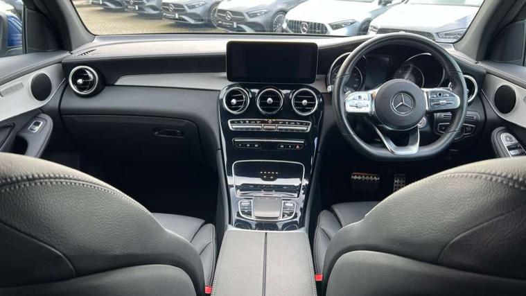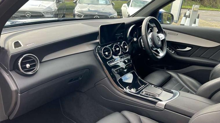 Active parking assist with parktronic system, Attention assist, Bluetooth interface for hands free telephone, Collision prevention assist plus, Cruise control with speedtronic variable speed limiter, Direct steer speed sensitive steering, DYNAMIC SELECT with a choice of driving modes (ECO, Comfort, Sport, Sport+ and Individual), Easy pack automatic powered tailgate, ECO start/stop function, Hard disk navigation, Hey Mercedes Voice activation, Instrument cluster with 5.5-inch TFT multi-function display, MBUX Interior assistant, Mercedes connect me with remote online services, Multi function trip computer, Outside temperature display, rear seatbelt status indicator, Remote and charging services plus, Remote boot release, Reversing camera, Service indicator (ASSYST), 1 x 3 pin domestic 8m straight charging cable, 1 x type 2 and 3 phase 4m straight wallbox cable, 4MATIC permanent four wheel drive, 50 litre fuel tank, 9G TRONIC plus automatic transmission with steering column gear selector, DIRECT SELECT steering wheel gearshift paddles, Diesel particulate filter, Sports suspension tuned for improved handling and driving dynamics, 5 speakers, Frontbass loudspeakers, MBUX multimedia system with DAB digital radio and touchpad, Media display 10.25-inch touchscreen display, Pre installation for Mercedes Benz Link, USB ports x 2 in centre console, Adaptive brake lights, Aluminium roof rails, AMG bodystyling - AMG front apron with sporty air intakes and chrome trim element, AMG diffuser-look rear apron with insert in black, Body colour door mirrors, Body coloured bumpers, Electric windows one touch open/close, Electrically adjustable and heated door mirrors, Front, side and rear exterior chrome trim, Headlamp assist automatic headlamp activation, LED high performance headlamps with integrated LED daytime running lights, LED tail lamp, Privacy glass with dark glass from B pillar backwards, Radiator diamond grille, Rain sensor windscreen wipers, Range adjustable headlights, Rear wiper, Tinted glass all round with single layer safety glass, Two chrome plated tailpipe trim elements, 2 way rear head restraints, 3-spoke multifunction sport AMG steering wheel in black nappa leather with flattened bottom section, chrome insert and perforated leather in grip area, 40:20:40 split folding rear seats, AMG floor mats with edging and embroidered AMG lettering, AMG sports seats, Artico man-made leather upper dashboard with contrast topstitching, Automatic child seat recognition sensor, Black roof lining, Dividing net - rear, Double cup holder in centre console, Easy-pack removable load compartment cover, Front armrest with storage box, Front door sills with Mercedes Benz lettering, Front head restraints, Front seats with electric adjust (backrest, height and seat cushion inclination) with 4 way electric lumbar support and manual cushion depth adjust, Heated front seats, Height/reach adjustable steering column, Illuminated and lockable glove compartment, Leather upholstery, Pre-entry climate control, Rear top tether child seat ISOFIX attachment, Sports pedals with stainless steel surfaces and rubber studs, Steering wheel with touch control buttons, THERMOTRONIC 3 zone automatic climate control, Interior lighting pack - GLC, Mirror pack - GLC, Storage pack - GLC, 3 rear 3 point seatbelts, Active bonnet, Adaptive brake system with HOLD function and brake drying in the wet, ASR, Black seat belts, Brake calipers with Mercedes-Benz lettering + perforated brake discs, Child proof door locks, Dual-stage airbags - driver and front passenger, driver knee bag and window bags for driver, front passenger and rear passengers, Electronic parking brake, Electronic stability programme (ESP) with curve dynamic assist and cross wind assist, Front and rear seatbelt reminder, Front passenger seat occupancy sensor, Hill hold function, Radar-based recuperation, Tyre pressure monitoring system, Warning triangle and first aid kit, Alarm system/interior protection/immobiliser, Automatic door locking, KEYLESS-GO starting function, Remote central locking, High gloss black with grained aluminium trim, 19" AMG 5 twin spoke alloy wheels painted tremolite grey with high sheen finish, Summer tyres, Tirefit tyre sealant kit,