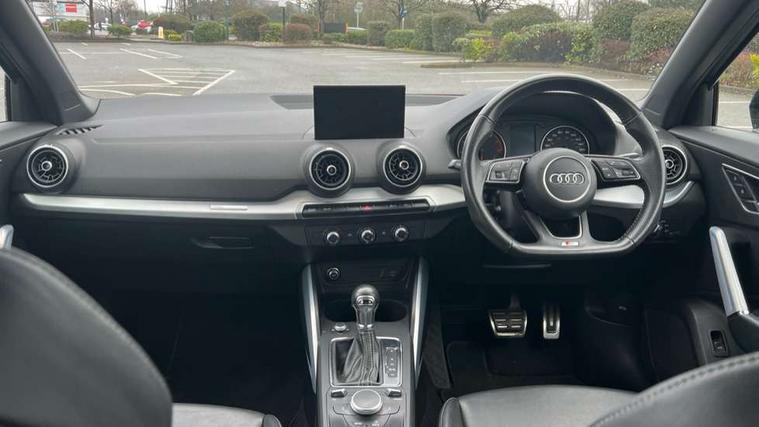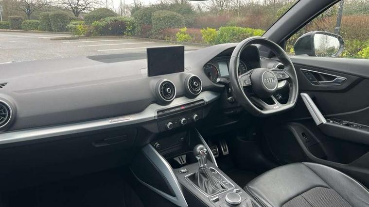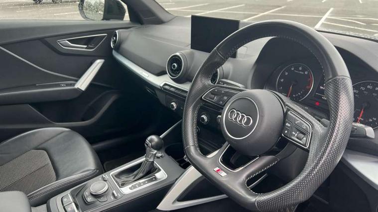 Audi drive select, Audi smartphone interface, Automatic start/stop system with recuperation, Bluetooth interface includes bluetooth audio streaming, Cruise control, MMI - Multi Media Interface control system, MMI SD card integrated nav with 3D map display, dynamic route guidance with TMC, MMI search, natural voice recognition and myAudi special destinations, Power operated tailgate, Progressive steering, Service interval indicator, Dynamic suspension, 2 x SDXC card reader, Audi music interface - apple iPod, apple iPhone, USB storage media, compatible MP3 players, 2 x USB charging points and 1 x Aux-in, CD Drive, DAB digital radio and AM/FM radio, MMI radio plus with 7" colour MMI screen and MMI controller, Black window trims, Bumper in full body colour paint finish, Chrome exhaust tailpipe, Electrically adjustable and heated door mirrors with integrated LED side indicators, Front and rear electric windows, Front underbody guard and rear diffuser trim in selenite silver, Front windscreen with grey tinted sunband, Headlight washers, Interior mirror, LED headlights with LED rear lights + dynamic rear indicators, LED indicator lights, Manual folding door mirrors, Rain and light sensors, Rear wiper, S Line badges on the front wings, S Line body styling - front and rear bumpers, side skirts, radiator grille, rear diffuser insert and front air intakes, 60/40 split folding rear seat bench, Black cloth headlining, Floor mats with contrast stitching, Front centre armrest, Front headrests, Front sport seats with S embossed logo, Height/reach adjust steering wheel, Illuminated door sill trims with S logo, ISOFIX child seat mounting for front passenger with airbag deactivation and outer rear seat including top tether attachment point for outer rear seats, Manual seat adjustment including seat height adjustment for front seats, Stainless steel pedals, Storage compartments - Glovebox, cupholder compartment in centre console, storage compartment in rear centre console, front and rear door pockets, Three rear headrests, Non smoking pack - Q2, 3x3 point rear seatbelts, 6 airbags - Front, curtain and front side airbags, Electromechanical parking brake, Electronic stabilisation control including ABS, ASR and EDL, Extended and proactive pedestrian protection, Hill hold assist, Multi collision brake assist, Pre-sense front with pedestrian recognition, Seatbelt monitoring, Tyre pressure warning light, Warning triangle and first aid kit, Anti theft alarm, Anti theft wheel bolts, Central locking system with remote control key, Electronically operated child locks, Aluminium interior element,