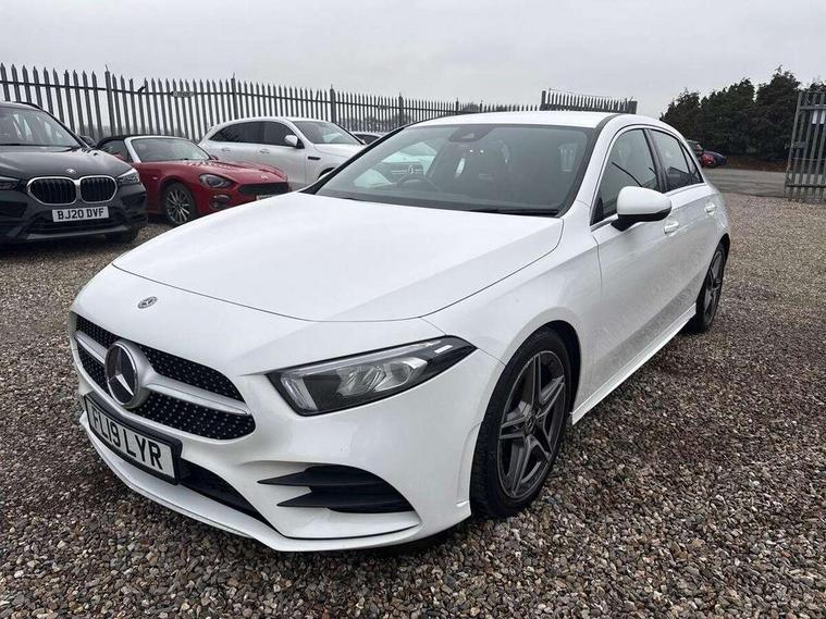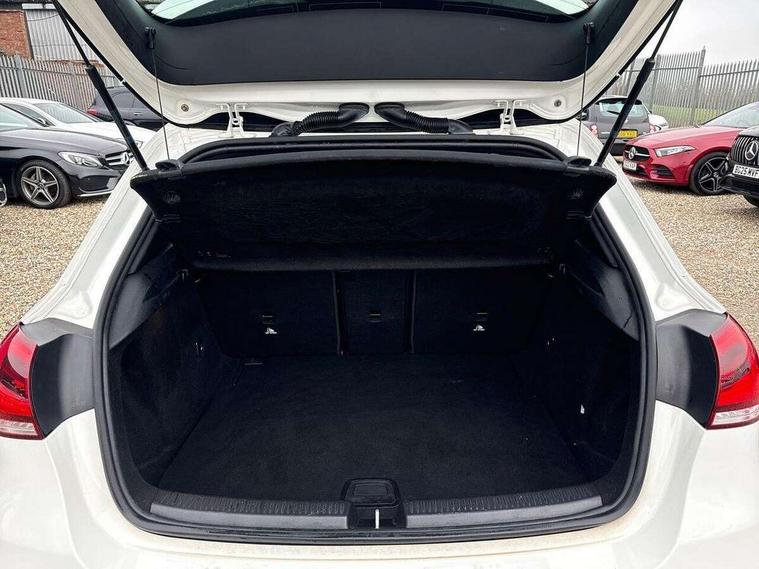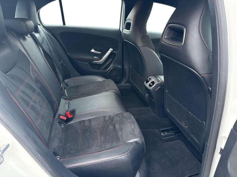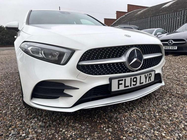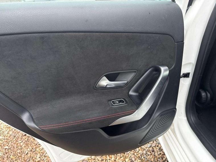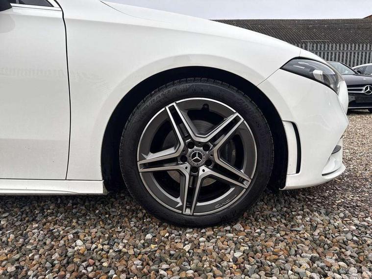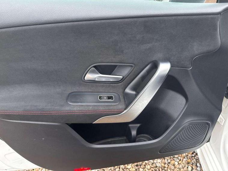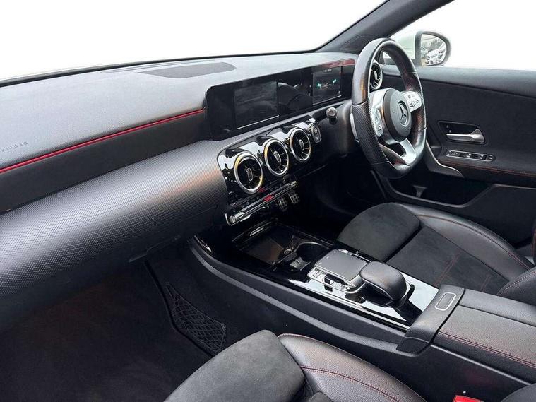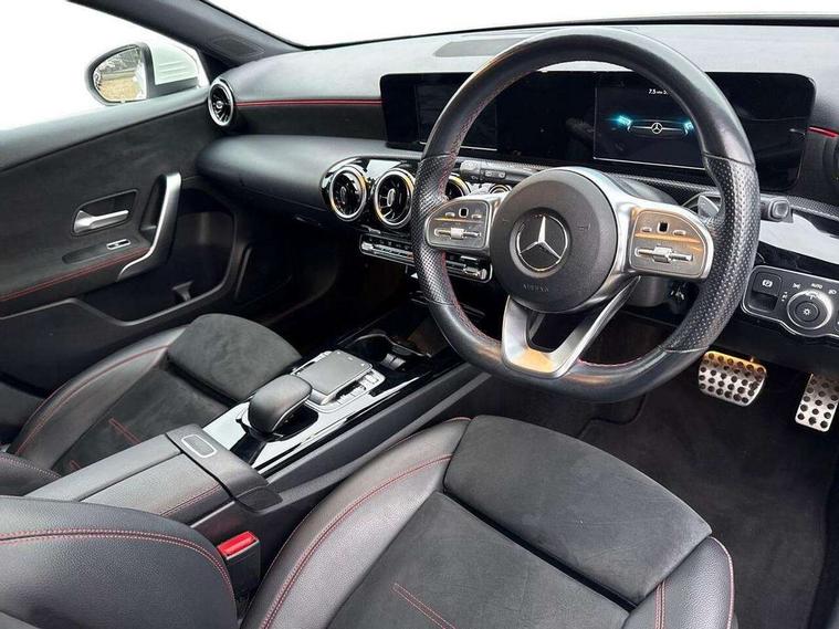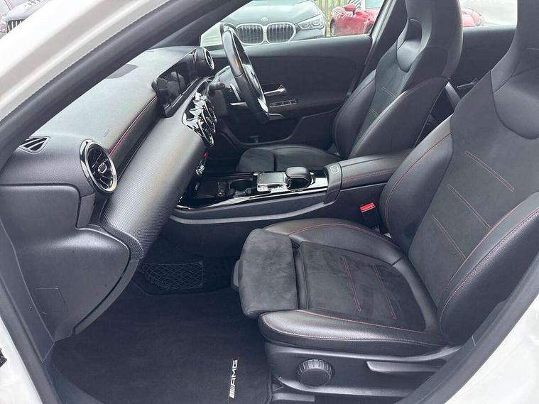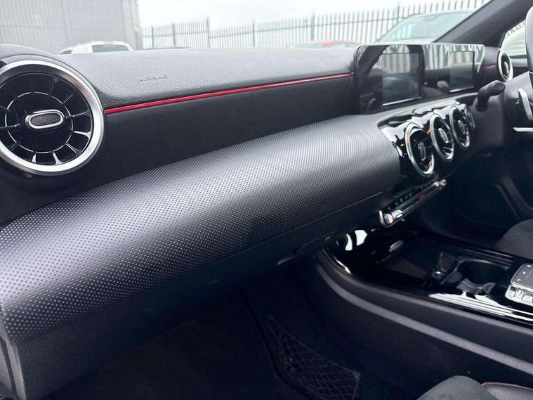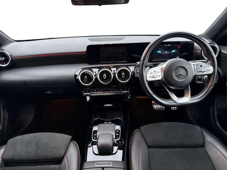 180 degree rear view camera with parking guidelines, 7" colour screen in instrument panel, 7" touchscreen media display, Active lane keep assist, Attention assist, Brake pad wear indicator warning light, Cruise control + speed limiter, Direct steering, Direction indicators with lane change function, DYNAMIC SELECT with a choice of driving modes (ECO, Comfort, Sport, Sport+ and Individual), Fluid level warning indicator for fuel, oil, coolant and washer fluid, Hard-disk navigation, Lamp failure indicator, Mercedes me connect including emergency call system, accident recovery, breakdown and maintenance management, Outside temperature gauge, Radio aerial integrated into roof spoiler, Service indicator (ASSYST), Speed sensitive power steering, Stop/start system, Trip computer, Voice activation, Lowered comfort suspension, DAB Digital radio, Dual bluetooth interface, 2 USB ports (type C), MBUX multimedia system with DAB digital radio and touchpad including satellite navigation, Adaptive brake lights, AMG front, rear apron and side skirts, Blue tinted glass, Body colour bumpers, Body colour door handles, Body colour side skirt, Body coloured door mirrors, Chrome beltline trim, Diamond radiator grille with chrome pins and silver louvre + chrome insert, Electric adjustable and heated door mirrors with integrated LED side indicators, Electric front windows, Electric rear windows, Exhaust system - Twin trapezoidal tailpipes in polished stainless steel, Headlamp assist automatic headlamp activation, Heated glass rear windscreen + timer control, LED high performance headlamps with integrated LED daytime running lights, LED tail lamp, LED third brake light, Rain sensor windscreen wipers, Rear fog lights, Rear wiper, 12V socket, 3 Spoke flat bottom leather multi function steering wheel with perforated leather in grip area, 40:20:40 split folding rear seats, Air vents surround and cruciform nozzle in silver chrome, AMG floor mats with red stitching, Artico man-made leather/Microfibre Dinamica upholstery with red contrast stitching, Auto Mercedes-Benz child seat recognition sensor, Black roof lining, Brushed stainless steel sports pedals with rubber studs, Controller on centre console with chrome surround, Cup holder and stowage compartment lighting, Front centre armrest with storage compartment, Front door sills with Mercedes Benz lettering, Front doors with ambient and signal light, Front footwell lights, Front reading lamps, Front seat backs luggage nets, Front seat cushion length adjustment, Front signal exit lamp, Front vanity lights, Gearshift paddles on steering wheel, Handle recess/closing light, Height/reach adjustable steering column, Illuminated glovebox, ISOFIX Child seat top tethers and anchor fixings, Load securing rings in luggage compartment, Luggage compartment cover, Manual height adjustable front seats, Oddments tray lighting, Rear head restraints, Rear Reading Lamps, Seat occupancy sensor for front passenger seat, Sports seats with integrated headrests, Storage compartment under load area floor, Sunvisors with illuminated vanity mirrors, Touchpad, Touchpad illumination, Twin front cupholders, Two zone thermotronic luxury automatic climate control, Seat comfort pack - A Class, 3 rear 3 point seatbelts, ABS with Brake Assist, Active bonnet, Active brake assist includes forward collision warning system with autonomous braking, Adaptive brake assist with hold function and hill start assist, Black seatbelts, Brake calipers with Mercedes-Benz lettering + perforated brake discs, Childproof locks manually operated for rear doors and electrically operated for rear power windows, Crash responsive emergency lighting, Driver and passenger head and side airbags, Drivers knee airbag, Dual stage driver/passenger airbags, Electronic parking brake, ESP curve dynamic assist, ESP with ASR, Front and rear seatbelt reminder, Tyre pressure monitoring system, Warning triangle and first aid kit, Window airbags, Alarm system/interior protection/immobiliser, Keyless Go, Remote central locking and crash sensor with emergency opening function, 18" AMG 5 twin spoke light alloy wheels in titanium grey with highsheen finish, Tirefit sealant kit,