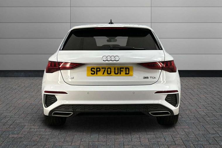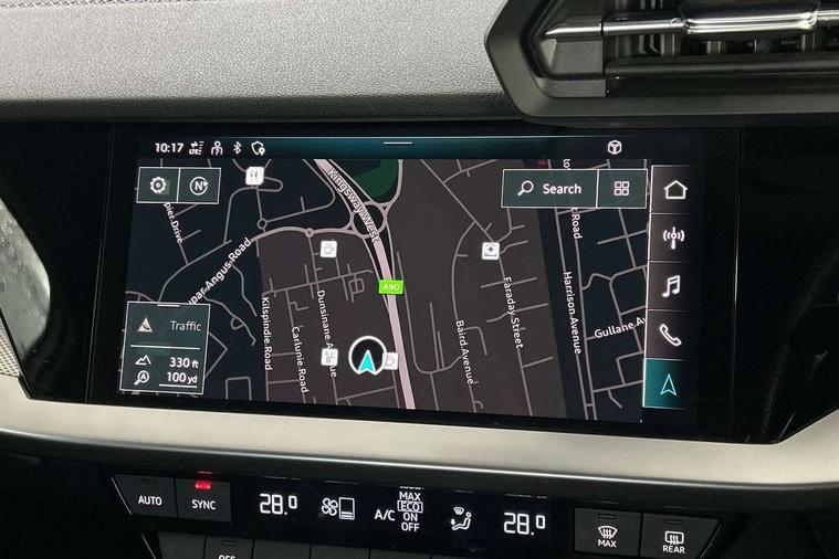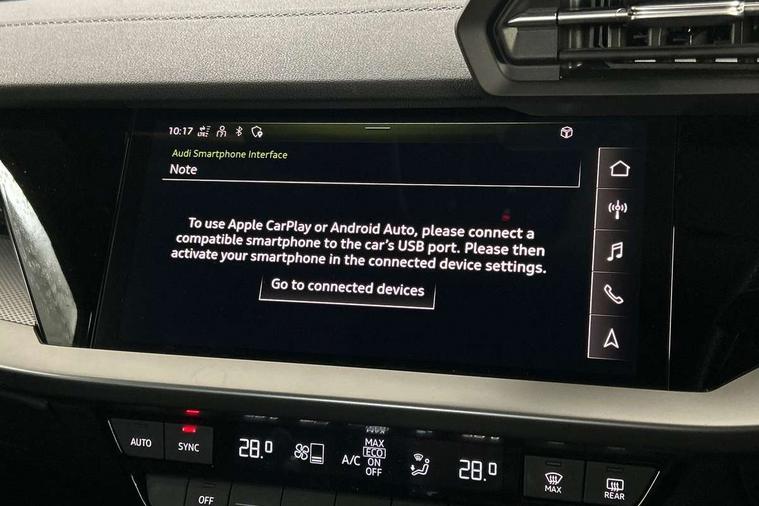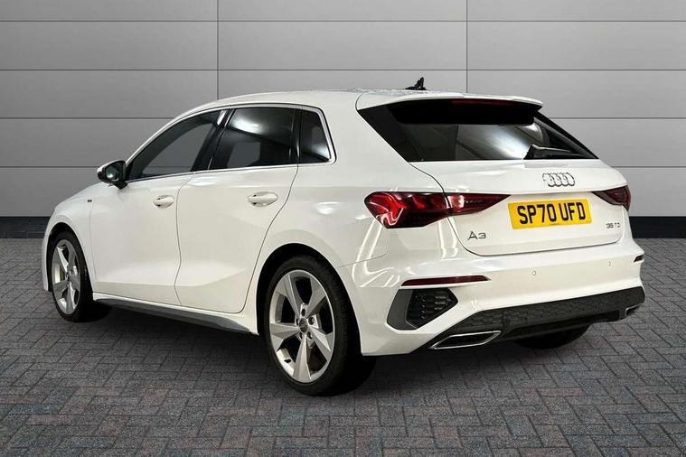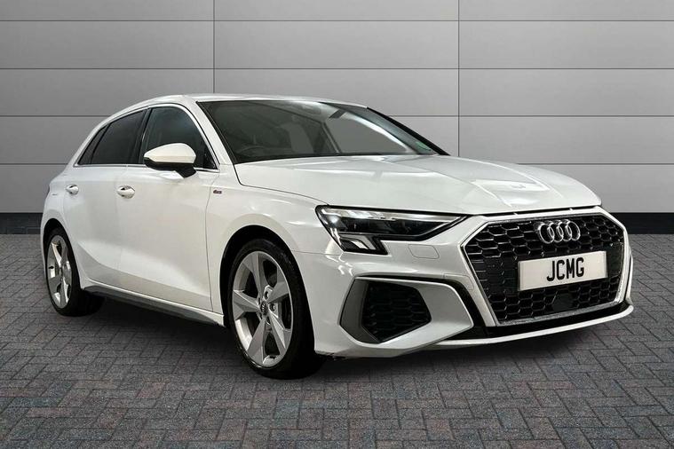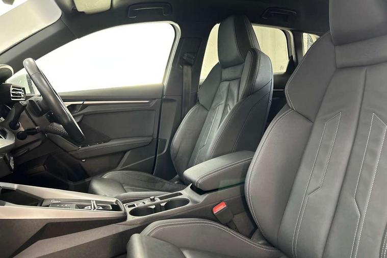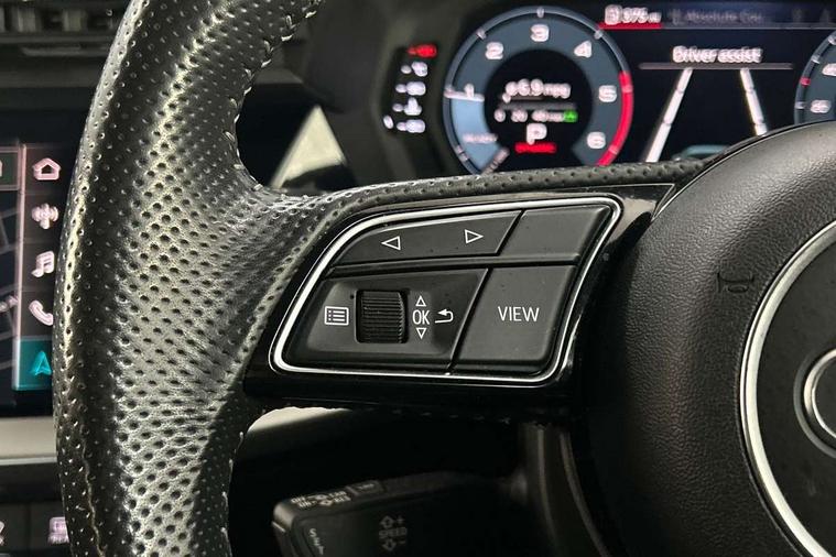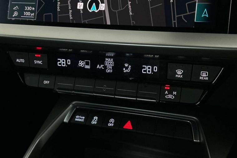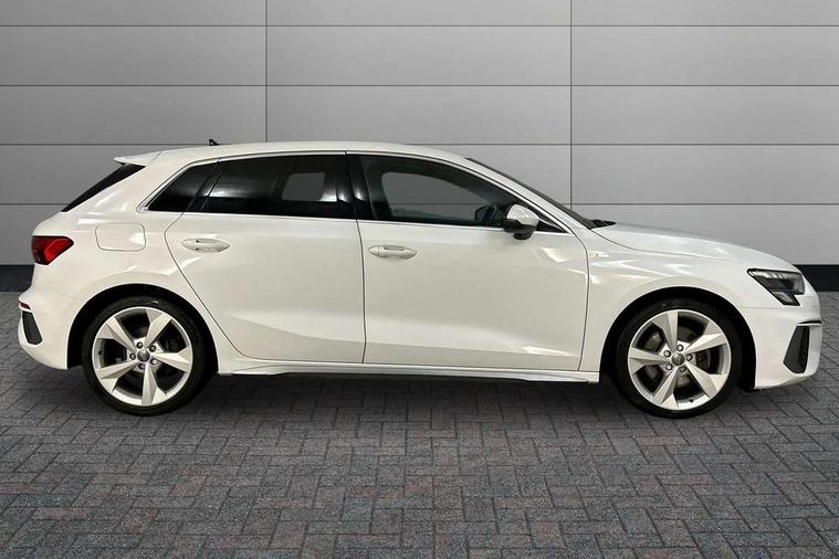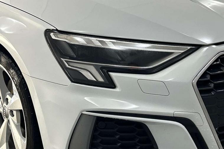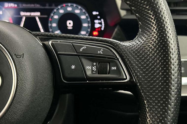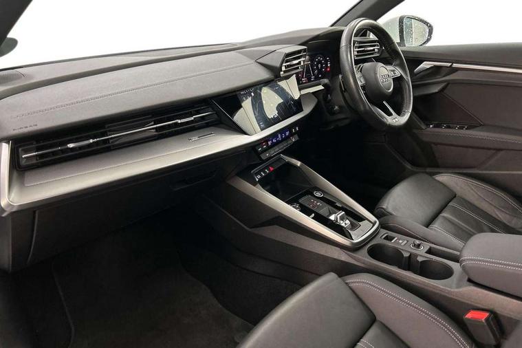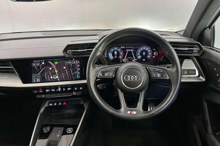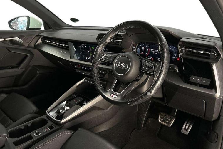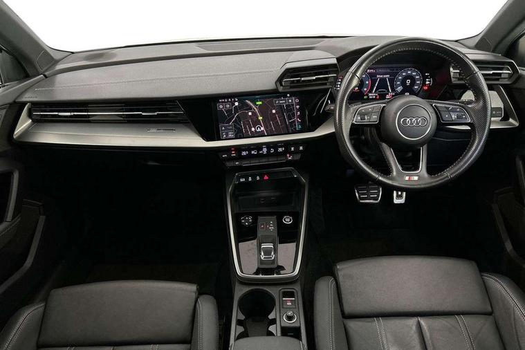 Audi connect emergency call and service, Audi drive select (Auto, Comfort, Dynamic, Efficiency and Individual), Audi smartphone interface, Audi Virtual Cockpit - 10.25" digital and colour instrument cluster, Automatic start/stop system with recuperation, Bluetooth interface, Collision avoidance assistant, Electromechanical power speed sensitive steering, Lane departure warning system, MMI Navigation Plus with high resolution 10.1" colour touch screen display, Service indicator, Trip computer, Voice control system with natural language interaction, 2xUSB-C connection with data and charging functions, 6 passive loudspeakers, DAB Digital radio, Acoustic glass windscreen, Aluminium window trim, Auto dimming frameless rear view mirror, Body colour exterior mirrors, Electrically adjustable/heated/folding/dimming door mirrors with kerb view includes integrated LED indications + kerb view function for passenger side, Front electric windows, Illuminated aluminium inserts front door sills with S logo, LED daytime running lights, Light and rain sensors, Privacy glass - dark tinted rear window, rear door and side windows, Rear electric windows, Rear side air outlets in grained matt black, Rear wiper, S line bumpers, S roof spoiler, 12V socket and storage compartment in front centre console, 40/20/40 split folding rear seat bench with cupholder, Black cloth headlining, Dual zone electronic climate control, Front and rear centre armrest in leather, Front and rear headrests, Front/rear floor mats, Height and reach adjustable steering wheel, Interior lighting - glove compartment light and right hand side, Luggage compartment floor covering, Manual boot compartment lid, Manually adjustable front seats, Seat side bolsters, Stainless steel pedals and front footrest, Twin leather upholstery with front sports seats S embossed logo, Aluminium interior elements pack - A3 Sportback, S line styling pack - A3 Sportback, 3x3 point rear seat belts, Driver and front passenger airbag with passenger airbag deactivation, Electronic Stabilisation Control (ESC) including ABS, ASR and EDL, First aid kit with warning triangle and 2 safety vests, Front side airbags with head airbags and interaction airbag, Hill hold assist, Pre-sense front with pedestrian and cyclist detection, Seatbelt monitoring, Tyre pressure loss indicator, Anti theft alarm, Anti-theft wheel bolts, Electronically operated child lock, Immobiliser, Remote control central locking, Accent surfaces in the dashboard and centre console in platinum grey silk effect paint finish, Dark spectrum aluminium inlays,