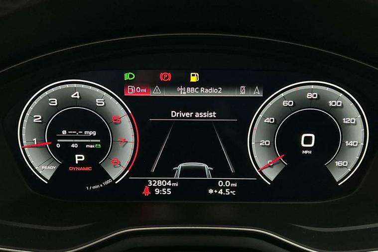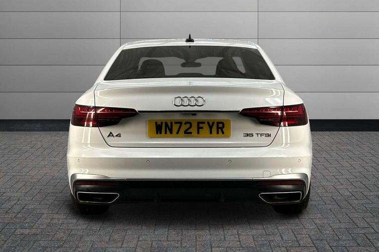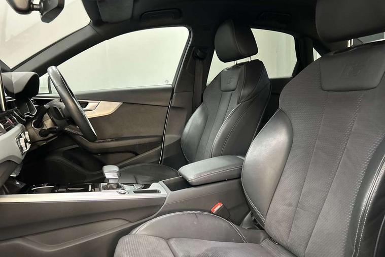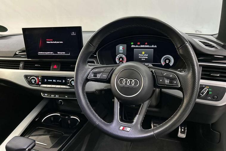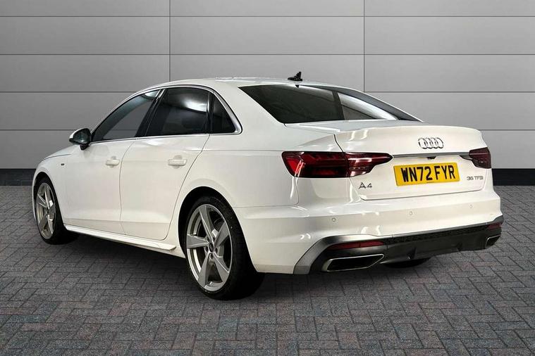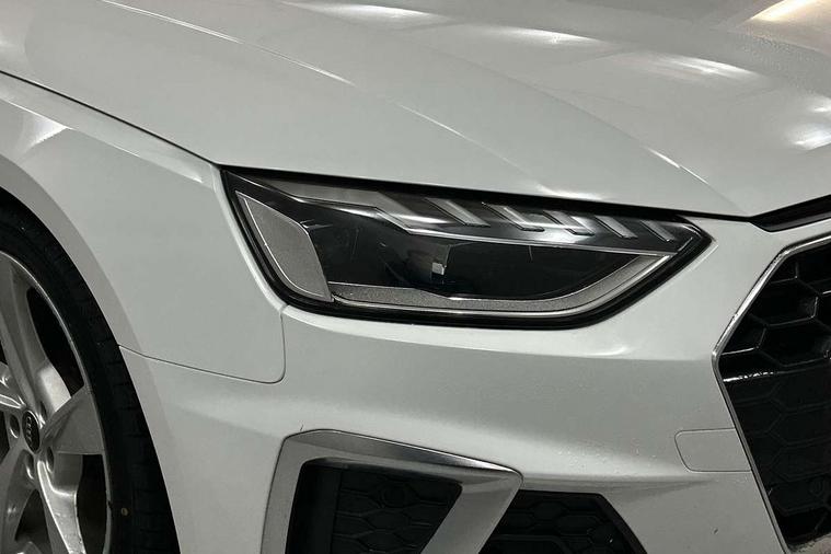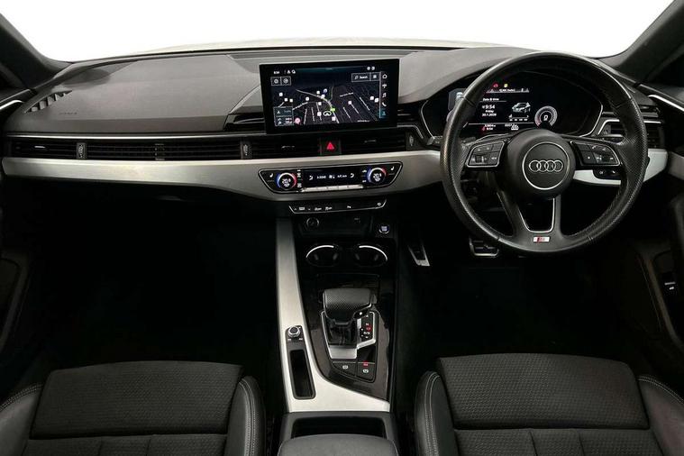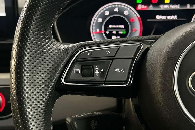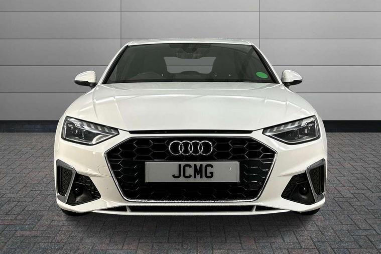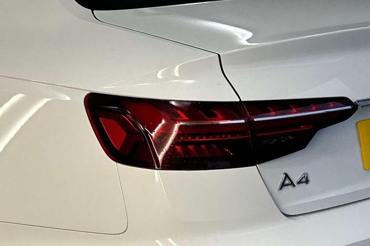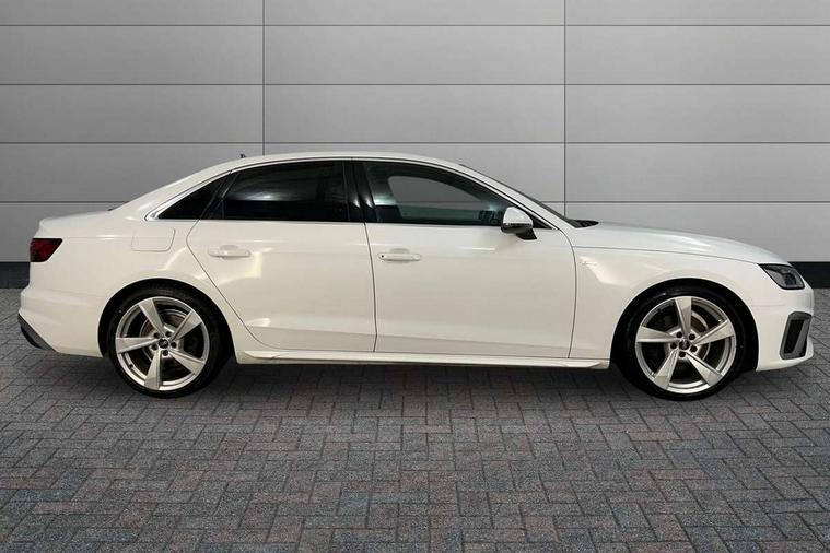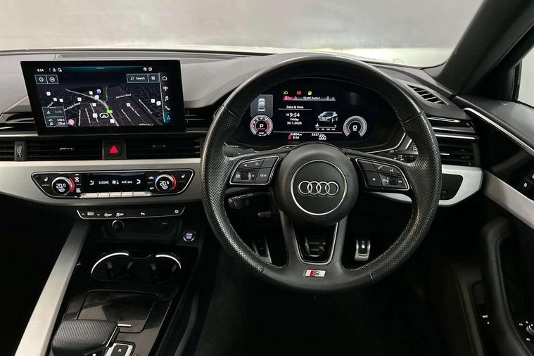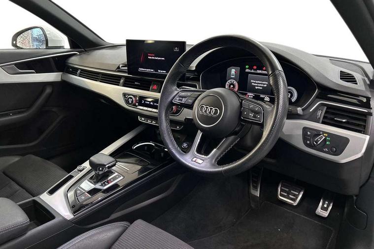 Audi connect safety and service (e-call), Audi connect with Amazon Alexa Integration, Audi drive select, Audi smartphone interface, Audi virtual cockpit, Automatic start-stop system with coasting functionality and efficiency programme, Bluetooth interface, Electric boot lid release, Electromechanical power steering, Email, calendar and text messages displayed via MMI, MMI Navigation plus with MMI touch includes 10.1" high resolution colour MMI display, 3D map, Voice control system, 54 litre fuel tank, Sports suspension lowered by 23mm, 2 USB charging ports, 8 passive loudspeakers, DAB digital radio reception, Auto dimming rear view mirror, Body colour door handles, Body colour front spoiler lip, Body colour side sill trim, Body coloured door mirrors, Electrically folding auto dimming/adjustable/heated door mirrors with LED side indicators and kerb view function for passenger side, Grained matt black side air inlets with matt aluminium silver inlay, High beam assistant, Honeycomb structure radiator grille in grained matt black, LED headlights with LED rear lights + dynamic rear indicators + headlight adjustment and high beam, turning light + LED daytime running lights, LED third brake light, Matt aluminium silver tailpipe trim, Privacy glass, Rain and light sensors, Rear boot, Rear side wing doors, S Line badges on the front wings, S line front and rear bumpers with side skirts, S Line rear diffuser in matt titanium black with trim strip in matt aluminium silver, Variable intermittent front wash/wipe, Windscreen with acoustic glazing, 4 way electric lumbar support for driver and front passenger, 40/20/40 split folding 3 rear seat bench in 3 parts with rear centre armrest, Black cloth headlining, Black perforated leather gearknob, Contrast stitching on seats, steering wheel and gear lever gaiter, Deluxe 3 zone electronic climate control, Door sill trims with aluminium inlay, Front and rear head restraints, Front centre armrest, Heated front seats, Illuminated door sill trims with S logo, ISOFIX child seat mounting and top tether, Manual seat adjustment, Single front passenger seat, Stainless steel pedals and foot rest, Tool kit, High gloss package - A4, LED Interior light pack - A4/S4, 3 rear seatbelts, 6 airbags - Driver, front passenger, curtain and side windows, Electronic Stabilisation Control (ESC) including ABS, ASR and EDL, Hill hold assist, Multi collision brake assist, Pop-up bonnet for pedestrian protection, Pre sense city, Rear door child safety locks, Seatbelt monitoring, Warning triangle and first aid kit, Anti theft alarm, Anti theft wheel bolts, Central locking, Keyless Go, Matt brushed aluminium inlays, Tyre repair kit,
