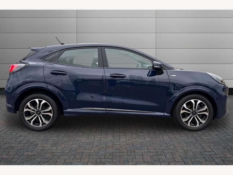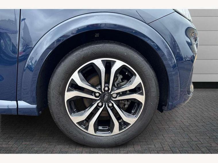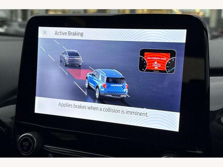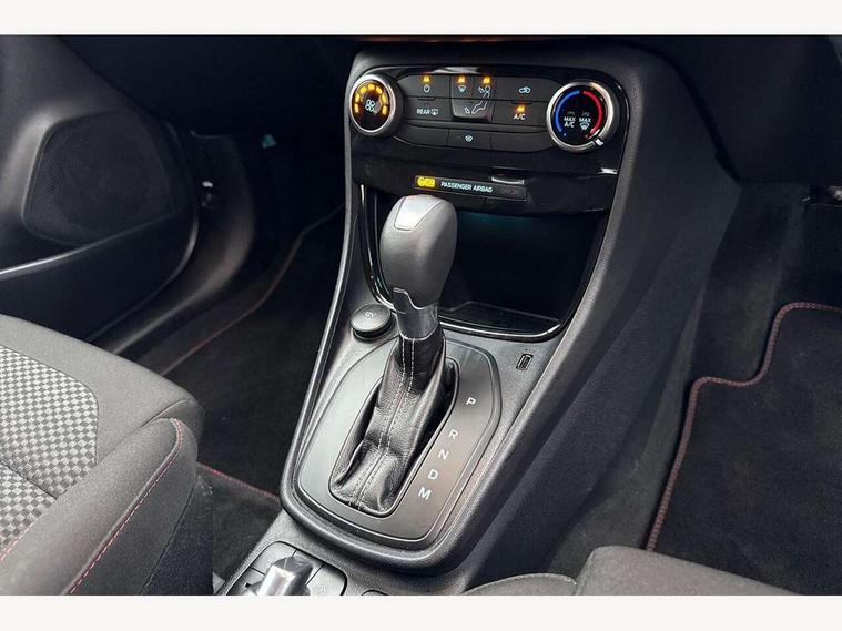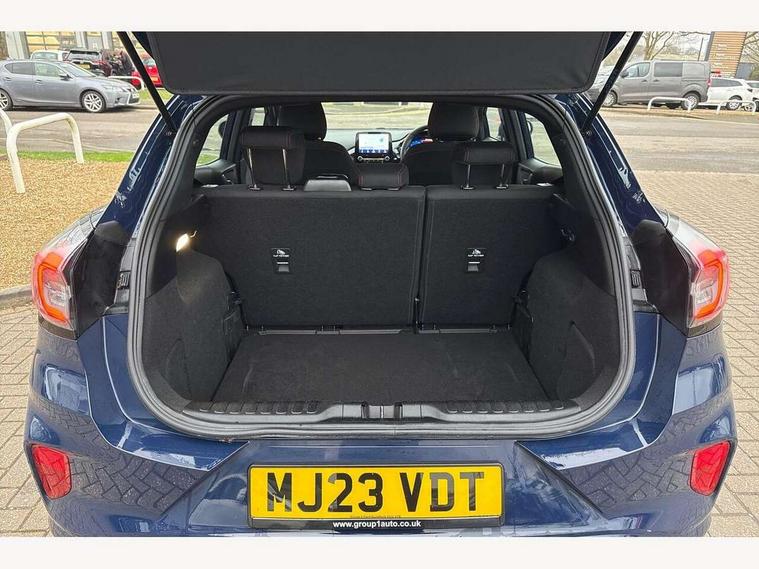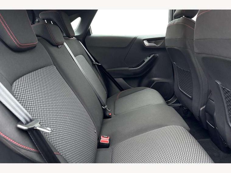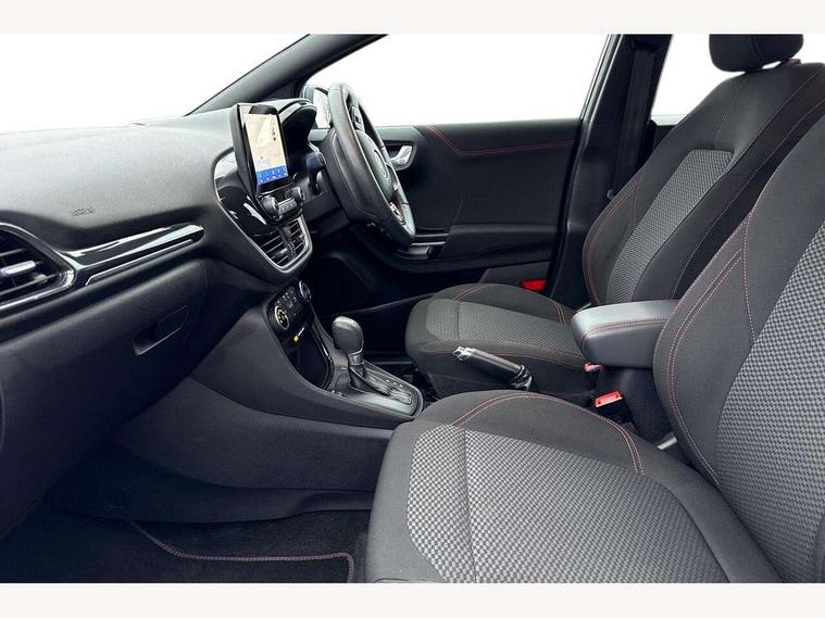 Driver impairment monitor, Emergency call service, Ford easy fuel, Full digital 12.3" instrument cluster, Lane keeping aid with lane departure warning, Power assist steering, Power start button, Rear parking sensor, Selectable drive modes(Normal, Eco, Sport, Slippery and Trail), Speed sign recognition, Sport suspension, Automatic headlights with auto high beam, Automatic rain sensing wipers, LED rear lamps, Power foldable heated door mirrors with puddle lamps, Projector headlamps with LED day time running lights and front fog lamps, Quickclear heated windscreen, Rear side wing doors, Rear wiper, ST-Line body styling kit with unique grille and large body colour rear spoiler, Third brake light, 3 seat bench in 2nd row, Centre console with armrest and stowage, Ford megabox extended bootspace, Front and rear head restraints, Front floor mats, Manual 2 way passenger seat adjustment, Manual 4 way driver seat adjust with lumbar adjustment, Single front passenger seat, ST- Line cloth trim with red stitching, ST-Line flat bottomed sensico leather steering wheel with leather handbrake and aluminium gear knob, Ford SYNC 3 navigation pack - Puma, 3 rear seatbelts, Child safety lock, Electronic stability control (ESC) and hill start assist, Pedestrian/cyclist detection & post-collision braking, Pre collision assist system, Tyre pressure monitoring system (TPMS), Thatcham alarm,