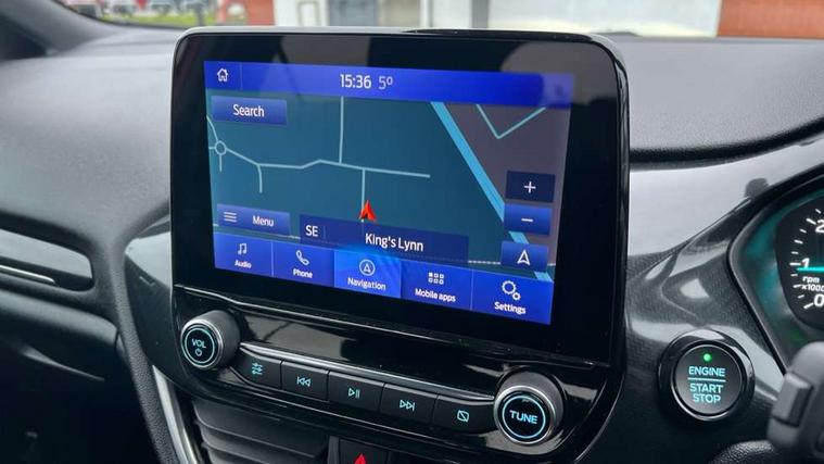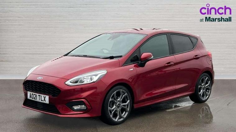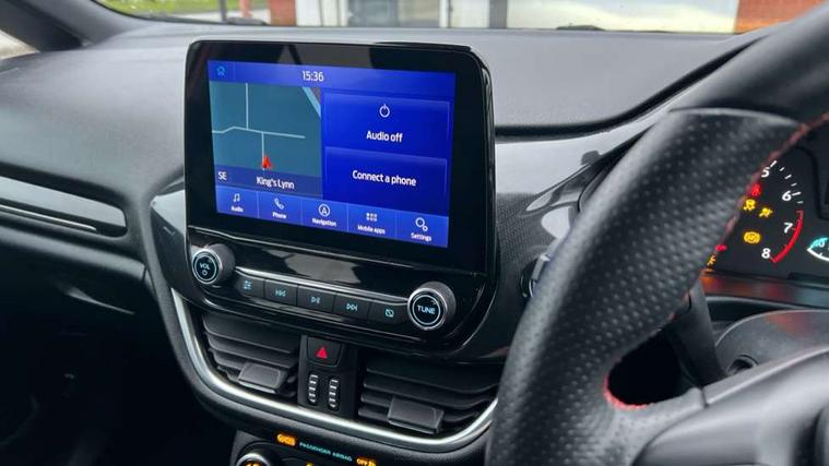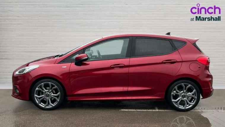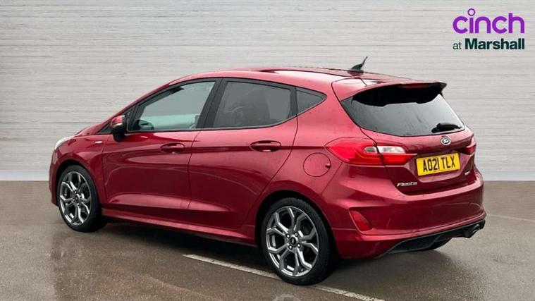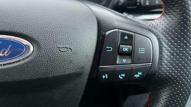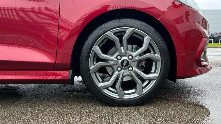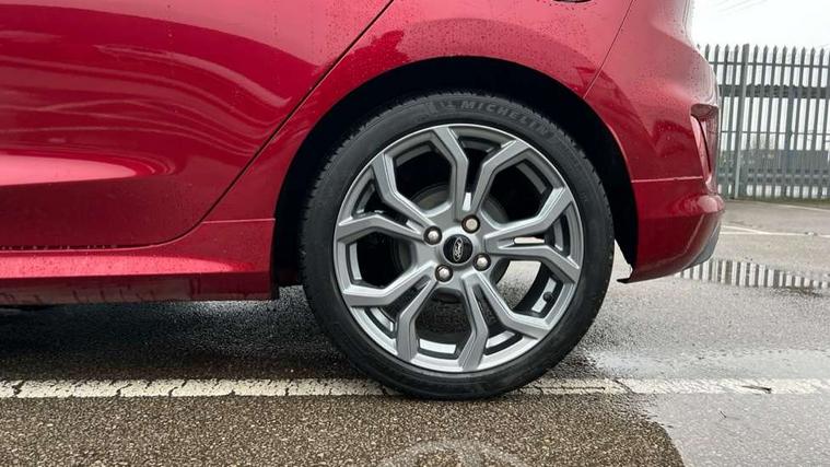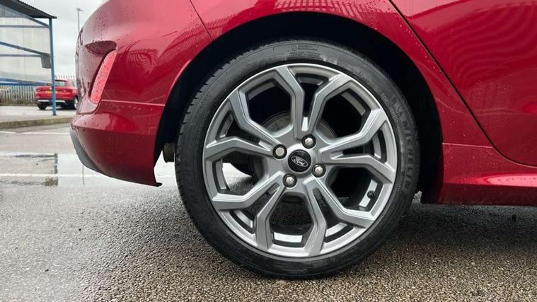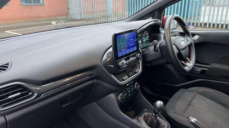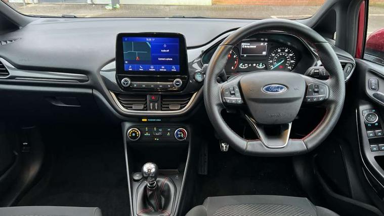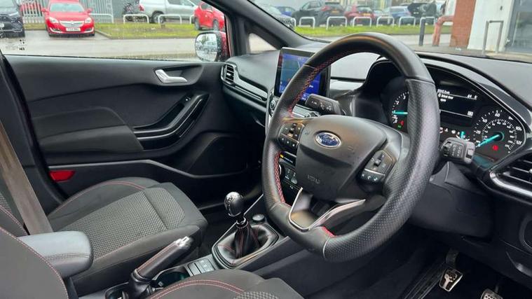 NCAP Pack - Fiesta, 17" 5 spoke alloy wheels with rock metallic finish, Keyless start with 'Ford Power' starter button, MyKey system, Remote central locking & engine immobiliser, Thatcham Cat.1 alarm, 2 USB ports, Auxiliary input socket, DAB Digital radio, Steering wheel mounted controls, 3 point seatbelts on all rear seats, ABS+EBA, Curtain airbags, Driver and passenger airbags, Drivers knee airbag, Electronic stability control with hill start assist, Front passenger airbag deactivation, Front side airbags, Seatbelt warning, Two tone horn, Tyre pressure monitoring system, Body colour bumpers, Body colour door handles, Body colour large rear spoiler, Body coloured electrically operated and heated door mirrors with side indicators, Cornering front fog lights, Electric front windows/one touch facility, Electric rear windows, LED Night signature to rear lights, Quickclear heated windscreen, Rain sensing wipers and auto dimming rear view mirror, Rear privacy glass, Rear wiper, Unique ST-Line upper grille & full bodystyling kit with ST-Line wing badges, 3 spoke flat bottomed leather steering wheel, 60/40 split folding rear seat, Adjustable head restraints, Black headlining, Boot carpet, Centre console with opening armrest, 2x cupholders, 12v and USB, Chrome inner door handles, Cloth upholstery, Footwell illumination, Front floor mats in velour, Front map reading lights, Front seatback pockets, Illuminated glovebox, Leather gaiter, Load area light, Manual 2 way passenger seat adjust, Manual 4-way driver seat adjust, Manual air conditioning, Overhead console with sunglasses holder, Pollen filter, Rake/reach adjustable steering wheel, Sensico wrapped steering wheel, Sports front seats, Bluetooth system, Electric power steering, Ford easy fuel, Ford SYNC 3 Navigation system incl 8" touchscreen, 7 speakers, FordPass connect, Apple carplay, android auto, voice control and emergency assistance, Rear parking distance sensors, Selectable drive modes (Normal, Sport, Track), Trip computer, Sports suspension,