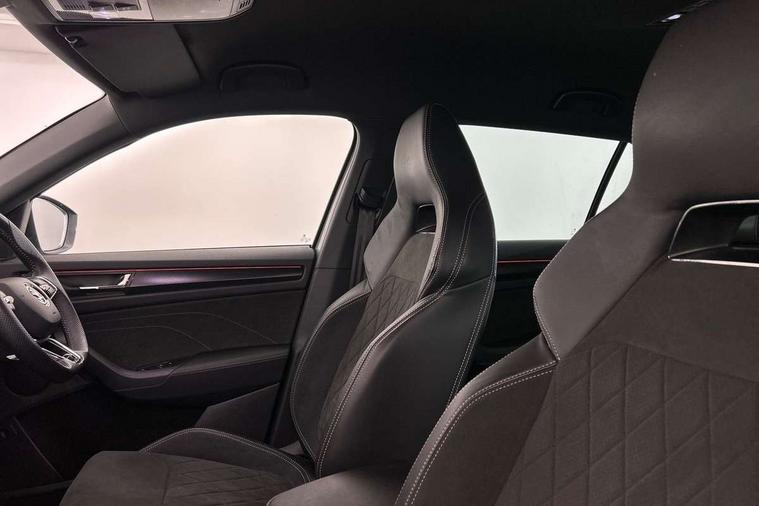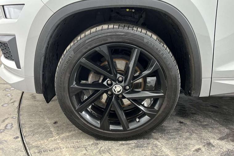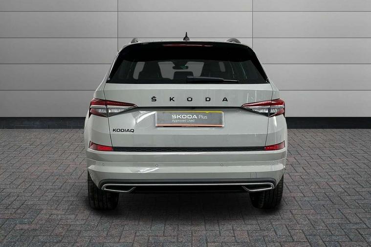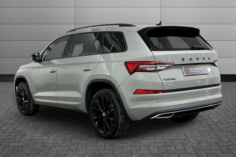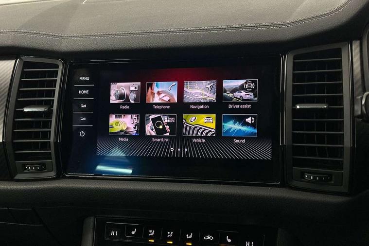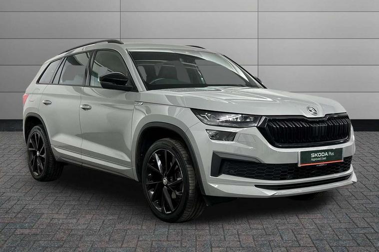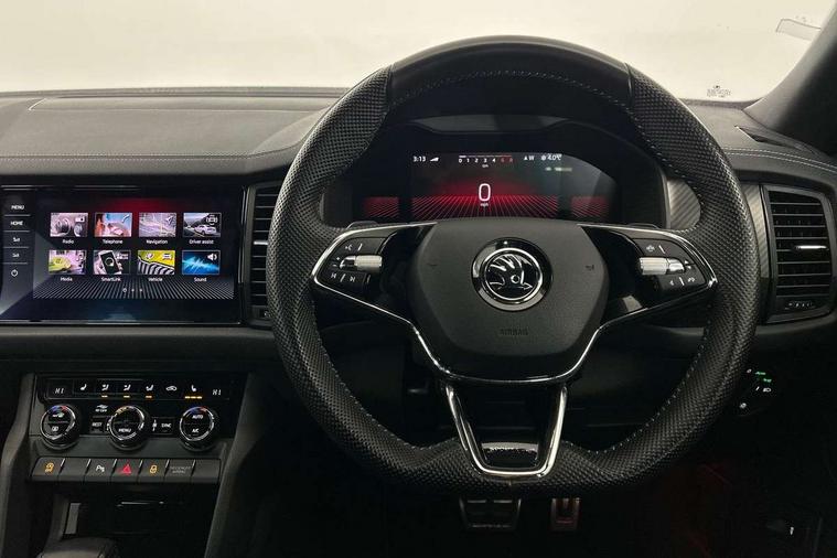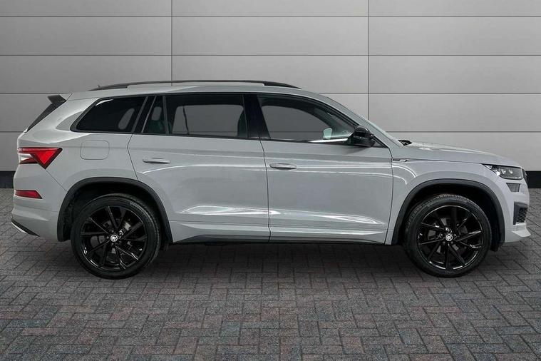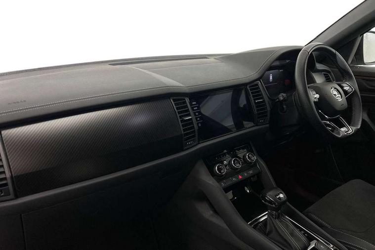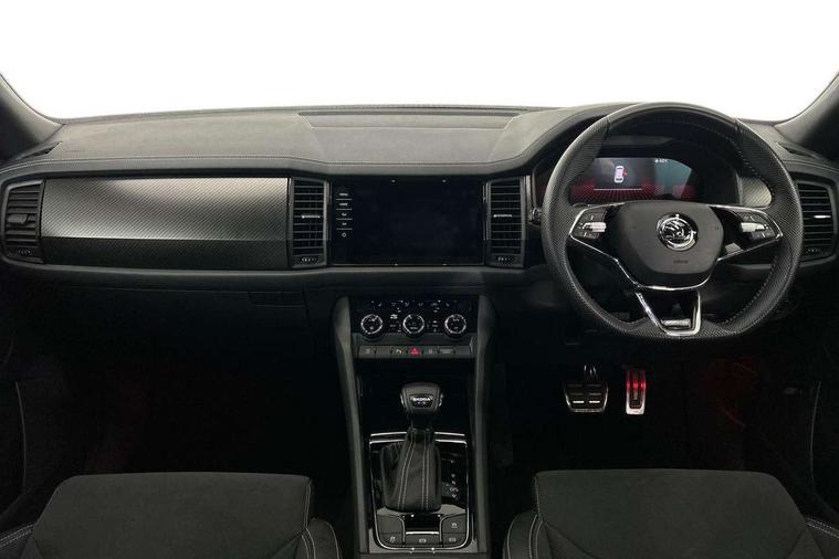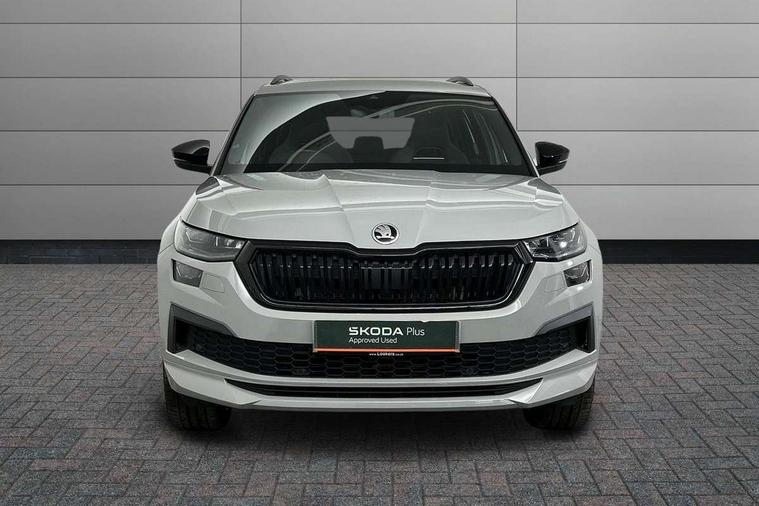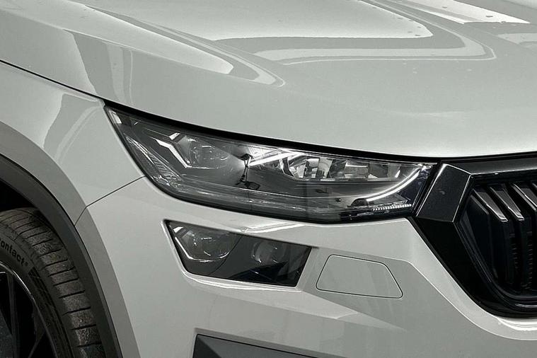 Bluetooth system, Columbus satellite navigation with 9.2" touchscreen, integrated Wi-Fi, web radio, Digital voice enhancement, E-call, ECO Stop/start function, Exterior temperature indicator, Progressive steering, Rear view camera, Smartlink wireless for apple carplay and wired for android auto, Speed limiter, Tailgate unlocking from outside, USB C Port x 2 in front centre console, Wireless charging, 8 Speakers, DAB Digital radio, Aero front windscreen wipers with intermittent function, Aero rear window wiper, Auto dimming rear view mirror, Black roof rails, Black sports styling including front grille and window surrounds, Black wheel arch surrounds, Body colour bumpers, Body colour door handles, Electric adjustable/heated/folding door mirrors, driver side auto dimming with boarding sports and memory function, Electric front and rear windows, Extended rear spoiler with finlets in gloss black, Front fog lights, Full LED matrix headlights with AFS (adaptive front light system), cornering function and AWL (all weather lighting system), Gloss black door mirrors, Headlight washers, Heated rear window, Invisible tailpipe, LED daytime running lights, LED rear fog light, LED third brake light in rear spoiler, Light assistant (coming/leaving home/tunnel light), Off-road style lower front bumper element, Privacy glass, Rain and light sensors, Rear diffuser, Rear LED lights (high functionality) with welcome effect and dynamic indicators, Rear side wing doors, Safety reflectors on front and rear doors, Sportline badge on front fender, Sports front and rear bumpers including lower rear chrome strip, Tailgate lettering in Black, Window control switches with black trim, 12V socket in boot, 2 rails with 2 hooks, 2 seat bench in 3rd row, 3 seat bench in 2nd row, 4 foldable roof handles with rear coat hooks, 60:40 foldable rear seat with sliding adjustment and backrest angle adjustment, Aluminium pedals, Black roof headlining, Bottle holders in door panel in the 1.5 litre front and 1 litre rear, Cargo storage compartments, Chrome headlight control button, Chrome interior door handles, Coat hooks on B pillar, Covered storage compartment on driver side, Front centre armrest with storage compartment, cup holder and 12V socket, Front courtesy lights, Gear shift lever with chrome frame and black gloss insert, Grey stitching in front and rear armrests and door armrests + door inserts, Height adjustable front headrests, Illuminated and cooled glovebox, Illuminated luggage compartment, Isofix child seat fittings in outer rear seats with top tether, Manually adjustable steering column, Microsuede door panels, Net programme in boot (1x horizontal Net, 2x vertical Nets), Overhead glasses storage compartment, Pollen filter, Rear centre armrest with cupholders, Single front passenger seat, Sliding trunk cover, Small Bags on the inner sides of the front backrests, Sports seats, Sunvisors with illuminated vanity mirrors, Three rear height adjustable headrests, Ticket holder on A Pillar, Umbrella in door panel, Variable boot floor, LED Interior light pack - Kodiaq, Auto door release and activation of warning lights in the event of an accident, Child locks on rear doors, Driver and front passenger airbag with knee airbag and front passenger airbag deactivation, Electronic parking brake with hill start assist, Emergency rear braking signal, ESC (incl. ABS+MSR+ASR+EDS+HBA+DSR+RBS+MKB), Front assist with autonomous emergency braking, Front side airbags with curtain airbags, Fuel cut off safety device, Height adjustable front 3 point seatbelts + pretensioners, Hill hold control, Rear disc brakes, Safety vest holder in door, Seat belt reminder for all seats, Three point rear seat belts, Two tone horn, Tyre pressure monitor, Alarm with interior monitoring and tilt sensor with safe function, Anti-theft wheel bolts, Immobiliser, Keyless entry and start system (KESSY), Remote central locking with 2 keys, Black air vent surround, Carbon finish dashboard and door inserts, Grey stitching in dashboard, 20" Vega Anthracite alloy wheels, Temporary spare wheel (space saver),