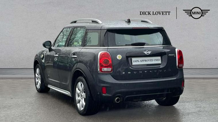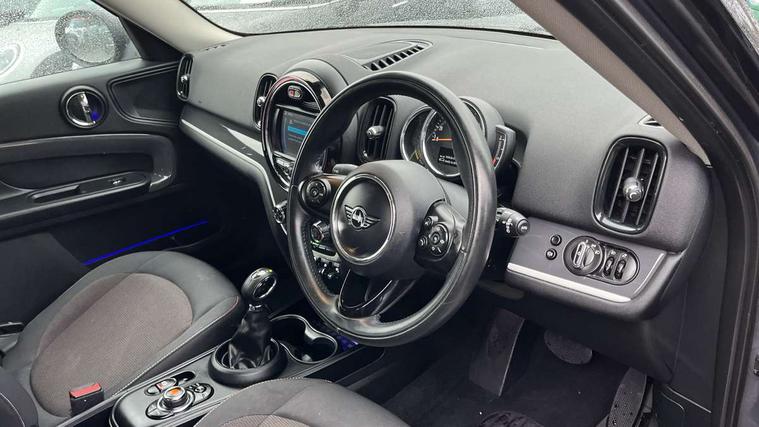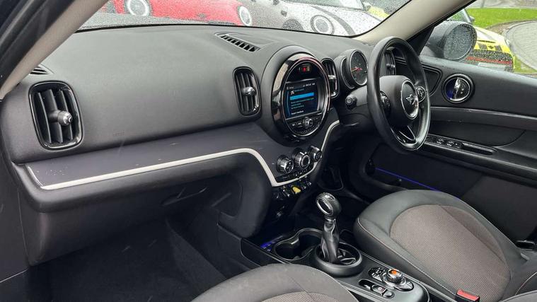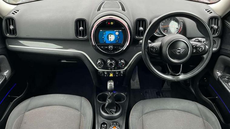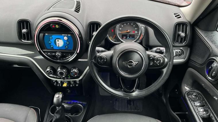 Apple CarPlay preparation, Brake pad wear indicator warning light, Central display with LED ring and 6.5" colour touch screen, Connected driver, DTC - Dynamic traction control, eDrive Services, Exterior temperature gauge, Intelligent emergency call, MINI Driving Modes - centre toggle switch to control driving setting (sport, mid and green), MINI remote services, MINI TeleServices, Navigation system, On board computer, Personal Profile, Real time traffic information, Service interval indicator, Servotronic speed sensitive power steering, Electronic differential lock, Performance Control, Auxiliary input socket, DAB digital radio module, MP3 compatible radio/single CD player, Radio visual boost, Anti dazzle rear view mirror, Body colour scoop integrated into engine- compartment lid, Chrome door handles, Chrome exhaust tailpipe, Chrome headlight surround, Chrome plated radiator grille, Chrome side scuttle, Chrome window surround, Electric front windows + one touch + anti-pinch, Electrically adjustable door mirrors, Follow me home headlights, Green tinted glass, Heated door mirrors/heated windscreen washers, Heated rear window with automatic switch off, Metal look door sill finishers, Rain sensor including auto headlights activation, Rear wiper, Roof spoiler, White indicator lights, 12V power point front, 2 cupholders in front centre console, 4 lashing points to secure luggage, 40:20:40 split folding rear seats, Centre console storage box, Charging cable, Chrome interior door handles, Driver/passenger sunvisors, Front and rear headrests, Front interior light, Front passenger grab handle, Front seat backrest storage nets, Heater with recirculation function, Height/reach adjust steering wheel, Isofix rear child seat preparation, Luggage compartment lighting, Multifunction steering wheel, Rear grab handles, Sensatec gearshift and handbrake, Storage compartments in doors, Toolkit in luggage compartment, Under floor storage in luggage area, Interior lights pack - Countryman, MINI Excitement Pack - Countryman, 3 point automatic seatbelts, 3 point seatbelts on all rear seats, ABS, Cornering brake control (CBC), Crash Sensor - activates hazard/interior lighting + unlocks doors, Driver and passenger airbags, Driver and passenger side airbags, DSC - Dynamic Stability Control, Electronic brake force distribution, Electronic parking brake, Front curtain airbags, Front passenger airbag deactivation, Fuel cut off safety device, Hill start assist, Pyrotechnically pre-tensioned front seatbelts, Tyre pressure warning, Automatic door locking, Keyless start, Locking wheel bolts, RF remote control central locking, Second remote key, Thatcham category 1 alarm + immobiliser,
