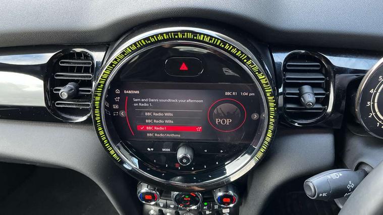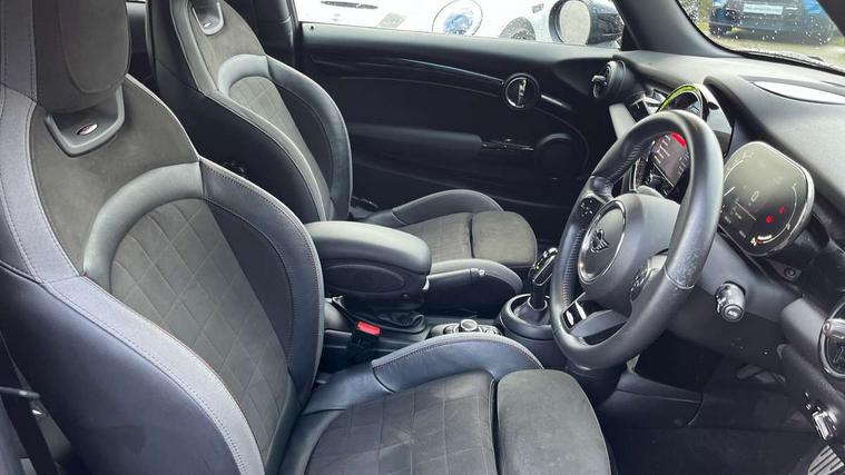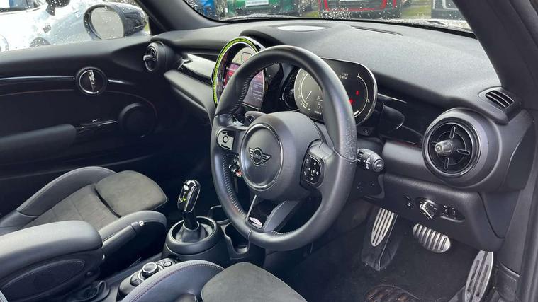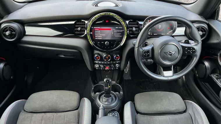 Automatic start/stop function with brake energy recuperation, Compatible mobile phone bluetooth with audio streaming, Cruise control with brake assist, Electro-mechanical speed dependant steering assistance, Flexible car sharing preparation, Instrument cluster, MINI Driving Modes - centre toggle switch to control driving setting (sport, mid and green), Mini E-call, MINI TeleServices, On board computer, Rear park distance control, Service interval indicator, Adaptive suspension, Double Vanos system, Fully variable valve control, High precision injection, Performance Control, Steptronic sport transmission with double clutch and steering wheel paddles, 4 speakers in front door trims and underneath front seats, 8.8" touchscreen with LED ring, FM tuner and DAB digital radio, Automatic headlight activation switch, Bonnet scoop, Dynamic brake lights, Electric front windows, Heated rear window, Heated windscreen washer jets, JCW Aerodynamic kit - Front and rear bumpers with sporty JCW styling and part-painted side sills with MINI John Cooper Works door sill finishers, John Cooper Works rear spoiler, LED headlight with closed ring and daytime driving lights, Metal door sill strips with Cooper S, Model logo Cooper S on right of tailgate, Radiator grille chrome border with honeycomb structure including S Badge, Rain sensor window wipers, Rear fog lights, Rear LED lights with union jack design, Rear window wiper, Side scuttle panel with integrated indicator, Sun/heat protection glass, Two central exhaust tailpipes with chrome finisher, White indicator lenses, 12V Accessory socket in centre console, 4 lashing eyes in luggage compartment, 60/40 split folding rear seat, Anthracite headliner including grab handles and clothes hooks, Carbon black colour line - Knee roll and door armrest, Chrome interior highlights, Cupholders, Front and rear isofix with front passenger airbag deactivation, Glove compartment, Height and length steering column adjustment, Interior lighting with 12 different colours across the dashboard, underneath door bezel with illuminated laser-engraved design on central display, JCW Sport seats with integrated headrests, adjustable thigh support and John Cooper Works logo, Leatherette gearshift lever and handbrake gaiters, LED reading lights, vanity mirror lights, front foot well light and spotlight on front seats, Manual air conditioning, Mechanical seat adjustment - forward/back & backrest for front seats and driver seat height adjust, Multifunction steering wheel, Passenger seat height adjuster, Storage compartments in doors, Storage pocket on back of front seats, Sunvisors with vanity mirrors, Tool kit, Velour floor mats, Walknappa leather steering wheel with grey seam and John Cooper Works badge on Piano Black lower steering wheel spoke, Piano black exterior pack - Mini Hatchback Cooper S, 3 point seatbelts on all four seats, 6 Airbags - front, side, head and seat belt tensioners, Anti-lock braking system (ABS), DSC - Dynamic Stability Control, Front and rear disc brakes, Two tone horn, Tyre pressure monitoring system, Alarm system with tilt sensor, monitoring doors, bonnet interior and tailgate, Electronic vehicle immobiliser, Start/stop toggle with keyless go, Piano black interior trim,