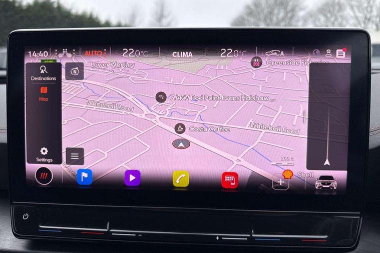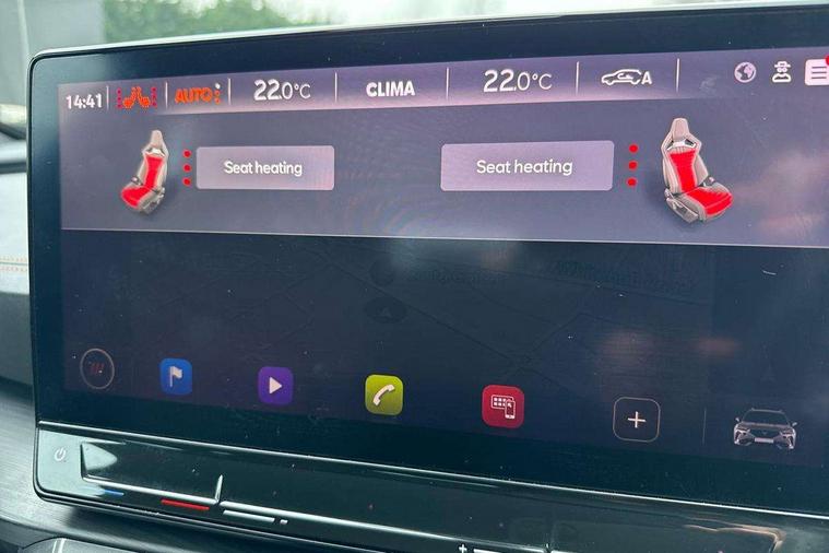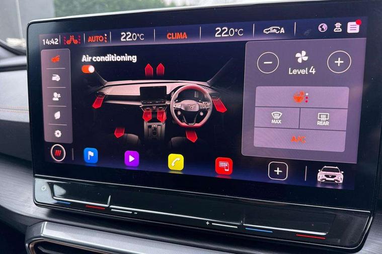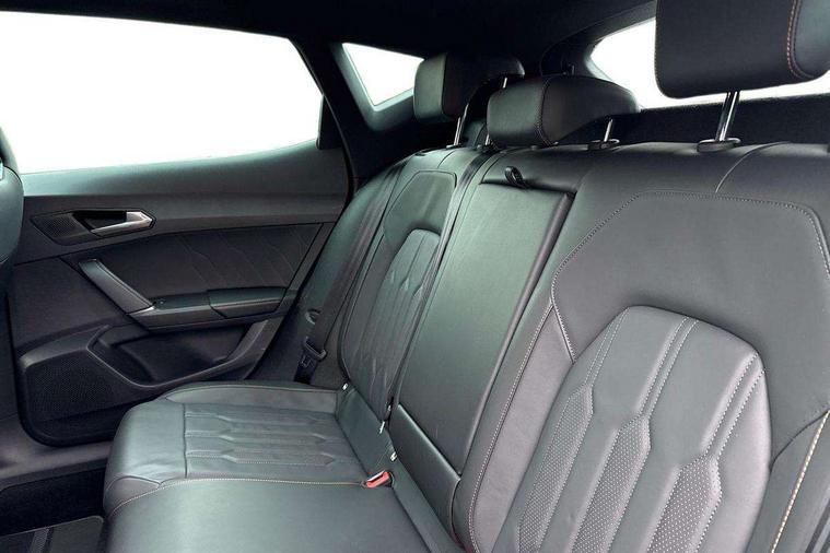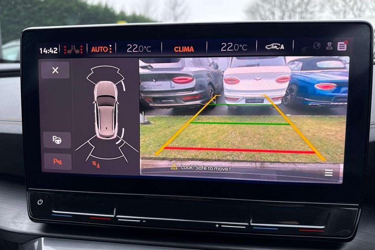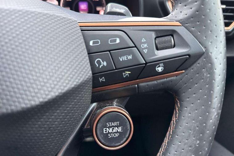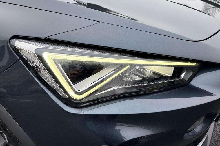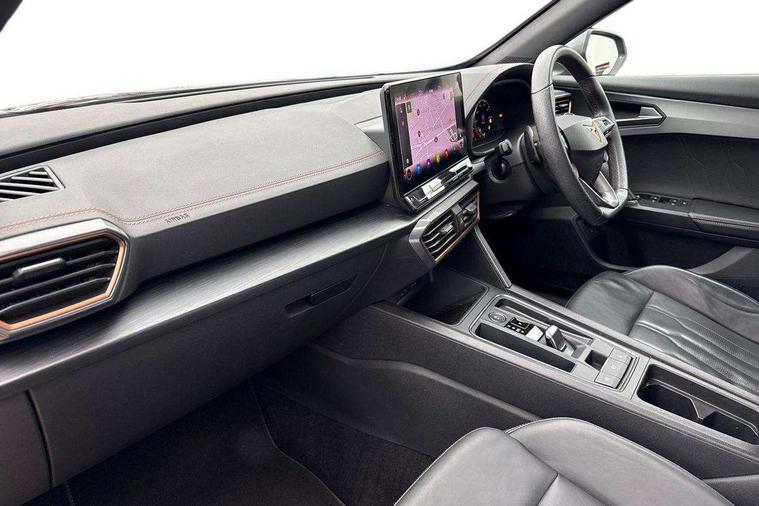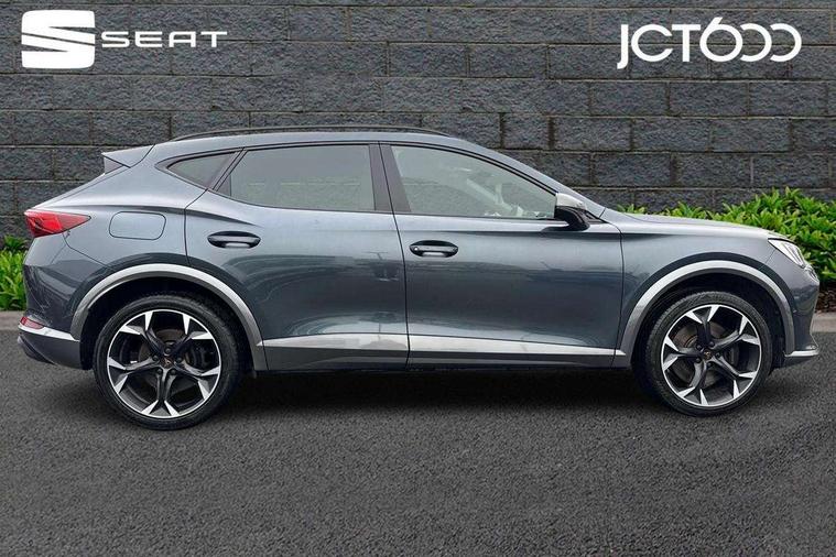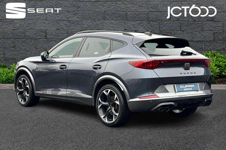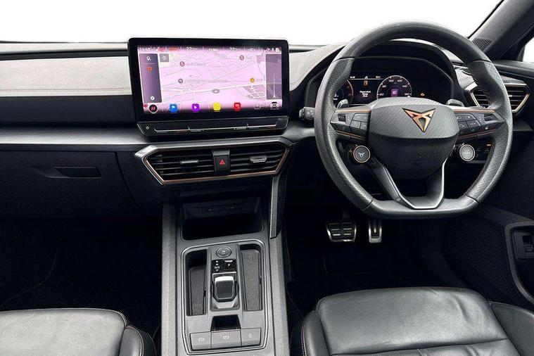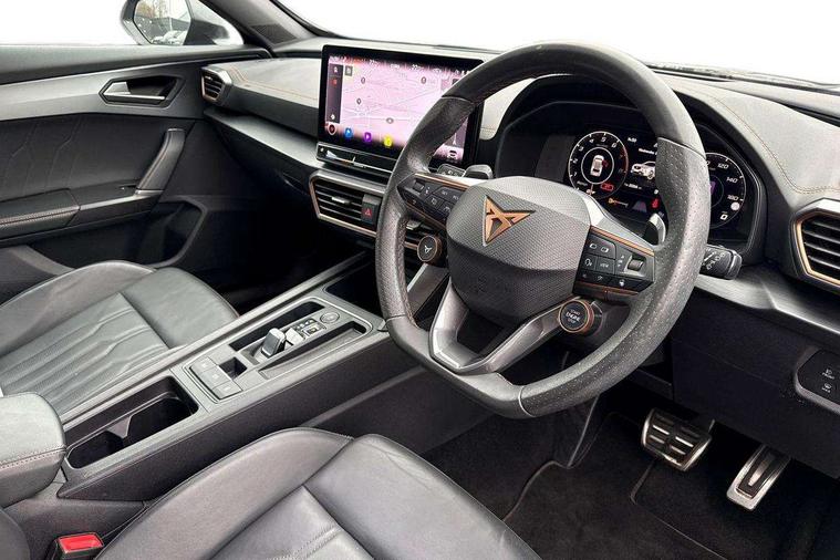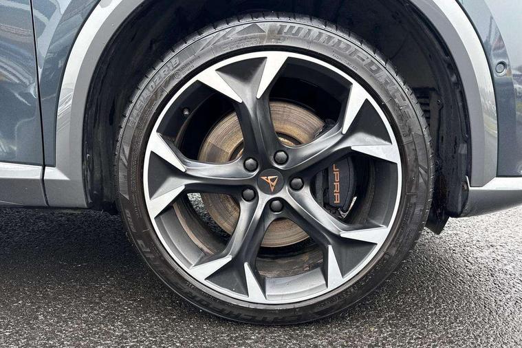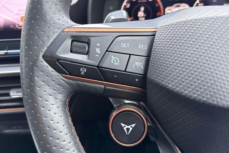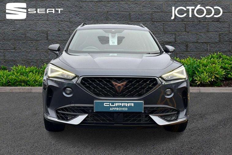Digital cockpit and configurable dashboard, Driver alert system, Dynamic chassis control with driving profile selection (Comfort, Sport, CUPRA, Individual), Forward collision warning with automatic braking, Lane assist, Park assist (inc front/rear parking sensors), Predictive adaptive cruise control with speed limiter, RPM, trip computer, outside temp gauge, instrument light brightness, low fuel warning light, lights on reminder, gearshift indicator, Service interval indicator, Speed sensitive power steering, Start/stop system with regenerative braking, Virtual pedal and electric tailgate, Wireless apple carplay, Wireless phone charger, Electronic locking differential and dynamic traction support, Sports suspension with front shock absoption, 2 front and 2 rear USB type C sockets, Auxiliary input socket, DAB radio, Auto dimming rear view mirror, Body colour door handles, Body coloured bumpers, Dark grey wing mirror, Daytime running light with automatic headlight control and coming home feature, Dynamic headlight range control, Electric front/rear windows, Electrically adjustable heated and folding door mirrors with memory function, Front fog lamps with cornering function, Gloss black roof rails and window surrounds, LED Headlights, LED Taillights with dynamic indicator, Rain sensing wipers, Rear diffuser with twin exhaust pipe on each side, Rear wash/wipe, Sports bumpers, Tinted rear windows, Welcome lights, 12v power supply in centre console, 12V socket, 12v socket in loadspace, 2 front and 2 rear reading lights, 230V socket, 60/40 split rear bench seat with armrest and mechanical seat release, Black headlining, Cupra sports pedals, Dust/pollen filter, Front and rear head restraints, Front centre armrest, Height/reach adjust steering wheel, Illuminated interior front door sills, Illuminated sunvisor with mirror, Isofix, Leather heated multi-function sports steering wheel with start stop, CUPRA mode button and gear shift paddles, Luggage tie-down hooks, Three zone climate control with control panel in rear, Variable luggage/load compartment floor, Wraparound lighting, Genuine Nappa leather Pack - Cupra, Navigation system pack - Formentor, Safety and driving pack (XL) - Formentor, 3 point seatbelts on all rear seats, ABS, Brake control system - ESC and brake booster, Child proof door locks, Driver and front passenger airbags with front passenger airbag de-activation, Electronic parking brake, Front and rear disc brakes, Front side curtain airbags, Hill hold control, Seat belt reminder for front and rear seats, Tyre pressure monitoring system, Anti theft alarm system, Keyless entry and start system (KESSY), Locking wheel bolts, Copper and aluminium interior detailing, 19" 'Exclusive' machined sport matte black and silver alloy wheels, Space saver spare wheel,