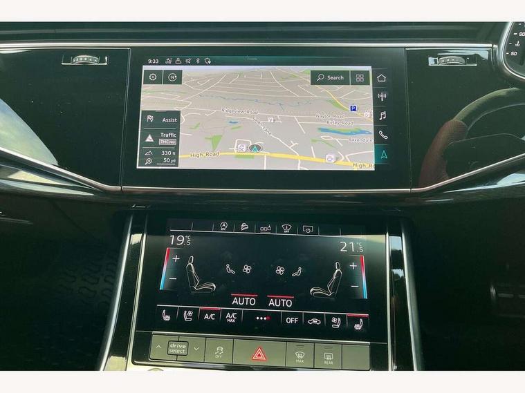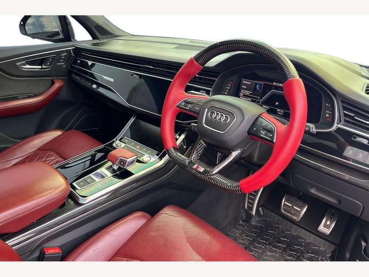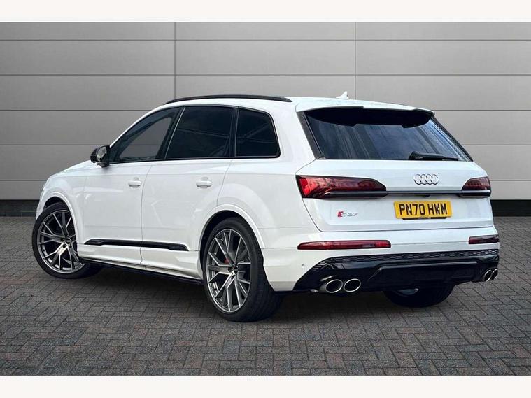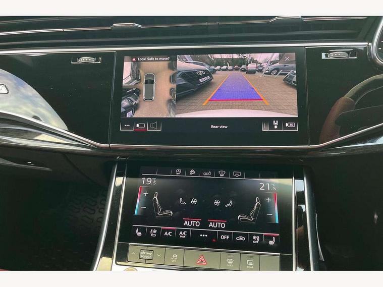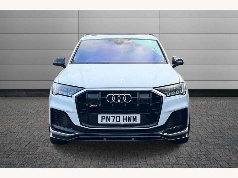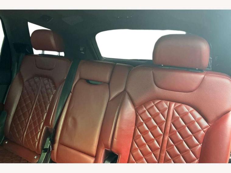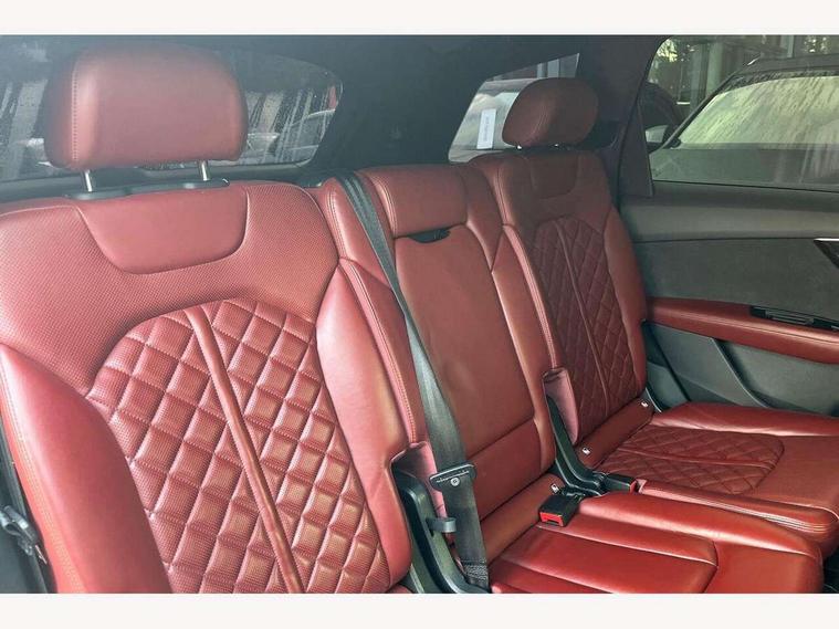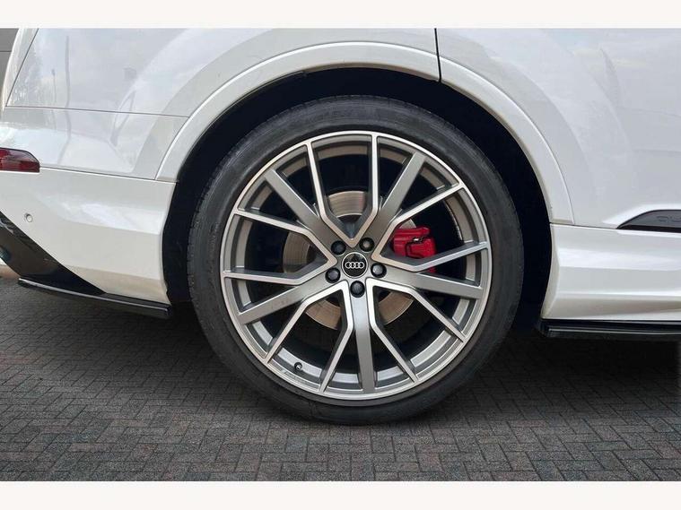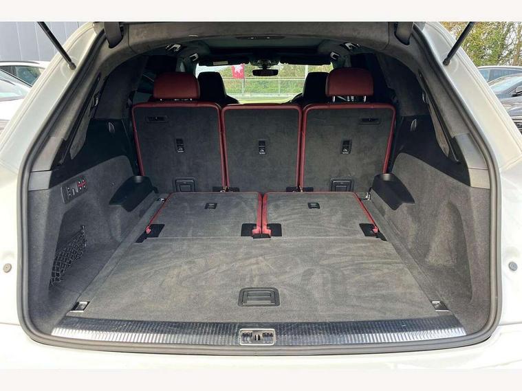 All wheel steering, Audi connect safety and service (e-call), Audi drive select (Auto, Comfort, Dynamic, Efficiency, Individual, Off-road and All road), Audi phone box with wireless charging, Audi smartphone interface includes wireless Apple carplay/Android Auto, Audi virtual cockpit - 12.3" high-resolution LCD display with fully customisable instrument cluster, Camera based traffic sign recognition, Head up Display, MMI navigation plus with MMI touch screens includes 10.1" and 8.6" screens with haptic feedback, Natural voice recognition, PAS, Power door closure, Power operated tailgate, Start/stop system, 48V Mild hybrid technology, 85 litre fuel tank, Quattro all wheel drive with self locking centre differential, S specific adaptive air sport suspension, 2 USB-C ports with charging functionality in the rear, DAB digital radio module, Audi Beam uses LEDs to project Vorsprung logo, Audi HD matrix LED headlights with Audi laser light + dynamic front and rear indicators, Auto dimming frameless rear view mirror, Black roof rails, Electric panoramic glass sunroof, Electrically adj heated/folding + automatically dimming exterior mirrors with memory + automatic kerb side function for passenger side exterior mirror, Headlight washers, Heat insulating glass in windshield, LED daytime running lights, LED rear tail lights, Privacy glass - dark tinted rear and rear side windows from B-pillar backwards, S front and rear bumpers, S specific rear bumper with 4 exhaust pipes, 3 spoke flat bottomed high multi-function leather sport steering wheel with gearshift paddles, 4 zone deluxe automatic climate control, 7 seat layout with ISOFIX points for the front passenger seat and rear passenger seat, Black alcantara headlining includes double sun visors with extendable driver and front passenger side illuminated vanity mirrors, Comfort front centre armrest, Electric height/reach adjustable steering column with memory + auto easy-entry and exit function, Folding rear seats, Front head restraints, Front/rear floor mats, Heated front and outer rear seats for second row, LED interior ambient lighting, Rear head restraints, Seat ventilation and massage function in the front, Stainless steel pedals, Tool kit, Valcona leather upholstery with front super sport seat + S embossed, electric adj front seats/backrest bolsters, lumbar support, memory functionality, City assist pack - Q7, Comfort and sound pack with Bang + Olufsen premium sound system - Q7, Extended leather pack with upper and lower interior elements in leather - Q7, Titanium black styling pack - Q7, Tour pack with Adaptive cruise assist - Q7, 3 point seatbelts on all rear seats, Audi pre sense front, Driver and front passenger, front side and curtain airbags, Electromechanical parking brake, Electronic Stabilisation Control (ESC) including ABS, ASR and EDL, Extended pedestrian protection measures, Hill hold assist, Seatbelt monitoring, Tyre pressure loss indicator, Warning triangle and first aid kit, Anti theft alarm, Anti-theft wheel bolts and wheel loosening detection, Keyless go with remote central locking, Polished oak trim with grey finished, Tyre repair kit,
