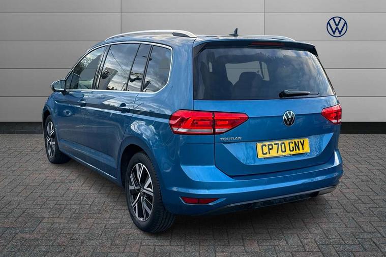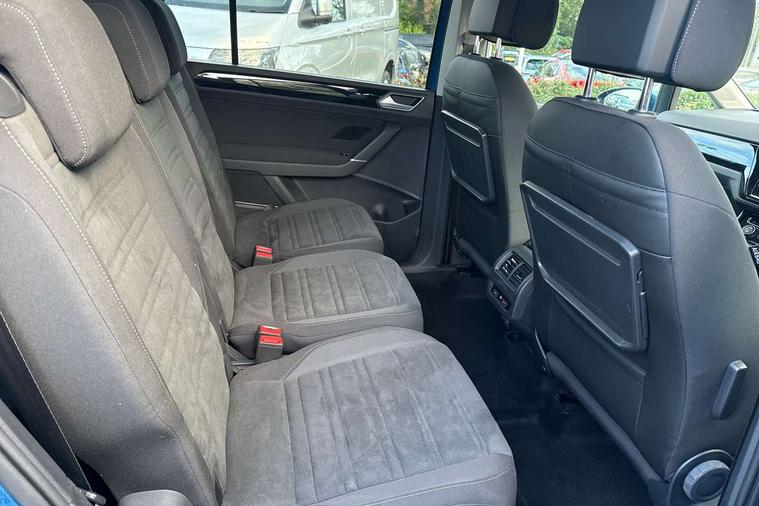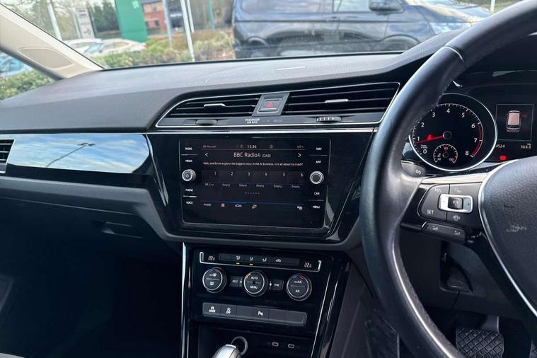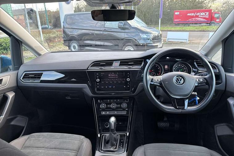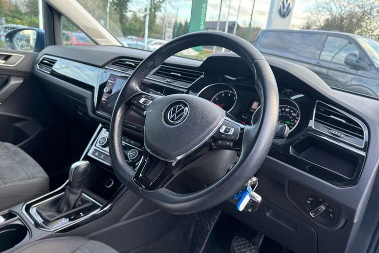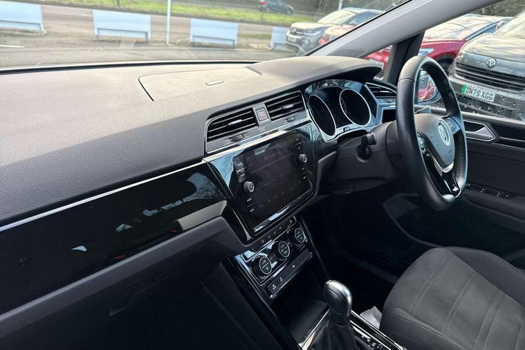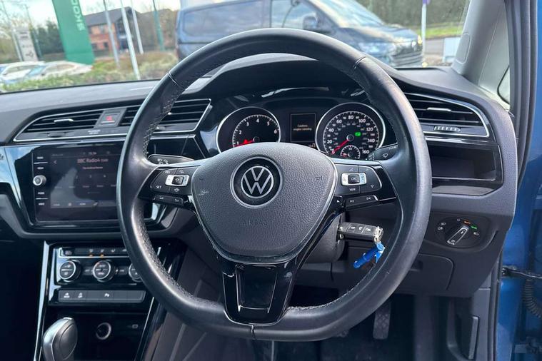 Adaptive cruise control, Audible lights on warning, Bluetooth telephone connectivity, Car information display, Driver alert system, Driver electronic voice amplification function, Electronic odometer, External temperature gauge, Flat tyre indicator, Mobile pairing with SMS function, Multifunction colour display, Rev counter with fuel gauge, Speed limiter, Speed sensitive power steering, Stop/start system, Think blue trainer driver tips and journey analysis, Trip and service interval display, Petrol Particulate Filter, XDS electronic differential lock, 4x20 watt output, Audio Connectivity System, DAB Digital radio, MP3/WMA compatability, SD card slot, Title and cover art display, USB connection, Aerial integrated into side window, Body colour bumpers, Body colour door handles, Body colour door mirrors with integral indicators, Chrome fog light surround, Chrome lower front bumper insert, Chrome trimmed front air intake surrounds, Chrome trimmed radiator grille louvre inserts, Chrome trimmed side windows, Dusk sensor + auto driving lights, Electric folding door mirrors with reverse activated kerb-view adjustment on passenger's door mirror, Front and rear electric windows, Front fog lights with static cornering function, Fully galvanised body, Gloss black finish B pillar, Green tinted heat insulating glass, High level third brake light, Rear tinted glass from B-pillar backwards approx 65% tinted, Rear wash/wipe with intermittent wipe setting, Silver roof rails, Tailgate wiper- reverse gear activation, Twin chrome exhaust tailpipes, Volkswagen roundel, Windscreen wipers intermittent wipe, 12V power point for Row 2, 12V socket in luggage compartment, 2 individual fold flat 3rd row seats, 2 three point seatbelts in 3rd row, 2nd row centre armrest, 2nd row centre seat converts into table, 3 single slide/fold/removable 2nd row seats, 3 spoke steering wheel, 3 Zone electronic climate control with automatic air recirculation, 3x3 point seatbelts on 2nd row with height adjust on outer seats, 4 boot load lashing points, 4 way adjustable front head restraints, 5 headrests, Ambient lighting in door trim and foot well, Driver and front passenger under seat drawer, Dust/pollen filters, Foldable front passenger seat backrest, Front + rear carpet mats, Front and rear reading lights, Front centre armrest with storage compartment, Front cupholders x 2, Front seat storage pockets, Front seatback folding tables, Height adjustable driver's seat, Height/reach adjust steering wheel, Illuminated glovebox, Illuminated vanity mirrors, Instrument lighting white adjustable panel illumination with red night time illumination, Interior light with delay, Isofix on 2nd row outer seats, Isofix on 3rd row seats, Large storage compartment in roof console, Leatherette on rear of front seats, Low tunnel 2nd row seat, Media box in dashboard on passenger side, Multi storage in passenger/luggage areas, Multi-function centre console with storage facilities, Retractable luggage cover, Split folding rear seat backrests, Storage bins on all doors, Convenience Pack - Touran, Mirror pack - Touran, 3 point height adjustable front seatbelts, Auto hold function, Automatic post collision braking system, Door open warning reflectors, Driver/Front Passenger airbags, Drivers knee airbag, EDL + ASR, Electronic parking brake, Energy recovery system, ESC with ABS, First aid kit, Front and rear (row 2) curtain airbags, Front assist including city emergency braking, Front seat side impact airbags, Front/rear disc brakes, Hill hold control, Hydraulic Brake Assist (HBA), Loose wheel warning function, Manual passenger airbag deactivation function, Pre crash preventive occupant protection, Seatbelt warning lamp and buzzer, Traction control, Two tone horn, Warning triangle, Alarm with remote central locking and interior protection, Electronic engine immobiliser, Chrome plated instrument surrounds, Piano black decorative inserts, Tyre mobility system,