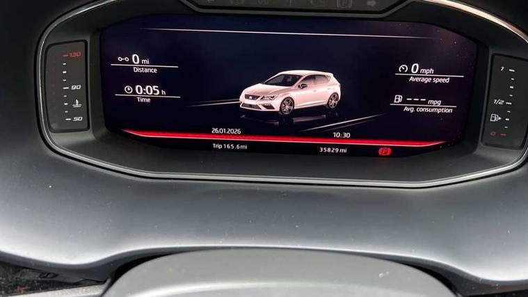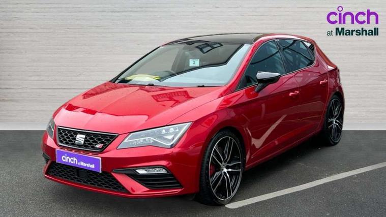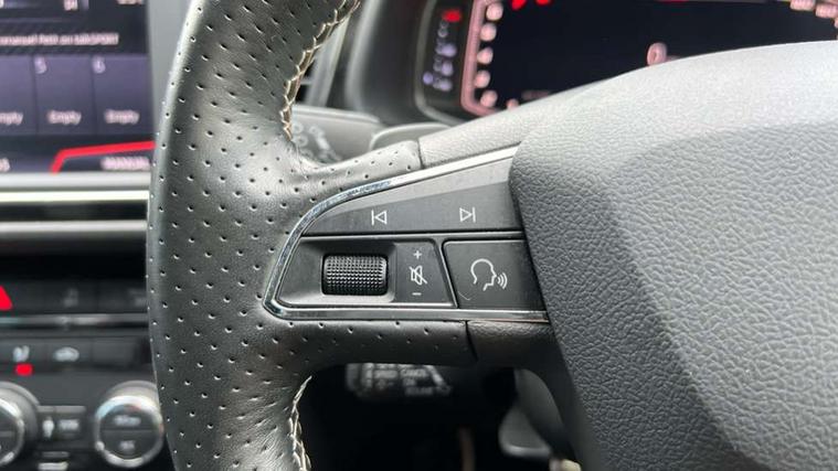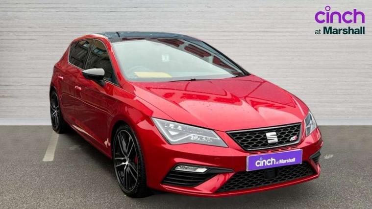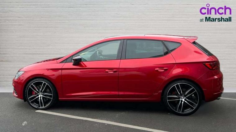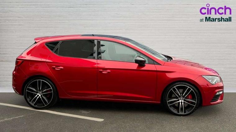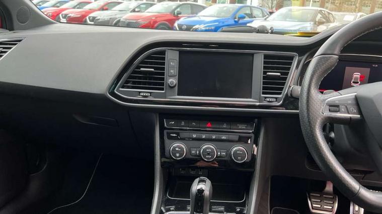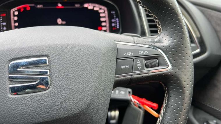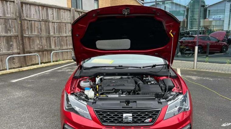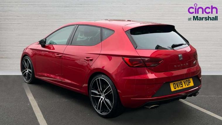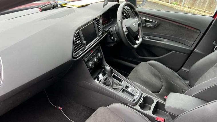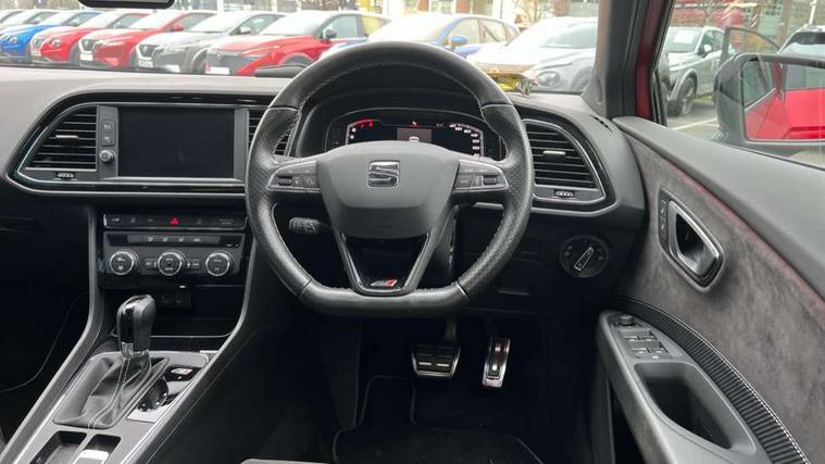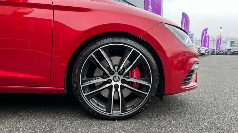 'Lights On' Reminder warning buzzer, 3D map display, 8" touch screen, Bluetooth Handsfree Phone Connection, CUPRA performance interface, Digital cockpit, Electro-mechanical progressive power assisted steering, Front and rear parking sensors, Front assist with pedestrian protection, Full Link Smartphone Integration with Mirror Link, Apple Car Play, Google Android Auto, Low fuel warning light, Navigation system (incl. media system plus), Outside temperature gauge, RPM counter, SEAT Drive profile CUPRA, SEAT logo boot release, Service interval indicator, Trip computer, Voice recognition, Dynamic chassis control, Lowered suspension, Mechanical limited slip differential, XDS electronic differential lock, 2x SD card slot, 4 USB, 8 Speakers, Auxiliary input socket, Bluetooth audio streaming, CD player, DAB Digital radio, High resolution colour driver display, Media system plus (incl. media system colour), SEAT USB media cable, Steering wheel mounted audio/phone controls, Black radiator grille, Body colour door handles, Body coloured bumpers, Dark tinted rear windows, Electric front/rear windows, Electrically adjustable door mirrors, Electrically foldable exterior mirrors with parking position and passenger-side mirror with lowering function, Exclusive Cupra front and rear bumpers, Gloss black exterior mirrors with integrated LED indicators, Heated door mirrors, High gloss black finish B and C pillars, High gloss black front grille surround, Illuminated aluminium front door sill with CUPRA logo, LED front fog lights, LED headlights with LED day time running lights + LED rear lights + LED number plate lights, LED rear fog light, Rear wash/wipe, Visible dual exhaust pipes, 12v power point in centre console, 60/40 split folding rear seat with armrest, Active front headrests and 3 rear headrests, Additional heating and ventilation outlet in rear of centre console, Black roof lining, Boot storage net, Cargo rings in boot, Driver and passenger seat height adjust, Driver and passenger sun visor, covered and illuminated mirror, driver sun visor with card holder, Driver seat lumbar adjustment, Dual zone climate control, Dust/pollen filter, Flat bottomed perforated leather steering wheel with white stitching and CUPRA logo, Front adjustable head restraints, Front armrest with storage box, Front cupholders x 2, Front seatback storage pockets, Front sport seats in alcantara, Front/rear floor mats, Gear shift indicator, Height/reach adjust steering wheel, High centre console with integrated box & cup holder, rear air outlet, with armrest in front seats, Illuminated door sills, Instrument lighting with brightness control, Interior copper and black detailing, Luggage tie-down hooks, Multi-colour ambient interior lighting, Passenger seat lumbar adjust, Pedals with Aluminium Cover, Rear top tether child seat ISOFIX attachment, Steering wheel gearshift paddles, Storage box under drivers and passenger seat, 3 point seatbelts on all rear seats, 7 airbags - 2 front, 2 front side, 2 curtain, 1 knee, ABS + TCS, Child proof door locks, Electric handbrake, Electronic parking brake with auto hold, ESC with switch off key, ESC with tyre pressure warning indicator, ESP+EBA, Front and rear black brake calipers with cupra logo, Front seatbelt pretensioners, Front seatbelt reminder, Hill hold control, Manual passenger airbag deactivation function, Multi-Collision braking, 2 folding remote keys with window open/close function and boot opening/door mirror folding function, Central locking fuel filler cap, Engine immobiliser, Locking wheel bolts, Remote central locking + deadlocks, Volumetric alarm with back up horn, Gloss black interior detailing, 19" Cupra Machined alloy wheels 30/2,