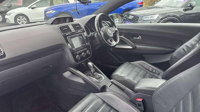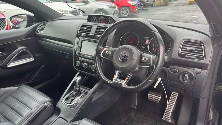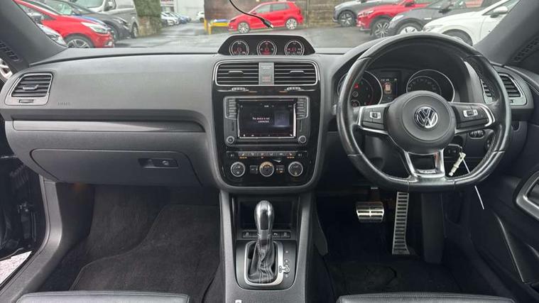 'Lights On' Reminder warning buzzer, Bluetooth system, Discover navigation system with 6.5" colour screen + radio/CD player and aux in, Exterior temperature gauge, Flat tyre indicator, Front and rear parking sensors, Multi function display colour screen, Multifunction computer - Highline, Rev counter, Service interval indicator, Speed sensitive variable PAS, DAB Digital radio, MDI with USB/iPod connection cables, Auto dimming rear view mirror/rain sensor, Automatic activation of hazard warning lights, Body colour door handles, Body colour door mirrors with integral indicators, Body coloured bumpers, Coming home function, Dusk sensor + auto driving lights, Electric front windows, Electrically heated + operated door mirrors, Front fog lights, Intermittent rear wash/wipe, LED rear lights, Range adjustable headlights, Rear roof spoiler, 12V socket in luggage compartment, 2 bag hooks in luggage compartment, 2 cupholders, 2 rear head restraints, 2 Zone electronic climate control with automatic air recirculation, 3 spoke multifunction leather steering wheel with radio controls + paddle shift, 4 lashing points on luggage floor, 50/50 split folding rear seat backrest, Aluminium pedals, Black roof lining, Dust/pollen filter, Easy entry slide seats (access to rear seats), Front + rear carpet mats, Front centre armrest with storage compartment, Front footwell illumination, Front reading lights, Height/reach adjust steering wheel, Illuminated vanity mirrors, Interior light with delay, Isofix Preparation 2 Rear child seats, Leather gear knob, Leather handbrake grip, Lockable/illuminated air conditioned glovebox, Luggage compartment cover, Luggage compartment lighting, Sports front seats, Storage compartments in doors, Vienna leather heated seats+electric drivers lumbar + front pass lumbar adjust, Styling pack - Scirocco R Line/GTS, 2 rear 3 point safety belts, 2x3 point front seatbelts with pre-tensioners, ABS+EBD+Brake assist, Door open warning reflectors, Driver/Front Passenger airbags, Driver/Passenger whiplash optimised head restraints, ESP with EDL + ASR, Front and rear curtain airbags, Front seat side impact airbags, Hill hold function, Manual passenger airbag deactivation function, Seatbelt warning, Two tone horn, Alarm with interior protection, Electronic engine immobiliser, Remote central locking with 2 remote folding keys, Brushed aluminium instrument surrounds, Carbon look decorative inserts, Steel space saver spare wheel,