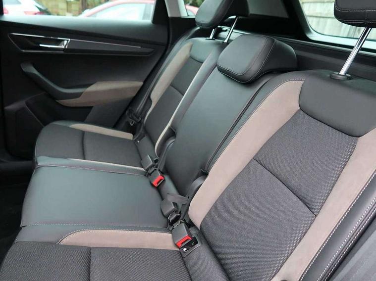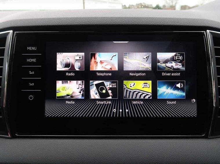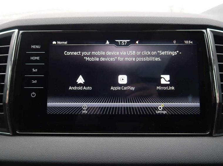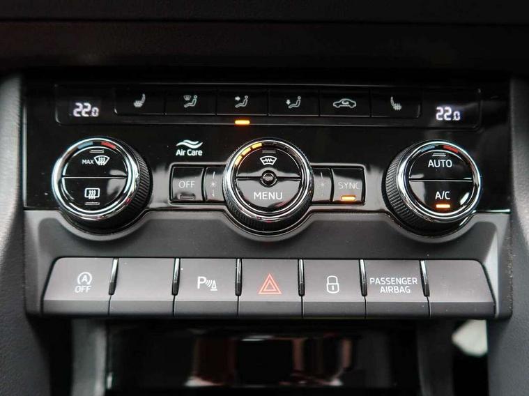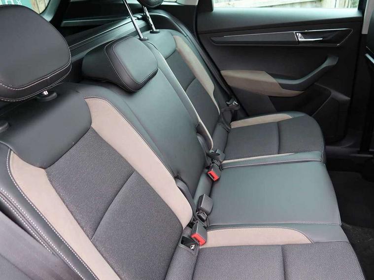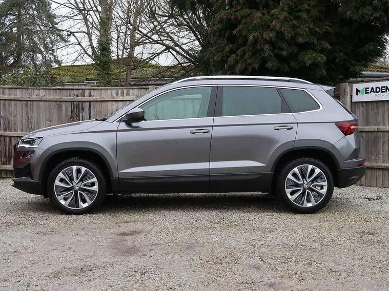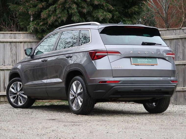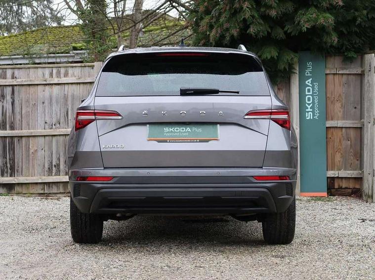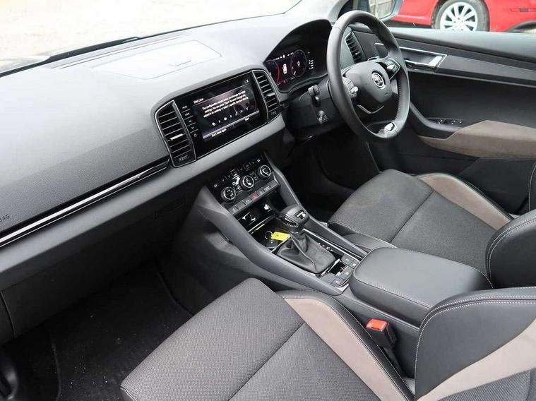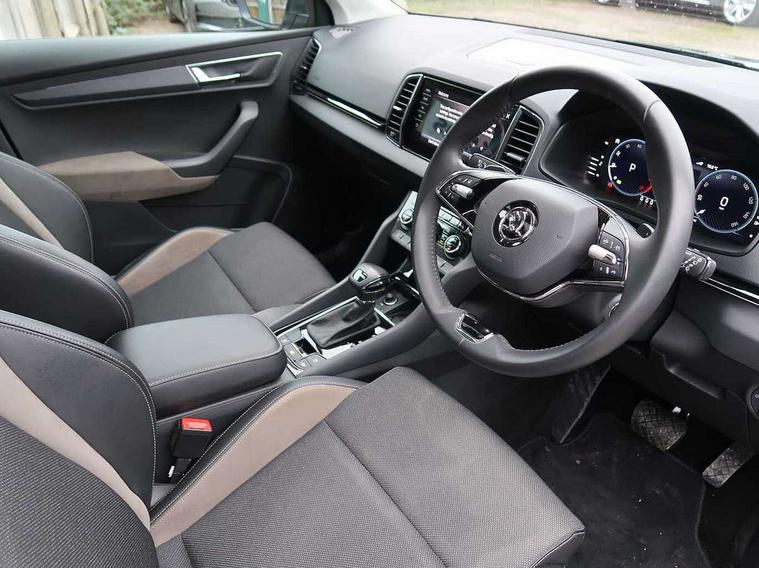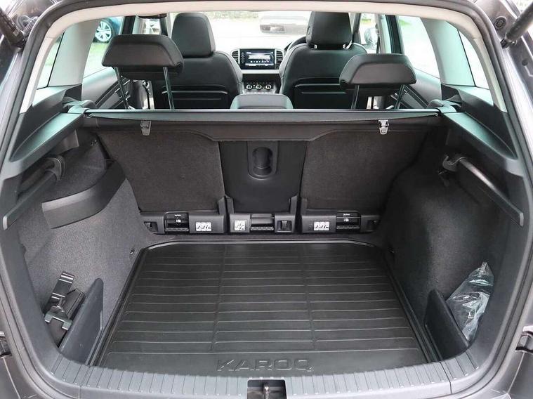 8" Digital display, Care connect, Driver fatigue sensor, Emergency services call system, Outside temperature gauge, Service interval indicator, SmartLink wireless for Apple and wired for Android, Start/stop system with regenerative braking, USB C Port x 2 in front centre console, 8 Speakers, DAB radio with Bluetooth, USB connection, Acoustic glass, Aero front windscreen wipers with intermittent function, Auto dimming rear view mirror with light and rain sensors, Black electric window control buttons, Body colour door mirrors and handles, Dynamic headlight range control with cornering light function, Electric front and rear windows with child proof lock, Heated rear windscreen, LED daytime running lights, LED rear lights with high functionality welcome effect and dynamic indicators, Light assistant (coming/leaving home/tunnel light), Plastic scuff plates, Privacy glass, Rear side wing doors, Rear spoiler, Rear window wiper with washer system and intermittent control, Safety reflectors on front doors, 1.5 litre bottle holders in driver and front passenger door panels, 12V socket in boot, 12v socket in front centre armrest with storage compartment and rear air vents, 2 Folding hooks and nets in boot, 2 spoke leather heated multifunction steering wheel with DSG paddles, 2 x Tablet holder, 3 rear height adjustable headrests, 3 seat bench in 2nd row, 4 foldable roof handles with rear coat hooks, Black floor carpet, Chrome inner door handles, Decorative door sills with KAROQ badging, Double sided boot floor, Foldable hooks in the boot, Front head restraints, Height adjustable front three point seats belts with tensioners, Height/reach adjust steering wheel, Ice scraper, Illuminated glovebox, Illuminated luggage compartment, Isofix child seat preparation for front passenger seat, Isofix child seat preparation outer rear, Manual lumbar support for front seats, Pen holder, Pollen filter, Rear boot cover, Rear reading lights, Rubbish bin door, Safety vest holder, Single front passenger seat, Storage box in upper central dashboard closed, Sunvisors with illuminated vanity mirrors, Textile floor mats, Ticket holder, VarioFlex seats with standard rear seat release, Chrome roof rails + chrome pack - Karoq, Parking pack - Karoq, Automatic door unlocking in case of crash, Automatic fuel cut off in case of crash, Child locks on rear doors, Driver airbag, Electronic parking brake with auto hold function, Emergency rear braking signal, ESC including ABS, MSR, ASR, EDS, HBA, DSR, RBS, MKB and traction control, Front side airbags, Hill hold control, Knee airbags, Passenger airbag with switch-off function, Pedestrian monitor, Seatbelt reminder signalisation and pretensioner for all seats, Three point seatbelts rear, Two tone horn, Tyre pressure display, Tyre pressure monitor, Alarm with interior monitoring, back up horn and tilt sensor with safe function, Electronic engine immobiliser, Keyless entry and start/stop, Remote central locking with 2 remote folding keys, Chrome framed air vents, Anti-theft wheel bolts protection, Storage on wheel cover, Tool kit,