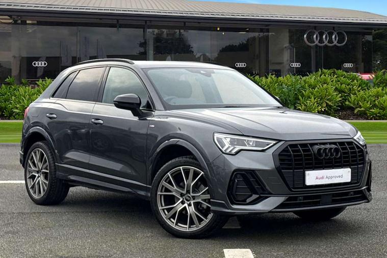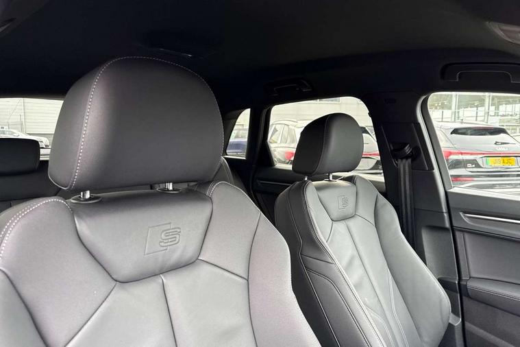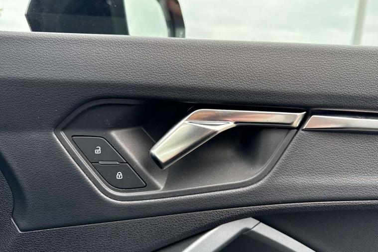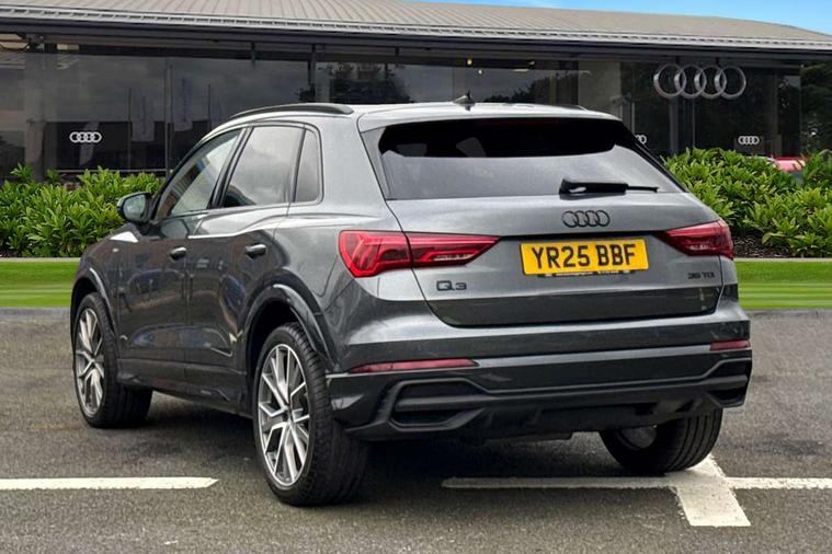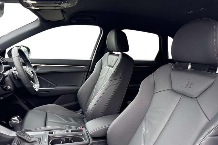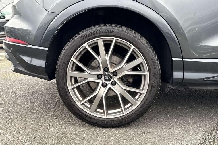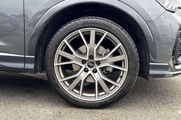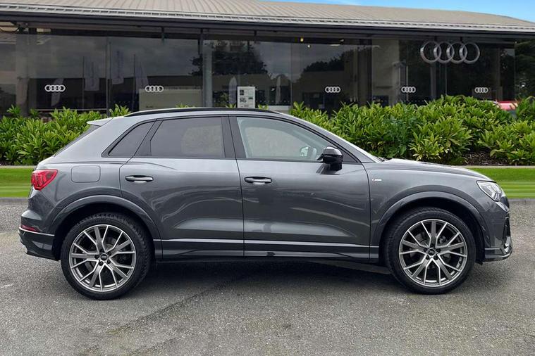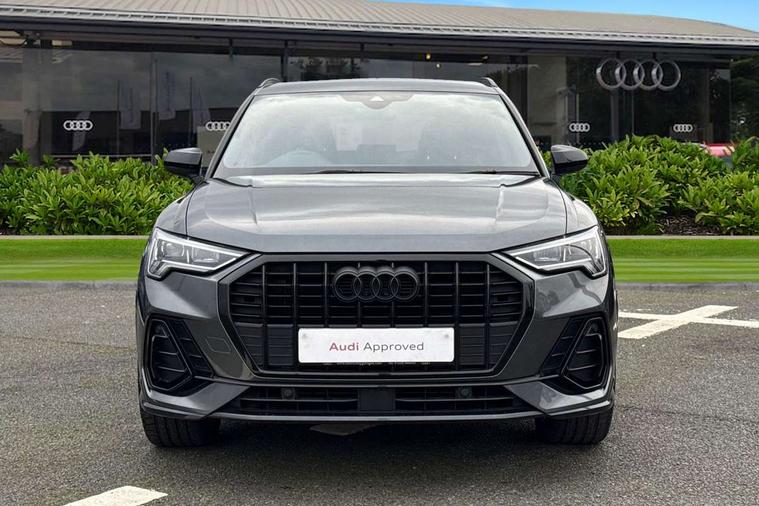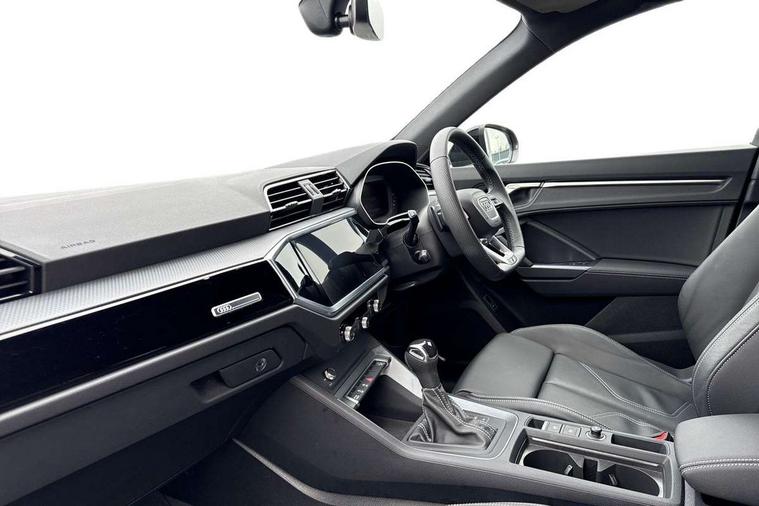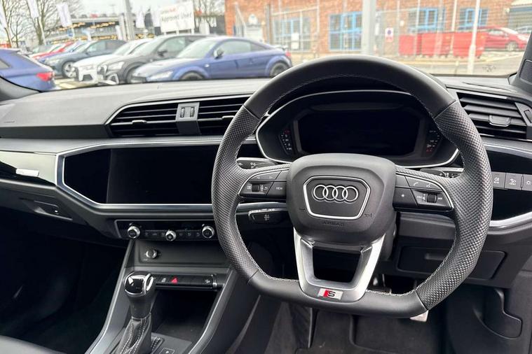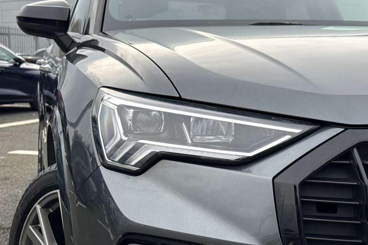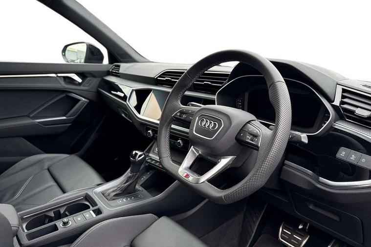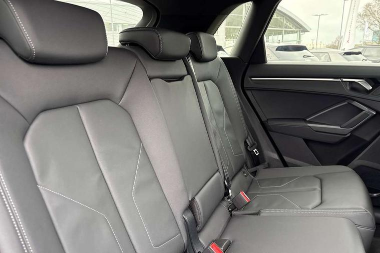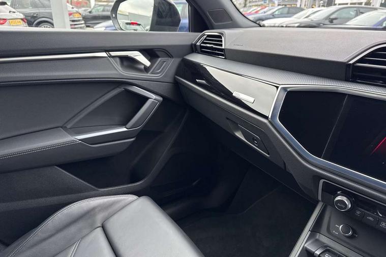 Amazon alexa Integration, Audi connect safety and service, Audi drive select, Audi lane departure warning, Audi Virtual Cockpit - 10.25" display, Bluetooth interface, Camera based traffic sign recognition, Distraction and Fatigue warning, Legal emergency call, MMI Navigation Plus with high resolution 10.1 inch touchscreen colour display, Power operated tailgate, Progressive steering, Service interval indicator, Smartphone interface includes wireless Apple carplay/Android Auto, Start stop system with recuperation, Voice control system with natural language interaction, Diesel particulate filter, Sports suspension, 2 USB-C ports with charge and data functions, 6 passive loudspeakers, DAB digital radio module, Acoustic windscreen, Audi Beam uses LEDs to project the Audi logo onto the ground as you exit your Q3, Auto dimming door mirrors, Auto dimming frameless rear view mirror, Black roof rails, Electrically folding, adjustable and heated door mirrors with integrated LED side indicators and kerb view function for passenger side, Front and rear electric windows, Front fog lights, Grille vertical bars in aluminium silver/Matt, High gloss black finish B and C pillars, LED Dynamic rear indicators, LED headlights with LED daytime running lights, LED rear lights, LED third brake light, Privacy glass dark tinted rear and rear-side windows (from B-pillar backwards), Rain and light sensors, Rear diffuser grille in grained matt black, Rear diffuser strip in matt anthracite black, Rear side wing doors, Rear wiper, S line bumpers in contrasting Manhattan grey, Variable front intermittent wipers, 12V socket in rear centre console, 3 seat bench in 2nd row, 40:20:40 folding with manual adjustment for 60:40 forwards/backwards position and backrest angle, Adjustable rear seat bench/backrest with centre armrest and cupholder, Black cloth headlining, Dual zone electronic climate control, Electric lumbar support, Front and rear black floor mats with contrast stitching in rock grey, Front and rear headrests, Front centre armrest, Height and reach adjustable steering wheel, Illuminated door sill trims with S logo, ISOFIX child seat mounting for front passenger with airbag deactivation and outer rear seat including top tether attachment point for outer rear seats, Manual front seats with height adjustment, Perforated leather gearknob, Single front passenger seat, Stainless steel luggage compartment sill finisher, Stainless steel pedals, Twin leather upholstery with front sport seats + S embossing, Black styling pack - Q3, Non smoking pack - Q3, 3x3 point rear seatbelts, 6 airbags - Driver, front passenger, curtain and side windows, Audi pre-sense front with pedestrain and cyclist recognition, Electrically operated child locks on rear doors, Electromechanical parking brake, Electronic stabilisation control including ABS, ASR and EDL, Front seatbelt reminder, Hill descent control, Hill hold assist, Pre sense basic, Seatbelt monitoring, Tyre pressure warning, Warning triangle and first aid kit, Anti theft wheel bolts, Immobiliser, Remote central locking, Thatcham approved category 1 anti theft alarm, Aluminium look interior elements, Detail dashboard around MMI touch colour display in glass look, black with surround in aluminium look, Leatherette door armrest, Piano black inlay,