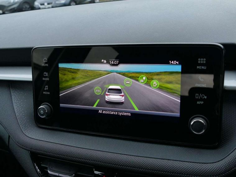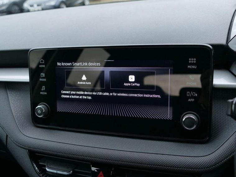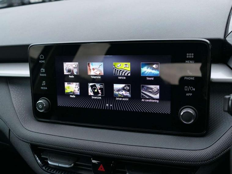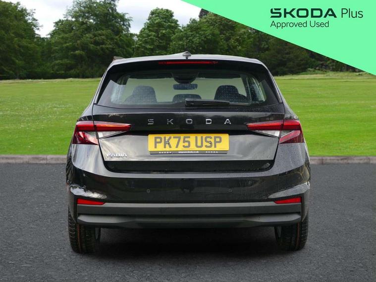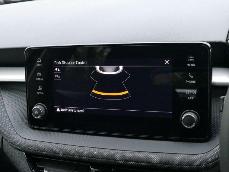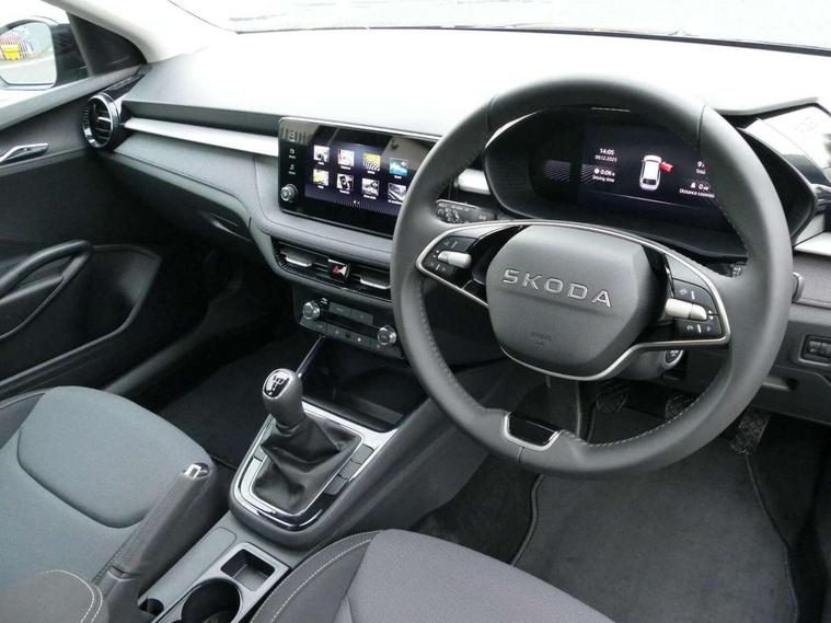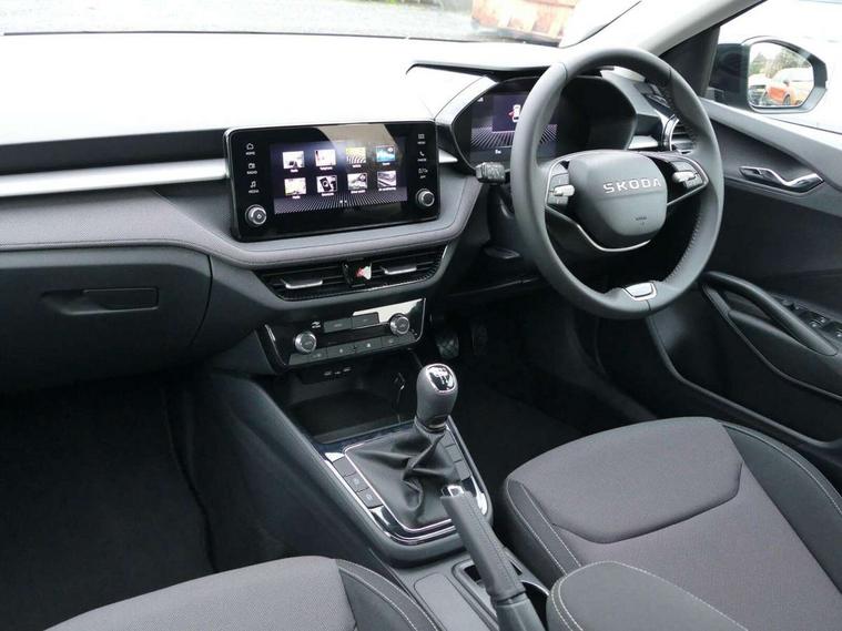 8" Digital instrument display, Advanced driver attention and drowsiness monitor, Bluetooth connection, Driver alert system, Electromechanical power steering, Exterior temperature gauge, Service interval indicator, Traffic sign recognition, Wireless SmartLink for Apple CarPlay and Android Auto, 6 Speakers (4 in front and 2 in rear), 8.25" Skoda infotainment touchscreen display, Auxiliary socket for external MP3 player, DAB digital radio reception, Auto dimming rear view mirror, Body colour door mirrors, Body coloured bumpers, Door mirror integrated indicators, Front and rear electric windows, Front window wiper intermittent control, Headlight range control - Automatic, LED 3rd brake light, LED daytime running lights with coming and leaving home feature, LED rear lights, Rear LED fog light, Rear side wing doors, Rear window wiper with washing nozzles, Roof mounted spoiler, SKODA tailgate lettering in chrome, Unique dark chrome design logo on alloy wheels, 2 reading lights in front and 2 reading lights in rear, 3 rear headrests, Backrest split and folding, Central console with removable cup holder and storage box, Chrome handbrake release button, Dual zone air conditioning with climatronic electronic control, Fabric upholstery, Front centre armrest, Gearshift knob/handle in leather, Grain satin black interior door handles, Hand brake lever handle in leather, Height adjustable front headrests, Height adjustable front seats, Height adjustable steering wheel, ISOFIX and TopTether anchorage points to the outer rear seats, ISOFIX and TopTether on the front passenger seat, Luggage compartment lighting, Manually adjustable lumbar support in front seats, Pollen filter, Rear seat bench unsplit, Single front passenger seat, Skoda lettering on steering wheel, Storm grey headlining, Sun visors with mirror and airbag label on passenger side, Textile floor mats, Ambient lighting pack - Fabia Hatchback, 3-point height adjustable front seats belts with pretensioner and force limiter, Automatic warning lights in case of crash, Driver and passengers airbag with switch off function, e-Call+, ESC including ABS, MSR, ASR, EDS, HBA and XDS, Front and rear seat belt warning, FRONT ASSIST (AEB City and AEB Inter Urban), Front side airbags, Head airbags, One tone horn, Pedestrian protection, Three rear 3-points safety seat belts with pretensioner and force limiter including stop function for outer rear seat belts, Tyre pressure monitoring system, Anti-theft alarm system including immobiliser, interior monitoring, backup horn, and towing protection, Central locking with radio remote control, interior controls, SAFE function and 2 foldable keys, Black painted air vents, Grain satin black central console cover, Metallic grey upper decorative trim, Satin black door and side trim panel in front, Textile Kota grey lower decorative inserts, Anti-theft wheel bolts protection, Super-low rolling resistance tyres,