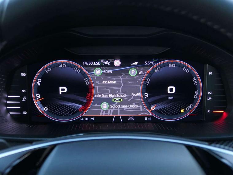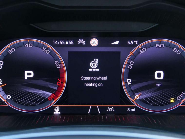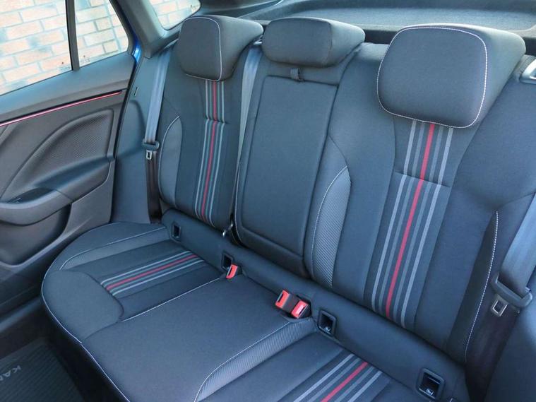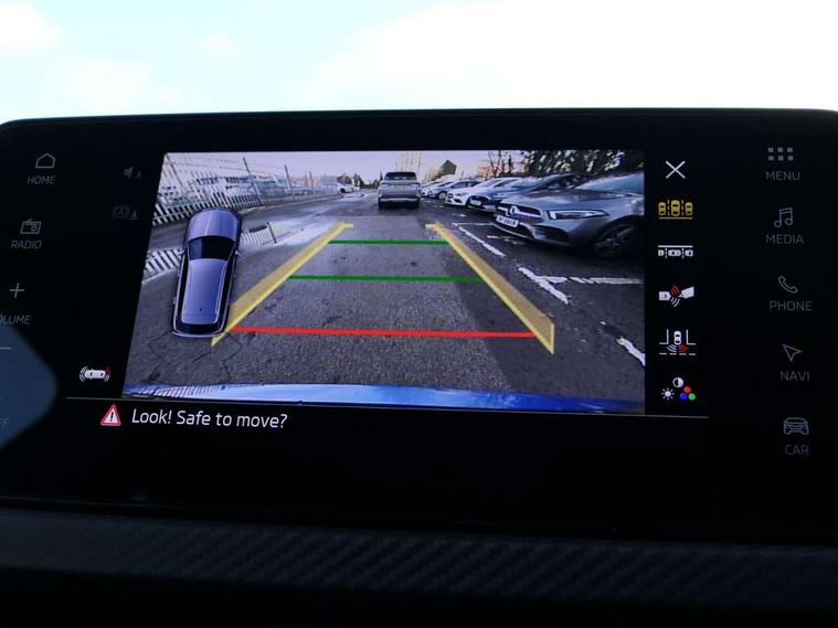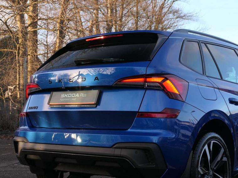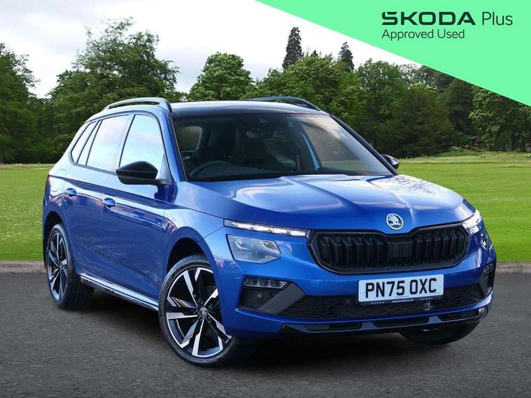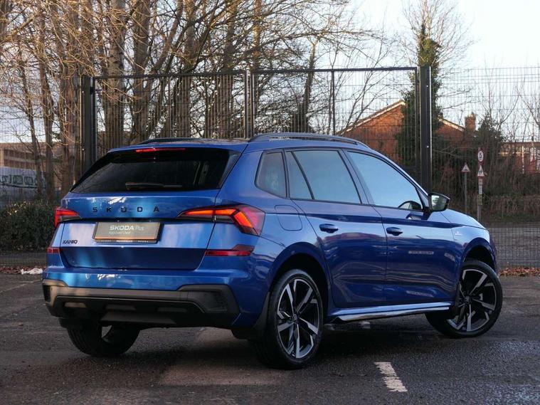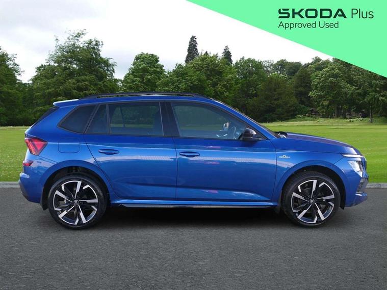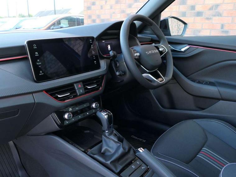 Advanced driver attention and drowsiness monitor, Bluetooth system, E-call, Front assist system, PAS, Rear parking sensors, Rear view camera, Service indicator, Speed limiter, Traffic sign recognition, Virtual cockpit with 10.25" display, Voice control system, Wireless smartlink, 4 USB C ports, 8 Speakers, 9.2" Skoda navigation display, DAB Digital radio, Auto dimming rear view mirror, Automatic headlight control with coming home and leaving home feature, Black door mirrors, Black radiator grille, Black rear diffuser, Black roof spoiler, Body colour bumpers, Body colour door handles, Boot lettering in black, Extended tailgate glass, Fixed panoramic sunroof with black roof rails, Front and rear electric windows, Heated rear window, LED daytime running lights, LED high beam, LED low beam, LED third brake light, Light sensors, Monte carlo plaque, Privacy glass, Rear side wing doors, Rear wiper, Ticket holder inside windscreen, 12V socket in luggage compartment, 3 seat bench in 2nd row, Aluminium pedals, Ambient lighting in white/red, Art leather carbon decor inserts, Art leather carbon door inserts, Black roof lining, Cargo elements, Chrome inner door handles, Driver and passenger sun visors with vanity mirror, Dual zone climate control, Front and rear roof lights, Front centre armrest, Front head restraints, Glove compartment with illumination, Height adjustable driver seat, Height adjustable front passenger seat, Ice scraper, Inner circulation control with pollen filter, ISOFIX on front passenger seat, Isofix preparation for back seats, Leather gearknob and handbrake lever, Manual lumbar support for front seats, Monte Carlo cloth upholstery, Net package and top tether hooks in boot space, Net under rear shelf, Pocket on the back of both front seats include mobile phone pockets, Rake/reach adjustable steering wheel, Reading lights, Rear centre armrests, Red hotstamping, Single front passenger seat, Sports seats, Textile floor mats, Third rear headrest, Top tether for front passenger seat, Umbrella in driver's door, Light and view plus package - Kamiq, 3x3 point rear seatbelts, Airbags - driver and front passenger, Disc brakes, ESP, Extended and predictive pedestrian/cyclist protection, Front passenger airbag deactivation switch, Front side airbags with curtain airbags, Hill hold control, Manual leather parking brake, Manual rear child locks, One tone horn, Seatbelt reminder for driver an co-driver, Traction control, Tyre pressure monitor, Anti-theft alarm system with interior monitoring, backup horn, towing protection and remote central locking with SAFE system, Anti-theft wheel bolts, Electronic engine immobilizer, 18" Ursa black diamond cut alloy wheels,