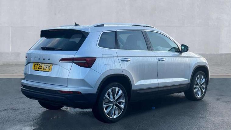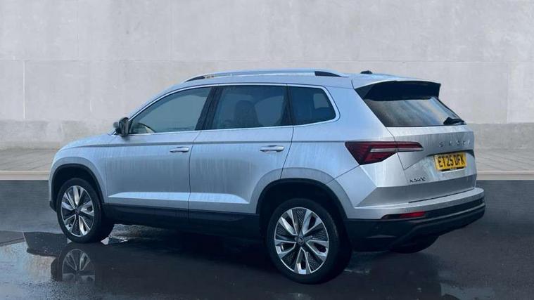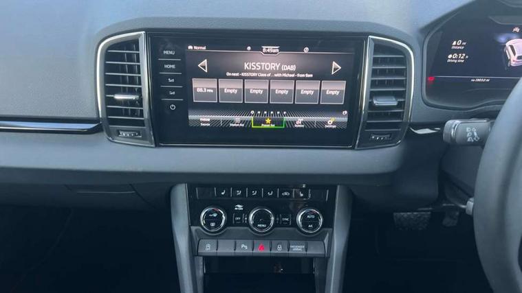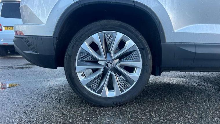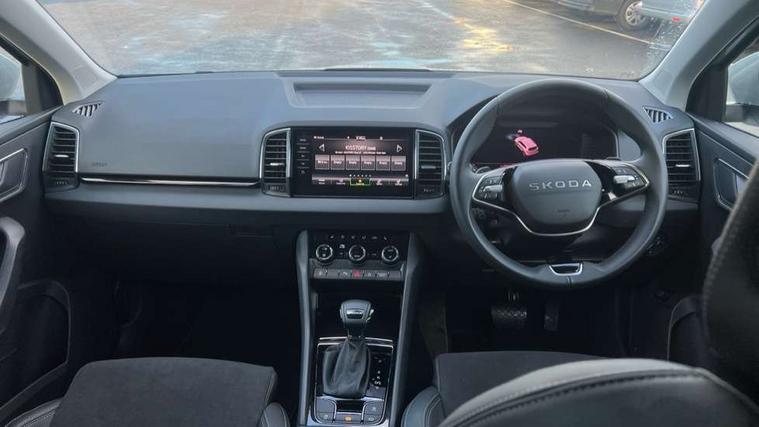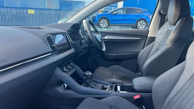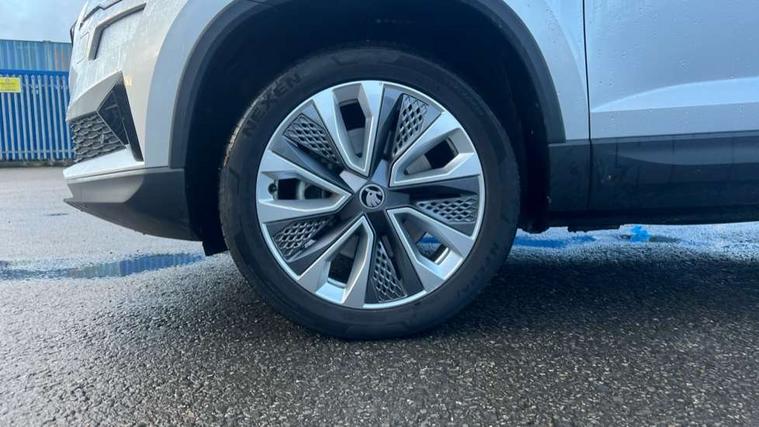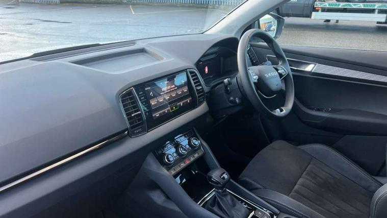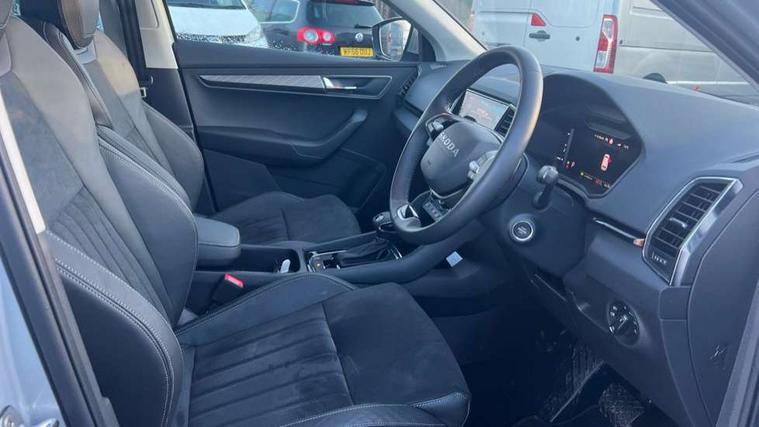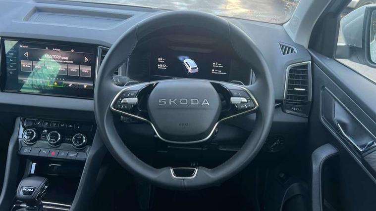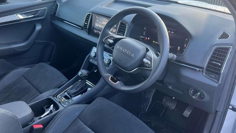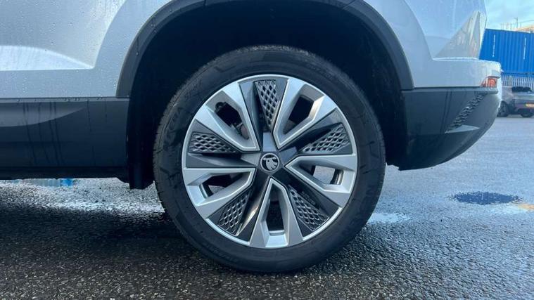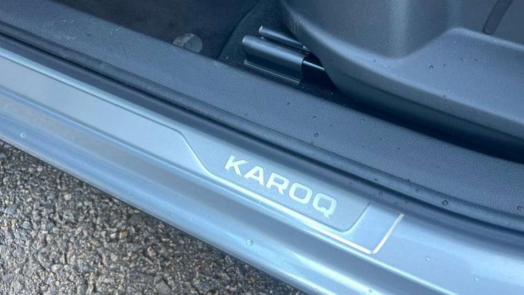 Advanced driver attention and drowsiness monitor, Drive Mode Selection including ECO function, Electro-mechanical PAS, Emergency services call system, Outside temperature gauge, Sensor for driver assistance systems, Service interval indicator, SmartLink wireless for Apple and wired for Android, Start/stop system with regenerative braking, Traffic sign recognition, USB C Port x 2 in front centre console, Virtual Cockpit - 10.25" digital display, Virtual pedal with electrically operated boot door, Wireless smartphone charging, DAB radio with Bluetooth, USB connection, Acoustic glass, Aero front windscreen wipers with intermittent function, Auto dimming rear view mirror with light and rain sensors, Black electric window control buttons, Body colour door mirrors and handles, Electric front and rear windows with child proof lock, Extended rear roof spoiler, Heated rear windscreen, LED daytime running lights, LED rear lights with high functionality welcome effect and dynamic indicators, Light assistant (coming/leaving home/tunnel light), Plastic scuff plates in door apertures, Privacy glass, Rear side wing doors, Rear window wiper with washer system and intermittent control, Safety reflectors on front doors, Third brake light, Unique dark chrome design logo on alloy wheels, 1.5 litre bottle holders in driver and front passenger door panels, 12V socket in boot, 12v socket in front centre armrest with storage compartment and rear air vents, 2 spoke leather heated multifunction steering wheel with DSG paddles, 2 x Tablet holder, 3 rear height adjustable headrests, 3 seat bench in 2nd row, 4 foldable roof handles with rear coat hooks, Black floor carpet, Cargo elements in boot, Chrome inner door handles, Decorative door sills with KAROQ badging, Foldable hooks in the boot, Front head restraints, Height adjustable front three point seats belts with tensioners, Height/reach adjust steering wheel, Ice scraper, Illuminated glovebox, Illuminated luggage compartment, Interior noise suppression, Isofix child seat preparation for front passenger seat, Isofix child seat preparation outer rear, Manual lumbar support for front seats, Pearl grey interior ceiling, Pen holder, Pollen filter, Rear boot cover, Rear package tray, Rear reading lights, Rubbish bin door, Safety vest holder, Single front passenger seat, Skoda lettering on steering wheel, Storage box in upper central dashboard closed, Sunvisors with illuminated vanity mirrors, Textile floor mats, Ticket holder, Columbus pack - Karoq, Design Pack - Karoq, Non Smokers pack, Parking pack - Karoq, Automatic door unlocking in case of crash, Automatic fuel cut off in case of crash, Driver airbag, Electronic parking brake with auto hold function, Emergency rear braking signal, ESC (incl. ABS+MSR+ASR+EDS+HBA+DSR+RBS+MKB), Front side airbags, Head airbags, Hill hold control, Knee airbags, Passenger airbag with switch-off function, Pedestrian monitor, Power operated child safety locks, Seatbelt reminder signalisation and pretensioner for all seats, Three point seatbelts rear, Two tone horn, Tyre pressure monitor, Alarm with interior monitoring, back up horn and tilt sensor with safe function, Electronic engine immobiliser, Keyless entry and start/stop, Remote central locking with 2 remote folding keys, Black centre console, Chrome framed air vents, Satin black dashboard, Anti-theft wheel bolts protection, Breakdown and tool kit,