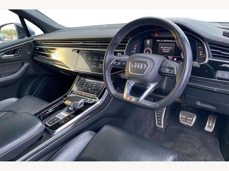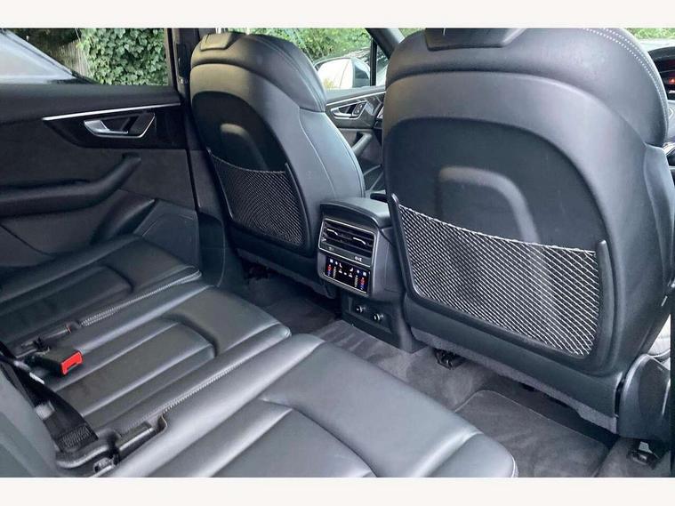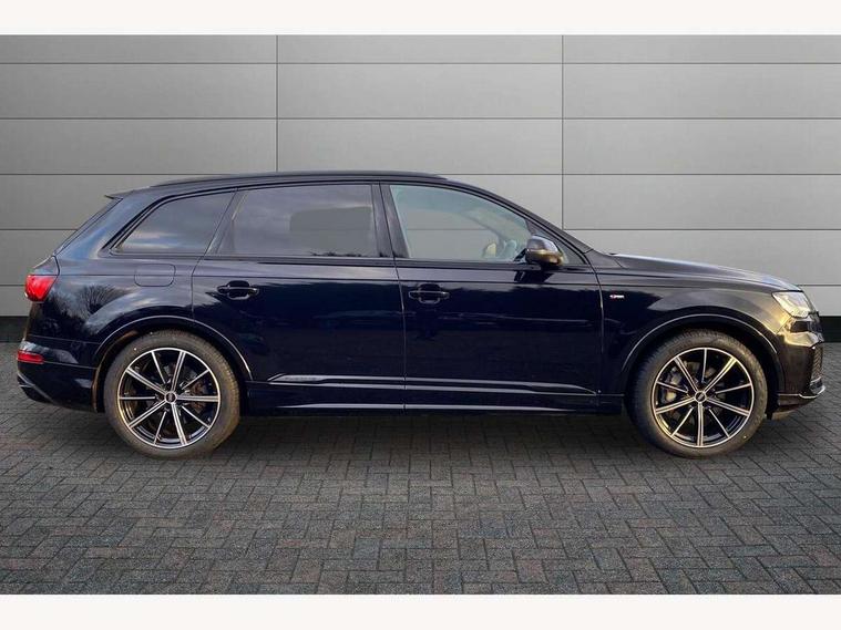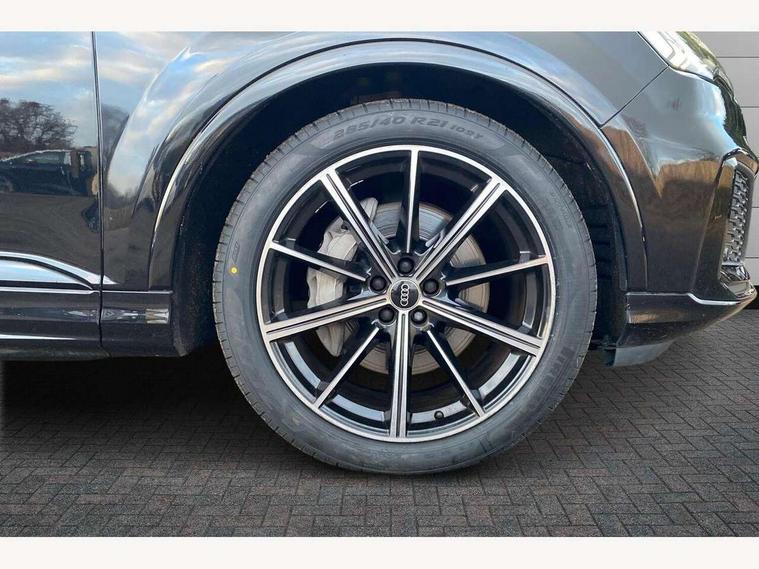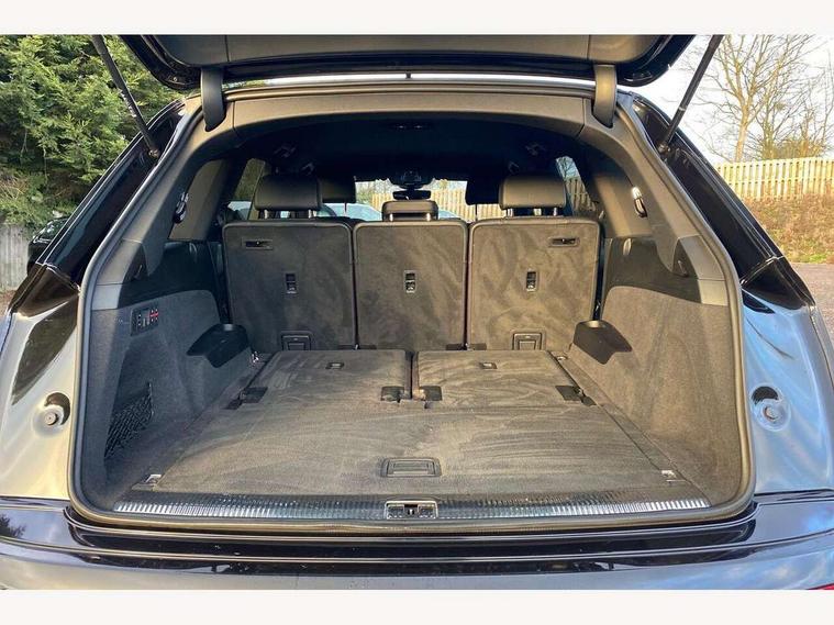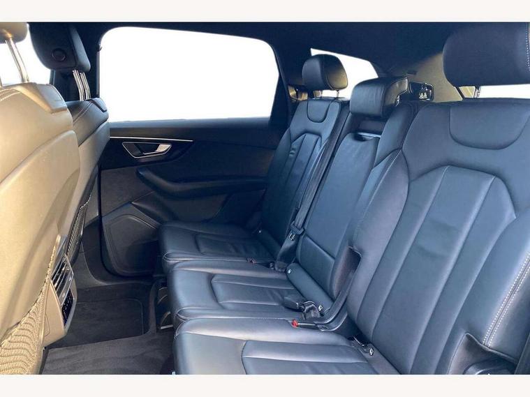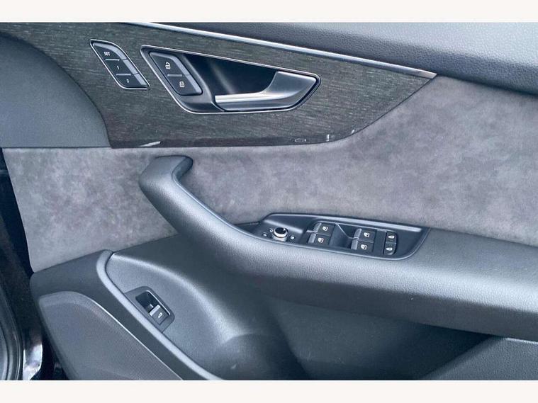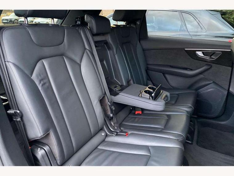 Audi connect safety and service (e-call), Audi drive select (Auto, Comfort, Dynamic, Individual, Off-road and All road), Audi phone box with wireless charging, Audi smartphone interface includes wireless Apple carplay/Android Auto, Camera based traffic sign recognition, Electromechanical steering, MMI navigation plus with MMI touch screens includes 10.1" and 8.6" screens with haptic feedback, Natural voice recognition, Parking system plus - front + rear sensors, Power operated tailgate, Rear view camera, Start/stop system, 48V Mild hybrid technology, Adaptive air sports suspension, Quattro all wheel drive with self locking centre differential, Audi music interface - front 2 USB-C ports with charger and data functions, Audi sound system with 6 channel amplifier, 180 watt amplifying capacity and 10 loudspeakers including subwoofer, DAB digital radio module, Audi matrix LED headlights with dynamic front and rear indicators, Auto dimming frameless rear view mirror, Black roof rails, Bumpers in contrast paint scandium grey finish includes door trim and wheel arch trim strips, inlays in door strip contain quattro embossing, Electrically adj heated/folding + automatically dimming exterior mirrors with memory + automatic kerb side function for passenger side exterior mirror, Heat insulating glass in windshield, Integrated LED indications in door mirrors, LED daytime running lights, LED rear tail lights, Privacy glass - dark tinted rear and rear side windows from B-pillar backwards, 4 zone deluxe automatic climate control, 7 seat layout with ISOFIX points for the front passenger seat and rear passenger seat, Black cloth headlining, Comfort front centre armrest, Folding rear seats, Front head restraints, Front/rear floor mats, Heated front seats, LED interior ambient lighting, Luggage compartment cover, Luggage compartment sill protection in stainless steel, Rear head restraints, Stainless steel pedals, Sunvisors with illuminated vanity mirrors, Tool kit, Titanium black styling pack - Q7/SQ7, 3 point seatbelts on all rear seats, Audi pre sense front, Driver and front passenger, front side and curtain airbags, Electromechanical parking brake, Electronic Stabilisation Control (ESC) including ABS, ASR and EDL, Extended pedestrian protection measures, Hill hold assist, Seatbelt monitoring, Tyre pressure loss indicator, Warning triangle and first aid kit, Anti theft alarm, Anti-theft wheel bolts and wheel loosening detection, Keyless go with remote central locking, Polished oak trim with grey finished, Tyre repair kit,