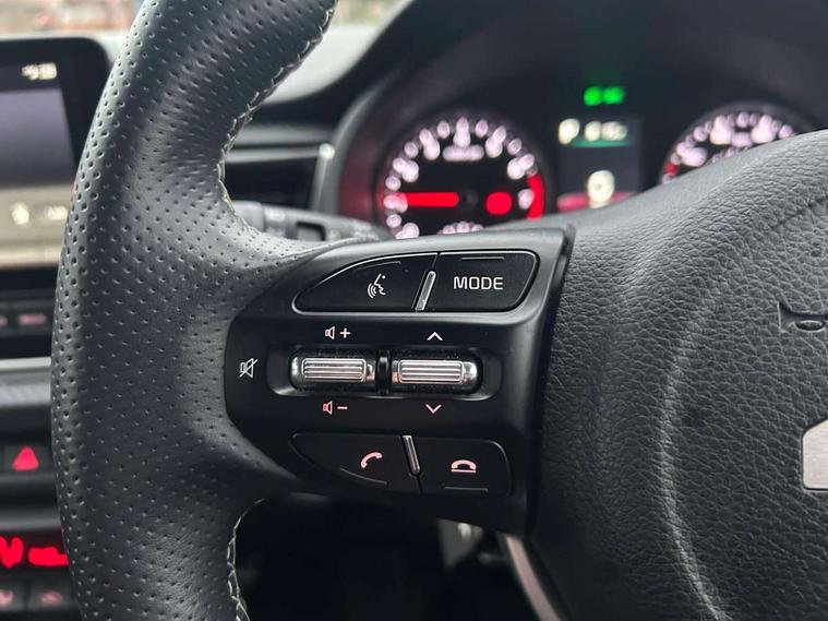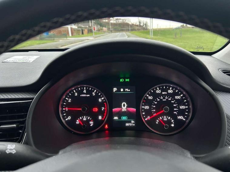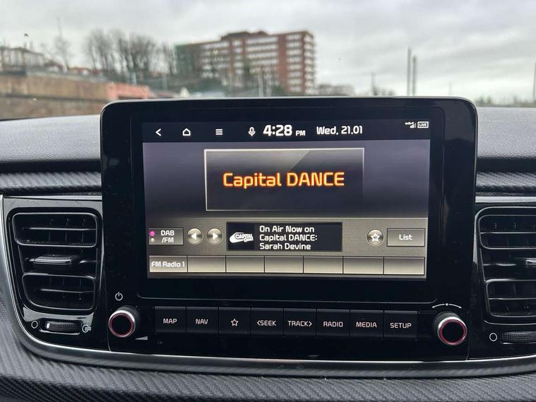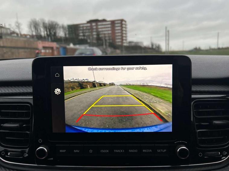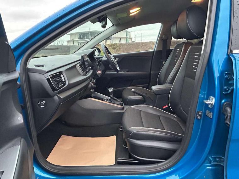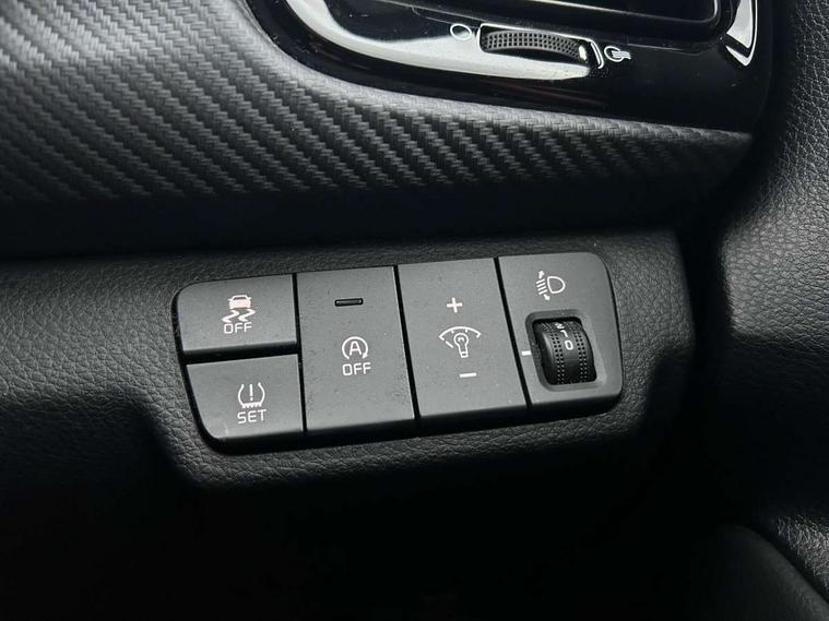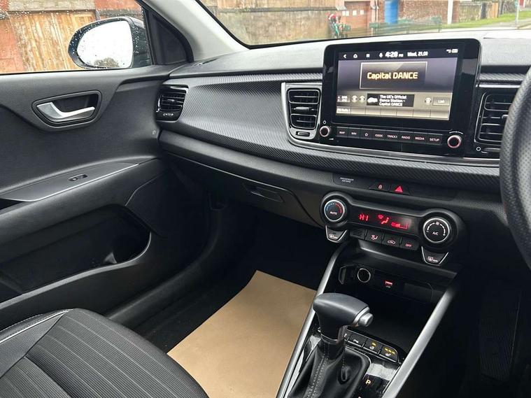8" touchscreen navigation, Apple car play/Android Auto, Blind spot collision warning, Cruise control + speed limiter, Digital clock, Drive mode selector, Electric power steering, Emergency call service, Emergency stop signalling system, Front parking sensor, Gear selection indicator, Kia Connect (UVO), Manual speed limit assist (MLSA), Outside temperature display, Rear parking sensor, Reversing camera system with dynamic guidelines (Integrated into centre fascia screen), Tachometer, Tailgate, Trip computer, Voice control system, Windscreen washer level indicator, Intelligent Stop and Go, 6 speakers, Bluetooth connectivity including audio streaming, DAB Digital radio, Front USB port for media connection, Rear USB port, Steering wheel mounted audio controls, Aeroblade-type front wipers, Auto dimming rear view mirror, Automatic defog system, Automatic lighting control, Bi-function projection headlights, Body colour door handles, Chrome side window trim, Cornering light, Electric adjustable/heated/folding door mirrors, Front electric windows with driver's auto up/down function, Gloss black and dark chrome surround radiator grille, Headlamp levelling, Heated rear window, High gloss black door mirrors, High Gloss Black rear spoiler, LED "Ice-Cube" Front Fog Lights, LED daytime running lights, LED indicators in door mirrors, LED rear fog light, LED third brake light, Privacy glass (Rear Windows and Tailgate), Rain sensing front wipers, Rear electric windows, Rear side wing doors, Rear wash/wipe, Speed variable front wipers, Sports front bumper, Sports rear bumper, Tinted glass, Twin exhaust pipes, Welcome home function, 3 passenger assist grips, 3 seat bench in 2nd row, 60/40 split/folding 2nd row of seats, All round height adjustable headrests, Automatic air conditioning, Centre Console with Storage Box and Sliding Armrest, Cloth/faux leather upholstery with grey stitching, Dash illumination dimmer switch, Driver's seat height adjuster, Driver/passenger sunvisors and illuminated vanity mirrors, Front and rear door map pockets with bottle holder, Front passenger seatback pockets, Front USB charger port and 12V socket, Heated front seats, Heated steering wheel, ISOFIX top tethers and lower anchor points, Leather D cut steering wheel, Leather trimmed gearshift, Load area light, Luggage area parcel shelf, Luggage hooks, Metal pedals, Overhead console with sunglasses holder, Satin chrome interior door handles, Single front passenger seat, Tilt/telescopic adjustable steering wheel, Advanced driving assistance pack - Rio, 3-point front seatbelts, 3x3 point rear seatbelts, ABS with Electronic Brakeforce Distribution (EBD) and Brake Assist System (BAS), Automatic unlocking of doors in case of impact, Cornering brake control (CBC) and Straight line stability (SLS), Electronic stability control (ESC) and vehicle stability management (VSM), Front seatbelt pretensioners + load limiters, Height adjustable front seatbelt anchors, Hill start assist control (HAC), Passenger airbag deactivate switch, Rear child proof door locks, Seatbelt warning, Traction control, Twin curtain airbags, Twin front airbags, Twin front side airbags, Tyre pressure monitoring system, Anti theft alarm, Deadlocking system, Engine immobiliser, Locking wheel nuts, Smart key with engine start/stop button, Speed sensitive auto door locking, Visible vehicle identification number, Carbon Fascia Trim, 17" Alloy wheels, Tyre mobility system,