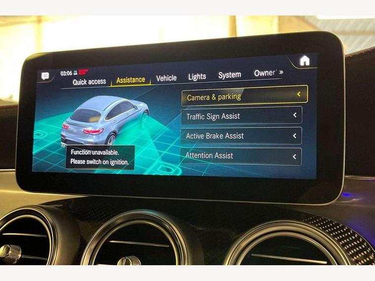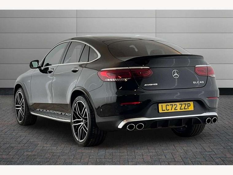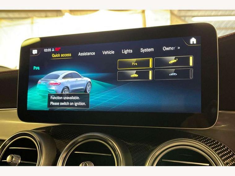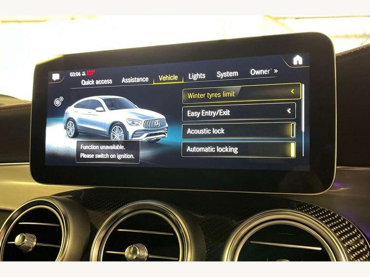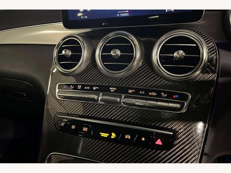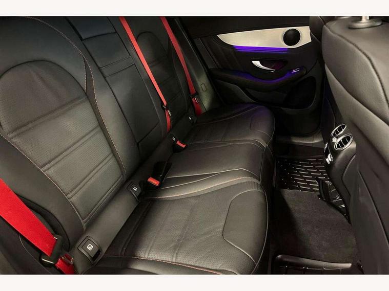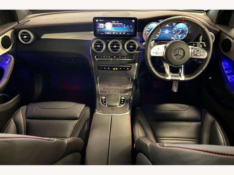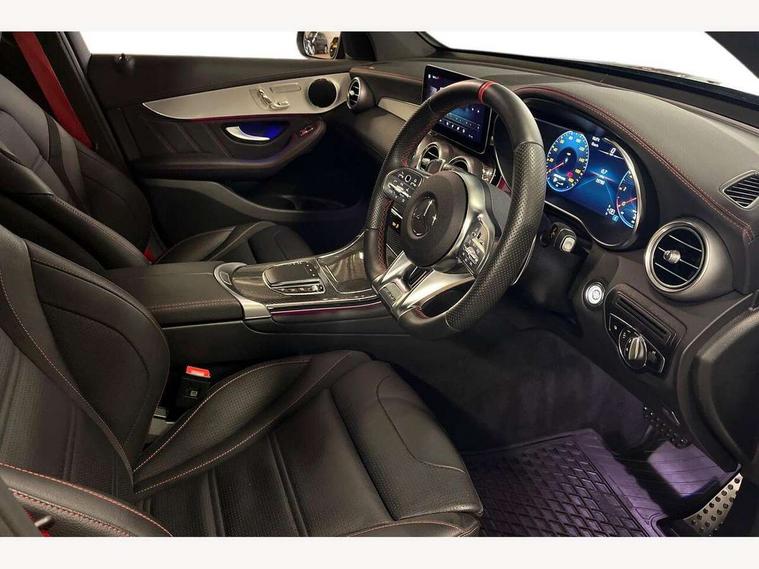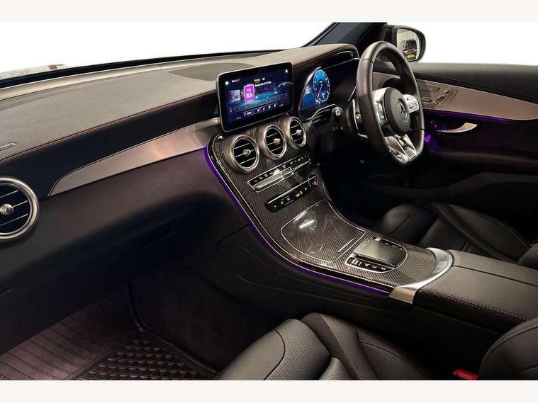 360 degree view camera, Active parking assist with parktronic system, Attention assist, Bluetooth interface for hands free telephone, Collision prevention assist plus, Cruise control with speedtronic variable speed limiter, Direct steer speed sensitive steering, DYNAMIC SELECT with a choice of driving modes (ECO, Comfort, Sport, Sport+ and Individual), Easy pack automatic powered tailgate, eCall emergency call system, ECO start/stop function, Hard disk navigation, Hey Mercedes Voice activation, Instrument cluster with12.3-inch digital instrument cluster display. High resolution instrument cluster screen with choice of three display styles, MBUX Interior assistant, Mercedes connect me with remote online services, Multi function trip computer, Outside temperature display, rear seatbelt status indicator, Remote boot release, Service indicator (ASSYST), Smartphone integration with Apple CarPlay and Android auto, Traffic sign assist, 66 litre fuel tank, AMG electronic rear axle limited slip differential lock, AMG performance 4MATIC+, AMG ride control air suspension for front and rear axles with continuously adjustable damping, AMG SPEEDSHIFT TCT 9G 9-speed automatic transmission with steering column gear selector, DIRECT SELECT steering wheel gearshift paddles, Petrol Particulate Filter (PPF), Advanced sound system, MBUX multimedia system with DAB digital radio and touchpad, Media display 10.25-inch touchscreen display, Pre installation for Mercedes Benz Link, USB ports x 2 in centre console, Adaptive brake lights, Adaptive high beam assist, AMG bodystyling front apron in jet wing design with silver chrome front splitter, AMG bodystyling with 2 black louvres in outer air intakes, AMG bodystyling with rear apron and diffuser fins, AMG bodystyling with side sill panels, AMG Performance exhaust, AMG radiator grille with black vertical louvres and trim strip in high gloss chrome, AMG spoiler lip, Body colour door mirrors, Body coloured bumpers, Electric sliding glass sunroof, Electric windows one touch open/close, Electrically adjustable and heated door mirrors, Front, side and rear exterior chrome trim, Headlamp assist automatic headlamp activation, High level LED brake light, LED high performance headlamps with integrated LED daytime running lights, LED tail lamp, Motor way mode function and locator lighting, Privacy glass with dark glass from B pillar backwards, Rain sensor windscreen wipers, Range adjustable headlights, Rear side wing doors, Rear wiper, Roof spoiler, Running boards, Tinted glass all round with single layer safety glass, Tinted rear windows, Two chrome plated tailpipe trim elements, Variable front intermittent wipers, 2 way rear head restraints, 3 seat bench in 2nd row, 40:20:40 split folding rear seats, Ambient lighting, AMG floor mats with edging and embroidered AMG lettering, AMG illuminated door sills, AMG sports seats, Artico man-made leather upper dashboard with contrast topstitching, Automatic child seat recognition sensor, Black roof lining, Dividing net - rear, Double cup holder in centre console, Easy-pack removable load compartment cover, Electric height/reach adjustable steering column, Flat bottomed multifunction sports steering wheel in black nappa leather, embossed in central grip, with silver chrome steering with red topstitching, Front armrest with storage box, Front door sills with Mercedes Benz lettering, Front head restraints, Front passenger seat, Heated front seats, Heated steering wheel, Illuminated and lockable glove compartment, Leather upholstery, Rear top tether child seat ISOFIX attachment, Sports pedals with stainless steel surfaces and rubber studs, Steering wheel with touch control buttons, THERMOTRONIC 3 zone automatic climate control, Interior lighting pack - GLC, Memory pack - GLC, Mirror pack - GLC, Storage pack - GLC, 3 rear 3 point seatbelts, Active bonnet, Adaptive brake system with HOLD function and brake drying in the wet, ASR, Brake calipers with Mercedes-Benz lettering + perforated brake discs, Child proof door locks, Dual-stage airbags - driver and front passenger, driver knee bag and window bags for driver, front passenger and rear passengers, Electronic parking brake, Electronic stability programme (ESP) with curve dynamic assist and cross wind assist, Front and rear seatbelt reminder, Front passenger seat occupancy sensor, Hill hold function, MANUFAKTUR seat belts in red, Tyre pressure monitoring system, Warning triangle and first aid kit, Alarm system/interior protection/immobiliser, Automatic door locking, Keyless Go entry and starting function, Remote central locking, AMG carbon-fibre with light longitudinal grain aluminium trim, 21" AMG 5 twin spoke design alloy wheels painted in black with high sheen finish, Summer tyres, Tirefit tyre sealant kit,