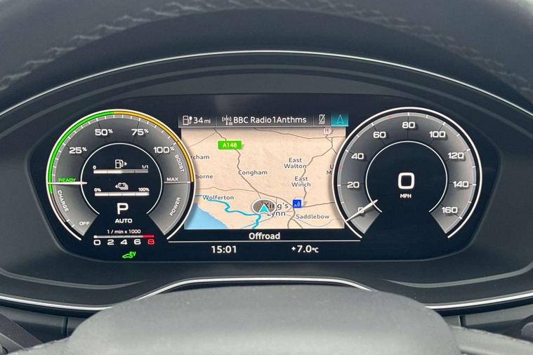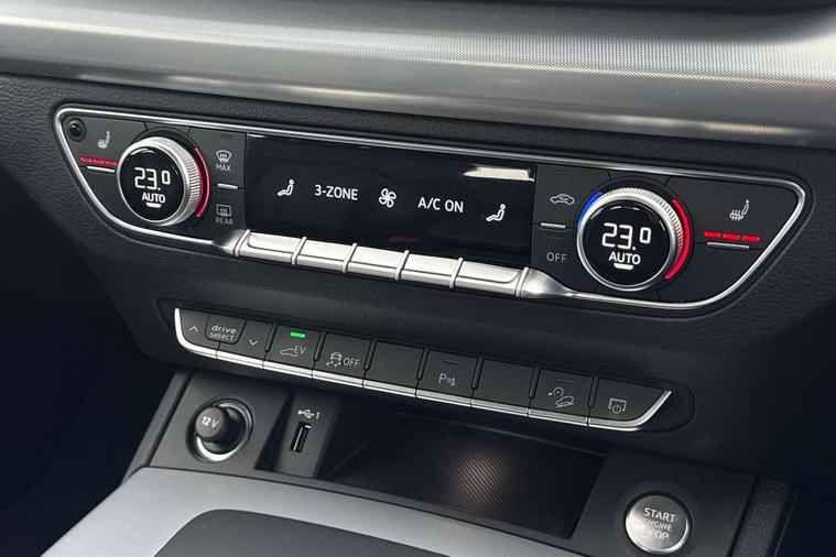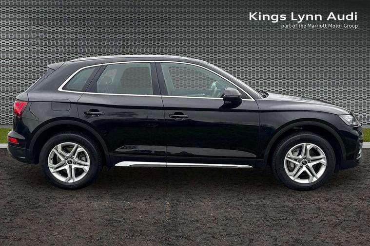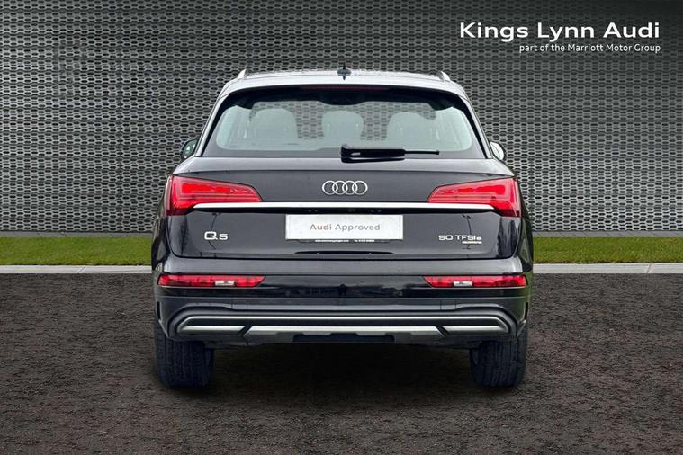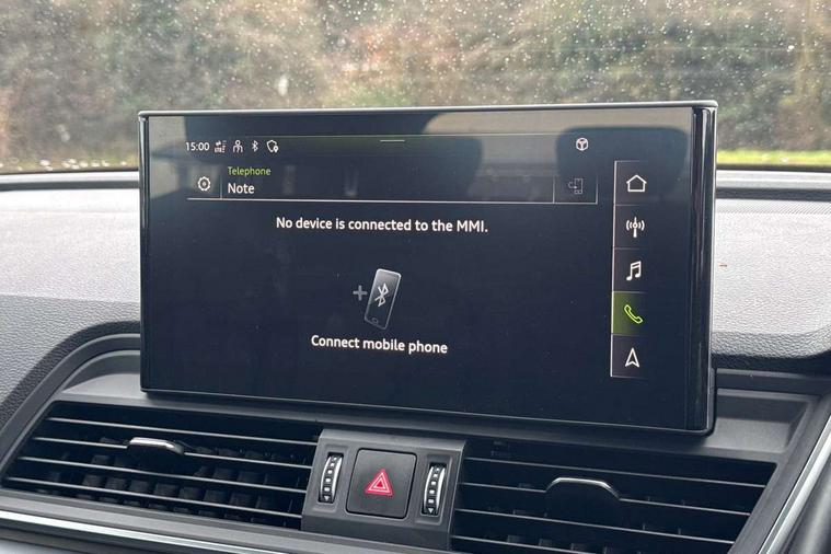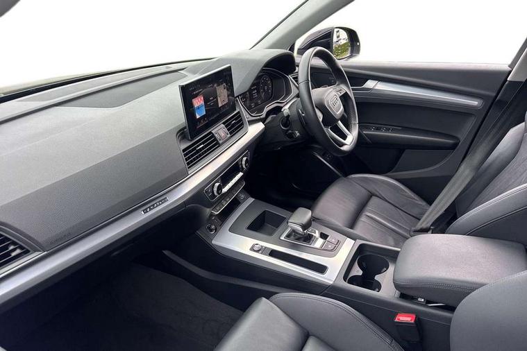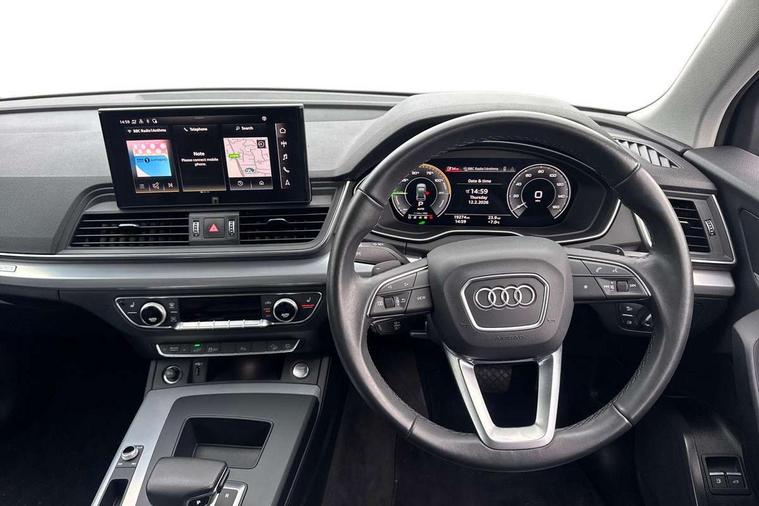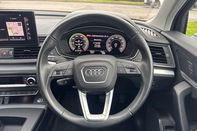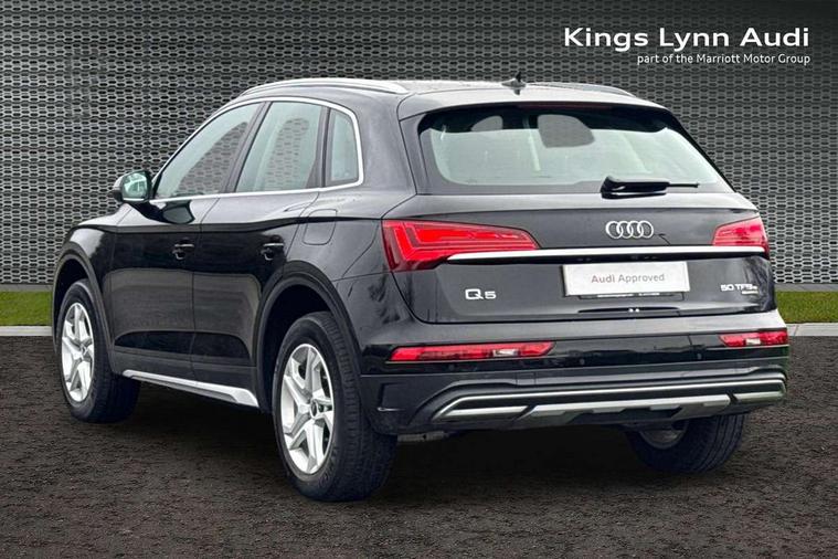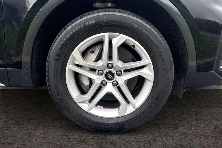 Audi connect safety and service (e-call), Audi connect with Amazon Alexa Integration, Audi drive select, Audi virtual cockpit plus with 12.3" screen and three different layout designs, Audi wireless smartphone interface, Automatic start-stop system with coasting functionality and efficiency programme, Bluetooth interface, Cruise control + speed limiter, Electro - mechanical power assisted steering, MMI navigation plus with 10.1" touch screen, Power tailgate, Reversing camera, Service interval indicator, Voice control system with Audi hotword activation "Hey Audi", 3 pin 10 amp domestic charging cable, 7.4 kW onboard charger, Dynamic suspension, Quattro on demand, Type 2 mode 3 22kW 32 amp charging cable, Type 2 socket for AC charging, 2 x USB charging port with aux input socket, DAB Digital radio, 3rd brake light, Acoustic windscreen, Air inlets in matt titanium black with blades in matt aluminium silver, Aluminium roof rails, Auto dimming door mirrors, Auto dimming rear view mirror, Automatic headlight adjustment, Automatic headlights and windscreen wipers, Body colour bumpers, Body colour door mirrors, Chrome plated exhaust trims, Daytime running lights, Door sills in Selenite silver, Electric adjustable/heated/folding door mirrors, Front and rear electric windows, LED headlights and LED tail lights, Lower bumpers painted in contrast Manhattan grey, Matt selenite silver underbody protection, Matt twilight grey radiator grille with chrome vertical struts, Rear chrome trim strip below lights, Rear diffuser strip in selenite silver, Rear side wing doors, Rear spoiler, Rear wiper, Roof bars, 3 rear headrests, 3 spoke multifunction leather steering wheel with shift paddles, 40:20:40 split folding 3 rear bench seat in 2nd row with rear centre armrest, Comfort front centre armrest, Deluxe 3 zone electronic climate control, Door sills trims with aluminium inlays, Front/rear floor mats, Heated front seats, Height adjustable front head restraints, Height/reach adjustable steering column, ISOFIX child seat mounting and top tether, Luggage compartment cover, Manual seat adjustment with 4-way electric lumbar support, Rear seat bench plus, Silver cloth headlining, Single front passenger seat, Sunvisors with vanity mirrors, Trunk roller cover, Twin leather upholstery + front sports seats, High gloss pack - Q5, LED interior light pack - Q5, 3 point seatbelts on all seats, 6 airbags - Driver, front passenger, curtain and side airbags, Electrically operated child locks on rear doors, Electromechanical parking brake, Electronic stabilisation control including ABS, ASR and EDL, Front passenger airbag deactivation, Hill descent control, Hill hold assist, Multi collision brake assist, Pop-up bonnet for pedestrian protection, Pre sense city, Seat belt force limiter, Seatbelt monitoring, Tyre pressure warning, Warning triangle and first aid kit, Anti theft alarm, Anti-theft wheel bolts, Keyless Go access/ignition system, Remote central locking, Aluminium rhombus inlay, 18" 5 twin spoke dynamic design alloy wheels, Tool kit, Tyre repair kit,