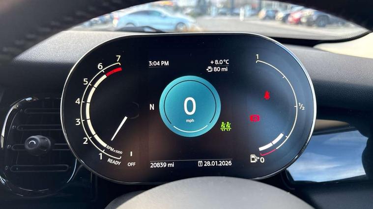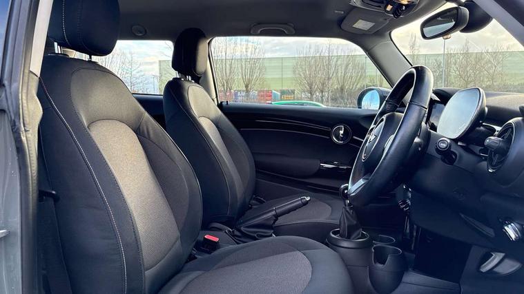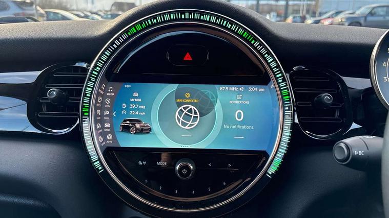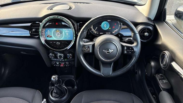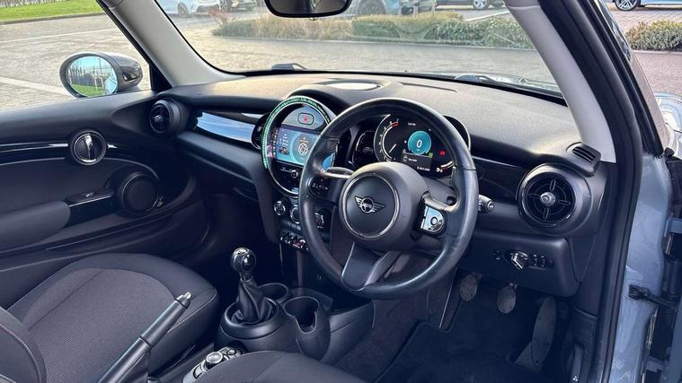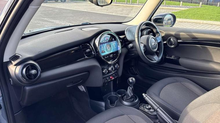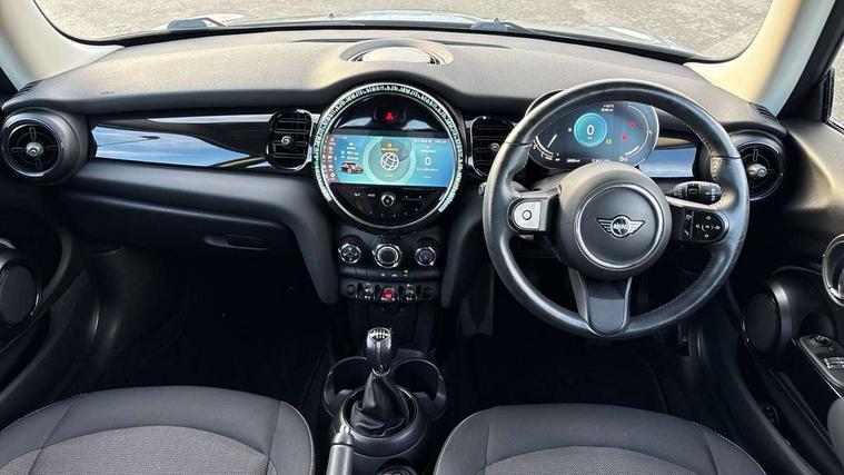 Automatic start/stop function with brake energy recuperation, Compatible mobile phone bluetooth with audio streaming, Cruise control with brake assist, Electro-mechanical speed dependant steering assistance, Flexible car sharing preparation, Instrument cluster, Mini E-call, MINI TeleServices, On board computer, Service interval indicator, 6 Speed manual transmission including gear change indicator display, Double Vanos system, Fully variable valve control, High precision injection, Performance Control, 4 speakers in front door trims and underneath front seats, 8.8" touchscreen with LED ring, FM tuner and DAB digital radio, Automatic headlight activation switch, Body colour fuel filler cap, Chrome border high gloss black slats radiator grille, Dynamic brake lights, Electric front windows, Exhaust tailpipe on left with chrome finisher, Heated rear window, Heated windscreen washer jets, LED headlight with closed ring and daytime driving lights, Metal door sill strips with MINI imprint, Model logo Cooper on right of tailgate, Rain sensor window wipers, Rear fog lights, Rear LED lights with union jack design, Rear window wiper, Side scuttle panel with integrated indicator, Sun/heat protection glass, White indicator lenses, 12V Accessory socket in centre console, 4 lashing eyes in luggage compartment, 60/40 split folding rear seat, Ambient lighting, Carbon black colour line - Knee roll and door armrest, Chrome interior highlights, Cupholders, Front and rear head restraints, Front and rear isofix with front passenger airbag deactivation, Glove compartment, Height and length steering column adjustment, Interior lighting with 12 different colours across the dashboard, underneath door bezel with illuminated laser-engraved design on central display, Leatherette gearshift lever and handbrake gaiters, LED reading lights, vanity mirror lights, front foot well light and spotlight on front seats, Manual air conditioning, Mechanical seat adjustment - forward/back & backrest for front seats and driver seat height adjust, Multifunction steering wheel, Passenger seat height adjuster, Satellite grey headlining including grab handles and clothes hooks, Sport leather steering wheel with speed limiter and audio/communication controls, Storage compartments in doors, Sunvisors with vanity mirrors, Velour floor mats, 3 point seatbelts on all four seats, 6 Airbags - front, side, head and seat belt tensioners, Anti-lock braking system (ABS), DSC - Dynamic Stability Control, Front and rear disc brakes, Single tone fanfare horn, Tyre pressure monitoring system, Alarm system with tilt sensor, monitoring doors, bonnet interior and tailgate, Electronic vehicle immobiliser, Start/stop toggle with keyless go, Piano black interior trim, Tool kit, Tyre repair kit,