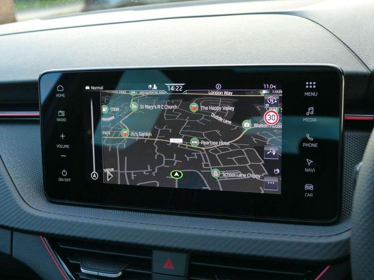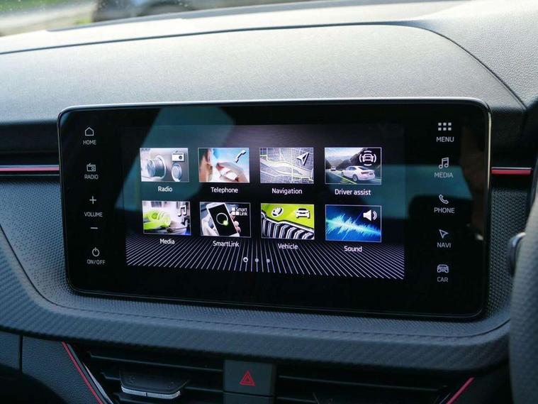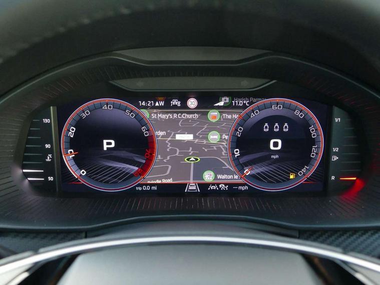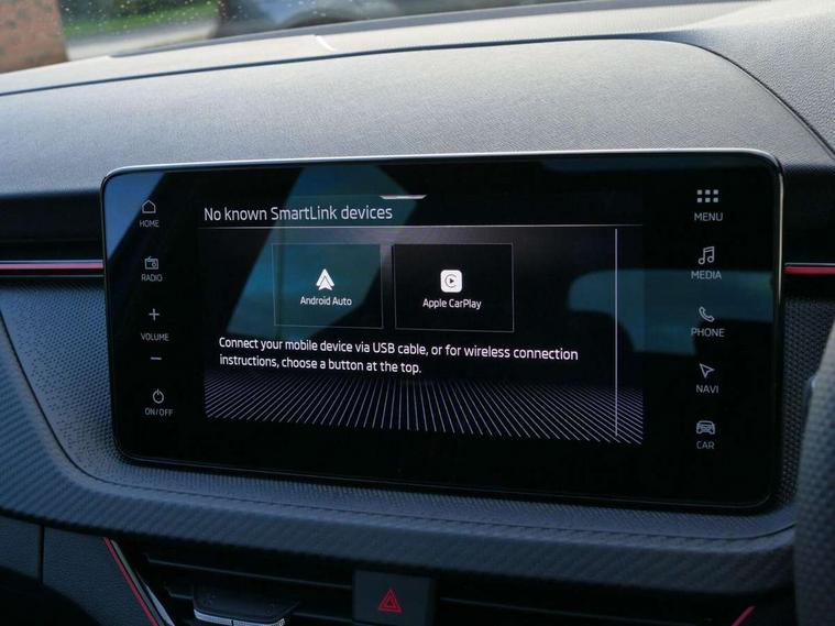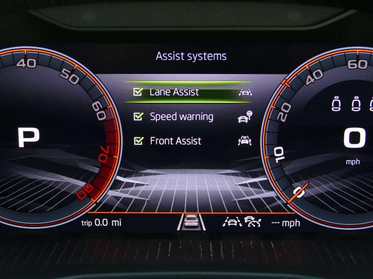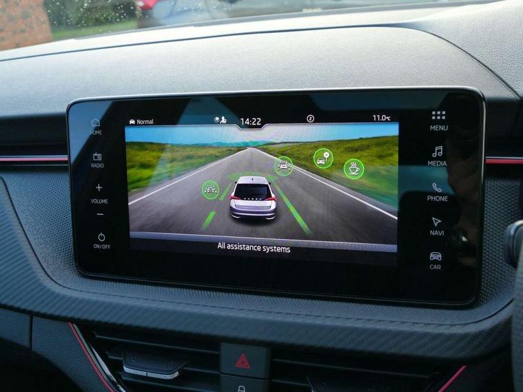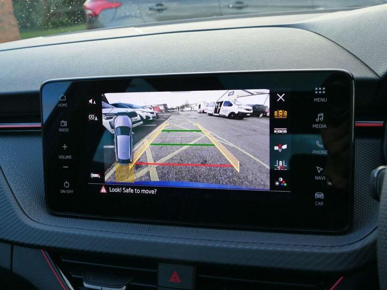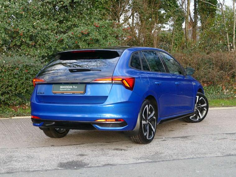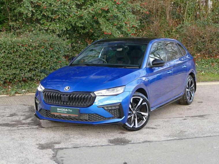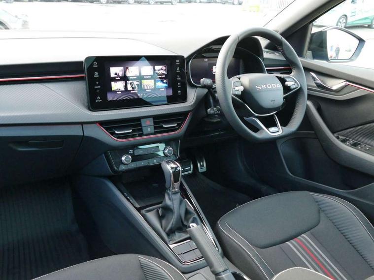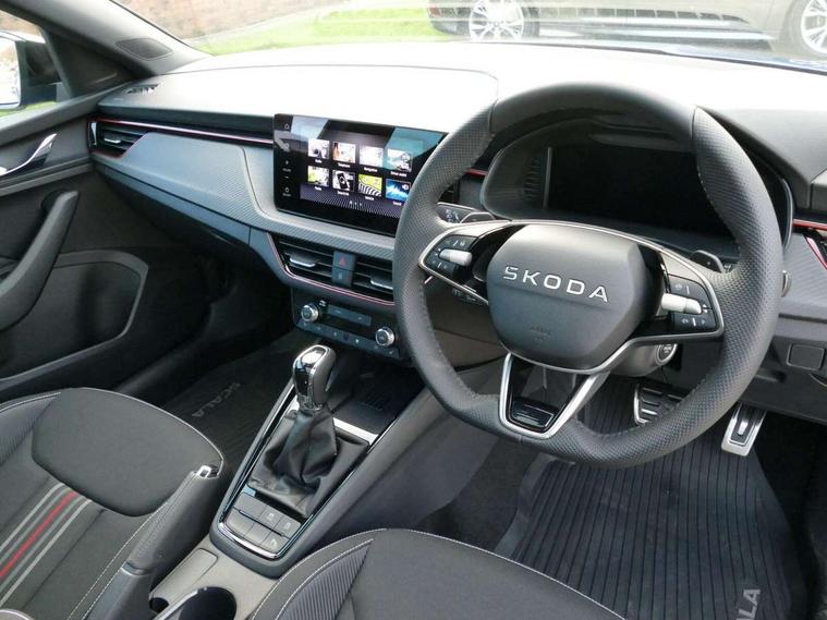 Advanced driver attention and drowsiness monitor, Bluetooth, e-Call (emergency call), Front assist system, PAS, Rear parking sensors, Rear view camera, Speed limiter, Tailgate, Traffic sign recognition, Virtual Cockpit - 10.25" digital display, Voice control system, Wireless smartlink, Drive mode select with Sport Chassis Control and ECO mode, 4 USB C ports, 8 Speakers, 9.2" Skoda navigation display, DAB radio, Auto dimming rear view mirror, Automatic headlight control with manual coming and leaving home feature, Automatic intermittent wipers, Black door mirrors, Black lettering on boot lid, Black radiator grille, Black rear diffuser, Black roof spoiler, Black window frames, Body colour bumpers, Body colour door handles, Extended tailgate glass, Front and rear electric windows, Heated rear window, LED 3rd brake light, LED daytime running lights, LED high beam, LED low beam, Light sensors, Monte carlo plaque, Panoramic glass roof, Privacy glass, Rear LED fog light, Rear side wing doors, Rear wiper, Tinted windows, Unique dark chrome design logo on alloy wheels, 12V socket in luggage compartment, 3 seat bench in 2nd row, Aluminium pedals, Ambient lighting in white/red, Black / White armrest stitching, Black roof headlining, Cargo elements, Chrome inner door handles, Door inserts in art.leather carbon, Driver and passenger sun visors with vanity mirror, Dual zone climate control, Front and rear roof lights, Front centre armrest, Front head restraints, Height adjustable driver seat, Height adjustable passenger seat, Ice scraper, Illuminated glove compartment, Inner circulation control with pollen filter, ISOFIX for front passenger seat, Isofix preparation for back seats, Leather gearknob and handbrake lever, Luggage net under rear parcel shelf, Manual lumbar support for front seats, Monte Carlo cloth upholstery, Net package and top tether hooks in boot space, Pocket on the back of both front seats, incl. mobile phone pockets, Rear centre armrest, Red hotstamping, Single front passenger seat, Skoda lettering on steering wheel, Sport seats, Textile floor mats, Third rear headrest, Ticket holder, Top tether for front passenger seat, Umbrella in driver's door, Light and view plus pack - Scala, 3x3 point rear seatbelts, ABS, Child locks, Curtain airbags and front side airbags, Disc brakes, Driver and front passenger airbags, ESP, Hill hold control, Manual leather parking brake, One tone horn, Passenger airbag switch off function, Seatbelt reminder for driver and front passenger, Tyre pressure monitoring system, Anti theft alarm system with interior monitoring, backup horn and towing protection, Anti-theft wheel bolts, Remote central locking with 2 remote folding keys, SAFE function for remote central locking, Carbon effect decorative inserts, 18" Ursa black diamond cut alloy wheels,