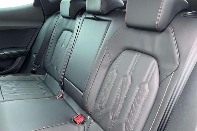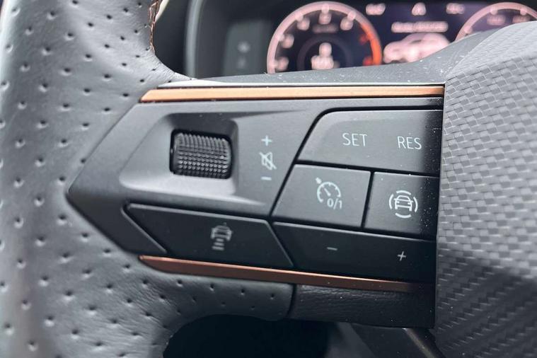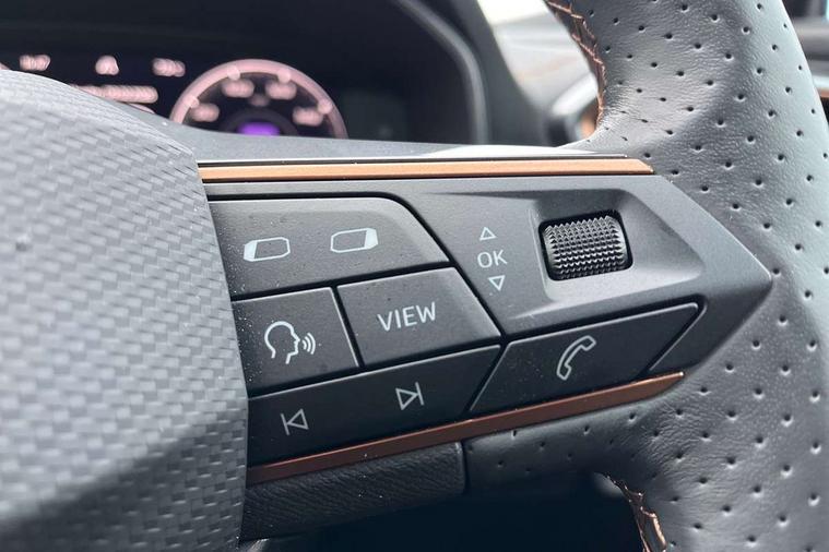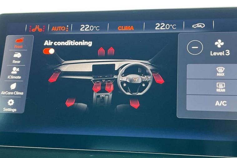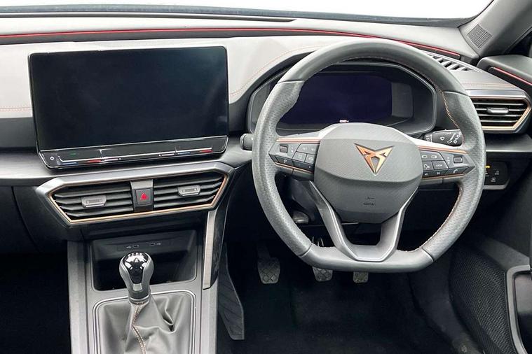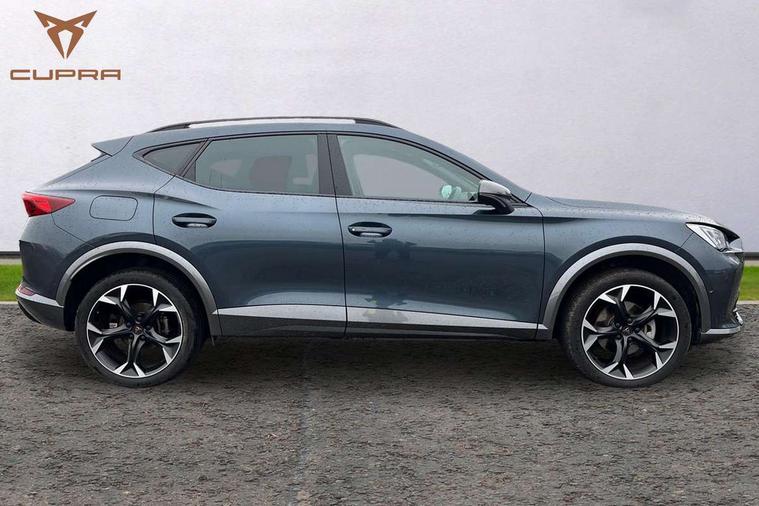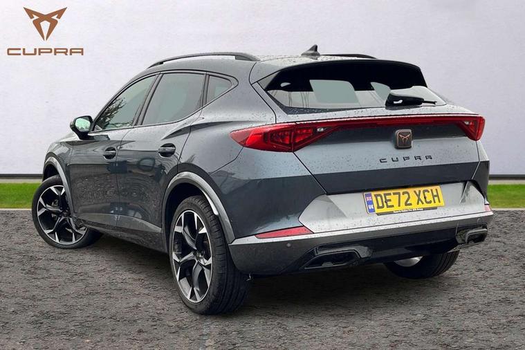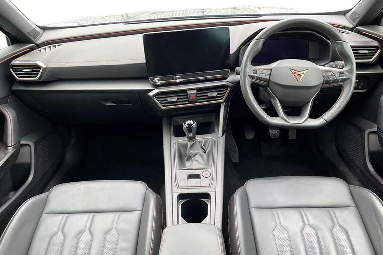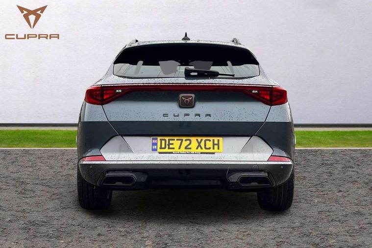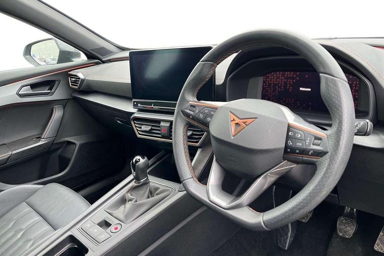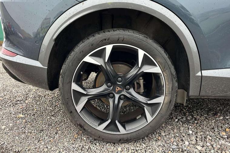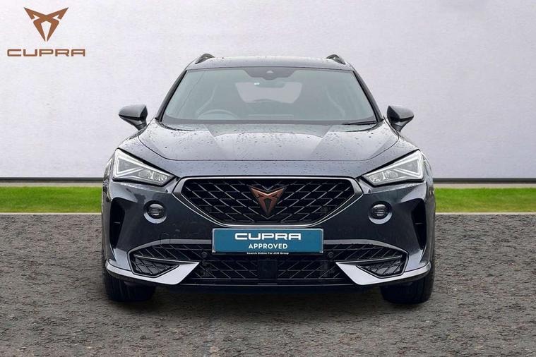 Digital cockpit and configurable dashboard, Driver alert system, Driving profile selection, Forward collision warning with automatic braking, Lane assist, Navigation system with 12'' Touchscreen Display, Park assist (inc front/rear parking sensors), PAS, Predictive adaptive cruise control with speed limiter, Rear view camera, RPM, trip computer, outside temp gauge, instrument light brightness, low fuel warning light, lights on reminder, gearshift indicator, Service interval indicator, Start/stop system with regenerative braking, Voice control system, Wireless apple carplay, Wireless phone charger, Electronic locking differential and dynamic traction support, Standard suspension, 2 front and 2 rear USB type C sockets, Auxiliary input socket, DAB radio, Auto dimming rear view mirror, Body colour door handles, Body coloured bumpers, Dark grey wing mirror, Daytime running light with automatic headlight control and coming home feature, Dynamic headlight range control, Electric front/rear windows, Electrically adjustable heated and folding door mirrors with memory function, Front fog lamps with cornering function, Gloss black roof rails and window surrounds, LED Headlights, LED Taillights with dynamic indicator, Rain sensing wipers, Rear diffuser with black simulated exhaust pipes, Rear side wing doors, Rear wash/wipe, Third brake light, Tinted rear windows, Welcome lights, 12v power supply in centre console, 12V socket, 12v socket in loadspace, 2 front and 2 rear reading lights, 230V socket, 3 seat bench in 2nd row, 60/40 split rear bench seat with armrest and mechanical seat release, Black headlining, Dust/pollen filter, Front and rear head restraints, Front centre armrest, Height/reach adjust steering wheel, Illuminated interior front door sills, Illuminated sunvisor with mirror, Isofix, Leather multi function steering wheel, Luggage tie-down hooks, Single front passenger seat, Three zone climate control with control panel in rear, Variable luggage/load compartment floor, Wraparound lighting, Genuine Nappa leather Pack - Cupra, Safety and driving pack (M) - Formentor, 3 point seatbelts on all rear seats, ABS, Brake control system - ESC and brake booster, Child proof door locks, Driver and front passenger airbags with front passenger airbag de-activation, Electronic parking brake, Front and rear disc brakes, Front side curtain airbags, Hill hold control, Public e-call, Seat belt reminder for front and rear seats, Tyre pressure monitoring system, Anti theft alarm system, Keyless entry and start system (KESSY), Locking wheel bolts, Copper and aluminium interior detailing, 19" 'Exclusive' machined sport matte black and silver alloy wheels,