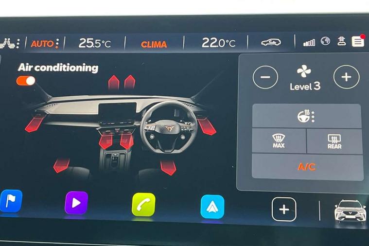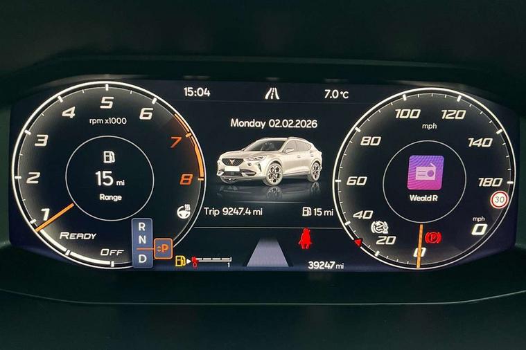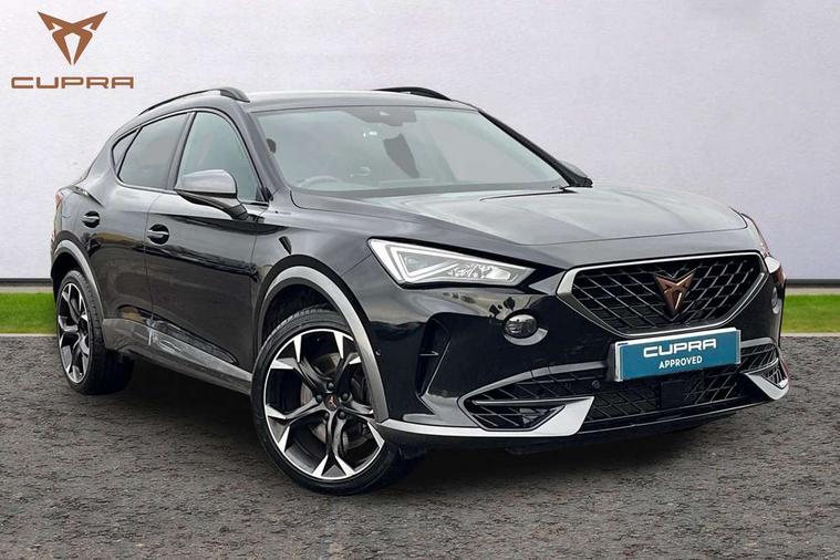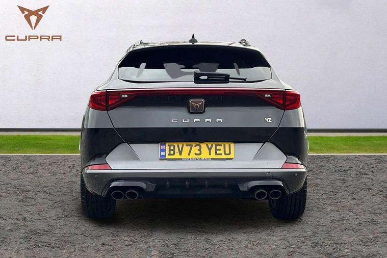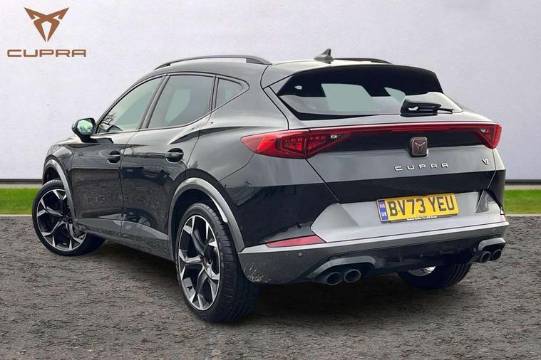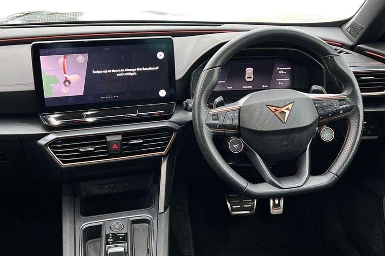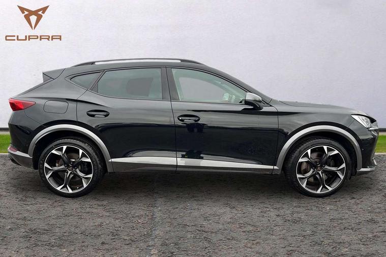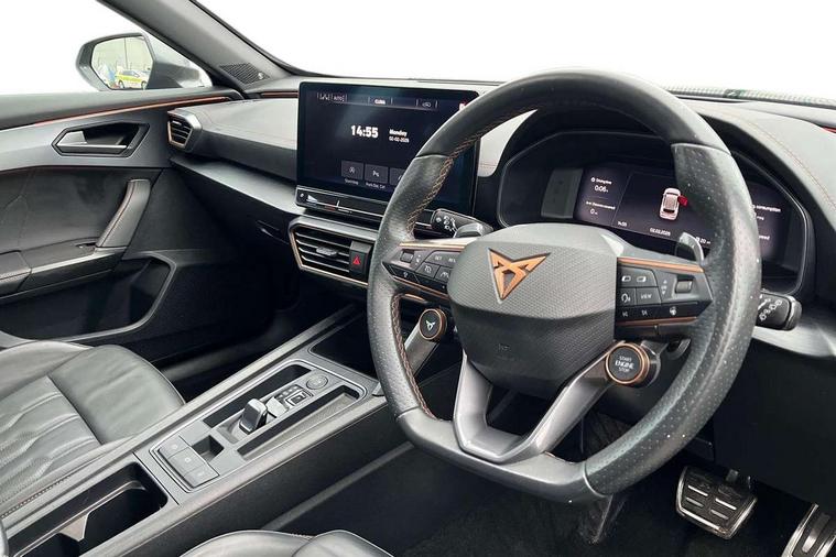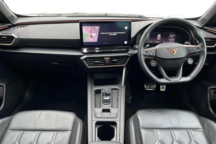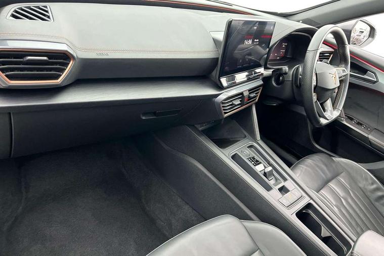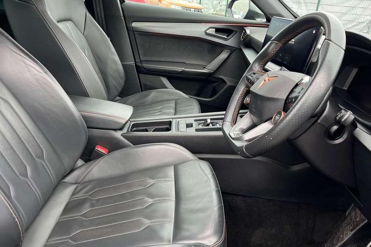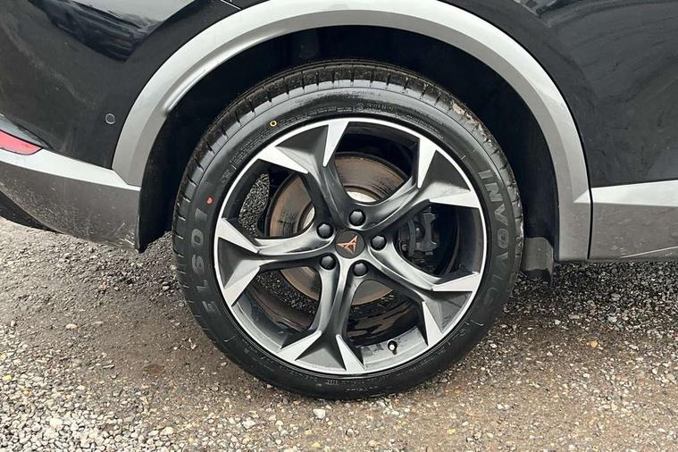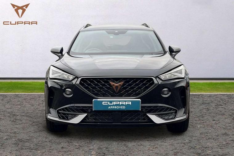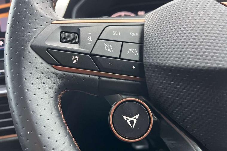 Digital cockpit and configurable dashboard, Driver alert system, Dynamic chassis control with driving profile selection (Comfort, Sport, CUPRA, Individual), Forward collision warning with automatic braking, Lane assist, Navigation system with 12'' Touchscreen Display, Park assist (inc front/rear parking sensors), Predictive adaptive cruise control with speed limiter, RPM, trip computer, outside temp gauge, instrument light brightness, low fuel warning light, lights on reminder, gearshift indicator, Service interval indicator, Speed sensitive power steering, Start/stop system with regenerative braking, Virtual pedal and electric tailgate, Voice control system, Wired Android Auto, Wireless apple carplay, Wireless phone charger, Electronic locking differential and dynamic traction support, Sports suspension with front shock absoption, 2 front and 2 rear USB type C sockets, Auxiliary input socket, DAB radio, Auto dimming rear view mirror, Body colour door handles, Body coloured bumpers, Dark grey wing mirror, Daytime running light with automatic headlight control and coming home feature, Dynamic headlight range control, Electric front/rear windows, Electrically adjustable heated and folding door mirrors with memory function, Front fog lamps with cornering function, Gloss black roof rails and window surrounds, LED Headlights, LED Taillights with dynamic indicator, Rain sensing wipers, Rear diffuser with twin exhaust pipe on each side, Rear side wing doors, Rear wash/wipe, Sports bumpers, Third brake light, Tinted rear windows, VZ logo rear badging, Welcome lights, 12v power supply in centre console, 12V socket, 12v socket in loadspace, 2 front and 2 rear reading lights, 230V socket, 3 seat bench in 2nd row, 60/40 split rear bench seat with armrest and mechanical seat release, Black headlining, Cupra sports pedals, Dust/pollen filter, Front and rear head restraints, Front centre armrest, Height/reach adjust steering wheel, Illuminated interior front door sills, Illuminated sunvisor with mirror, Isofix, Leather heated multi-function sports steering wheel with start stop, CUPRA mode button and gear shift paddles, Luggage tie-down hooks, Single front passenger seat, Three zone climate control with control panel in rear, Variable luggage/load compartment floor, Wraparound lighting, Genuine Nappa leather Pack - Cupra, Safety and driving pack (XL) - Formentor, 3 point seatbelts on all rear seats, ABS, Brake control system - ESC and brake booster, Child proof door locks, Driver and front passenger airbags with front passenger airbag de-activation, Electronic parking brake, Front and rear disc brakes, Front side curtain airbags, Hill hold control, Public e-call, Seat belt reminder for front and rear seats, Tyre pressure monitoring system, Anti theft alarm system, Keyless entry and start system (KESSY), Locking wheel bolts, Copper and aluminium interior detailing, 19" 'Exclusive' machined sport matte black and silver alloy wheels, Space saver spare wheel,