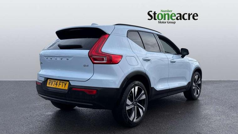 12.3" Progressive Driver Display, 360 degree surround view parking camera with side proximity sensors, 9" centre console portrait touch screen, Adjustable steering wheel force, Android auto (Wired), Apple carplay (wired), Bluetooth handsfree system, Driver alert control, Driver assistance (pilot assist and adaptive cruise control), Driver awareness - Blind spot information system with steer assist, cross traffic alert with autobrake and rear collision warning and mitigation, E-call, Front park assist, Google automotive services - Enabled entertainment apps, navigation with google maps, voice recognition with google assistant, Hands free power tailgate, Intelligent speed assistance, Lane keeping aid, Oncoming Lane Mitigation, Rear park assist, Speed sensitive steering, Volvo cars services with app - Driving journal, emergency and breakdown call, engine remote start, remote door locking/unlocking and vehicle dashboard, Wireless/Inductive Mobile Phone Charging, Automatic transmission with start/stop and manual change functions, Dynamic chassis, DAB Digital radio, Premium Sound by Harman Kardon, Dolby Pro Logic II Surround Sound, Dirac Unison, 12 speakers/600W and subwoofer, Steering wheel mounted remote controls, Active bending pixel LED headlights with adaptive shadow technology, Active high beam incorporating daytime running lights, Adaptive brake lights with high level LED brake lights, Auto dimming feature for exterior door mirrors, Auto dimming interior mirror, Automatic headlamp levelling, Dark tinted windows - rear side windows and rear screen, Front aluminium tread plates, Front and rear electric windows, Headlight cleaning system, High gloss black front and rear skid plate, High gloss black front bumper deco, High gloss black mesh front grille with high gloss black surround, High gloss black window trim, Home safe and approach lighting, Integrated roof rails in high gloss black, LED front fog lights with cornering function, Power glass tilt and slide panoramic sunroof with sun curtain, Puddle lights, Rain sensor with automatic windscreen wiper activation, Rear side wing doors, Rear wiper, Roof antenna, Roof spoiler, Visible VIN plate, 12V socket in front tunnel console and luggage compartment, 2-Zone electronic climate control with CleanZone air quality system and pollen filter, 3 seat bench in 2nd row, 3 Spoke tailored steering wheel with chrome trim, 60/40 versatile split folding rear seat, Centre console cupholders and storage, Flexible load floor and grocery bag holder, Floor mats, Front cabin courtesy lights, Front door pocket, front cupholder, ambient front door, rear reading, rear courtesy, instrument panel and tailgate lighting, Front footwell illumination, Front headrests, Front reading lights, Front seat cushion extensions, Front side step illumination (under door), Glovebox bag hook, Heated front seats, Height/reach adjustable steering column, High gloss centre tunnel deco, Illuminated glovebox, Illuminated luggage compartment, Illuminated vanity mirrors + ticket holder, Integrated waste bin, Isofix attachments on outer rear seats, Load cover, Load protection net, Multi directional lumbar support for driver and passenger seat, Power driver seat with memory + exterior mirrors memory, Power folding rear headrests, Power passenger seat, Rear armrest with cupholders, Single front passenger seat, Underfloor cargo storage, Climate pack without heated front seats - XC40, 3x3 point rear seatbelts, City safety with steering support with Pedestrian + cyclist + front collision warning with full auto brake and rear auto brake, Driver and passenger airbags, Drivers knee airbag, Electronic parking brake with auto hold, First aid kit, Front and outer rear seatbelt reminder and pretensioners, Front seats SIPS airbags, Hill descent control, Hill start assist, Inflatable curtain, Passenger airbag cut-off device, Power child locks on rear doors, Road sign information display, Run off Road Protection, SIPS (Side Impact Protection System), Slippery road and hazard light alert, Stability and Traction Control with Spin control, Engine Drag Control and Corner Traction Control, Tyre pressure monitoring system, Vehicle deceleration control with Anti-lock Brake System, Electronic Brake Distribution and Emergency Brake Assist, Warning triangle, WHIPS whiplash protection system - front, 2 x Key integrated remote control central locking including with deadlocking system and auto open/close windows and sunroof, Anti-theft alarm including immobiliser/volume sensor + level sensor, Keyless drive includes keyless entry and keyless start, Locking wheel nuts,