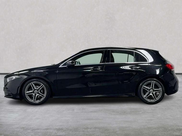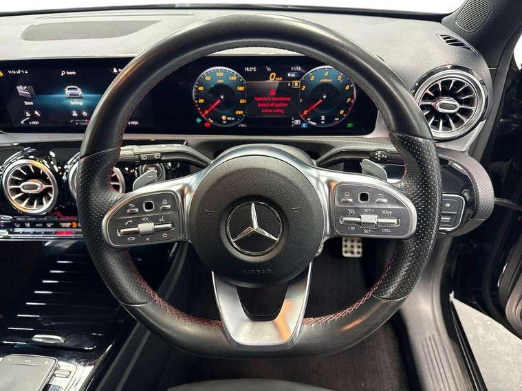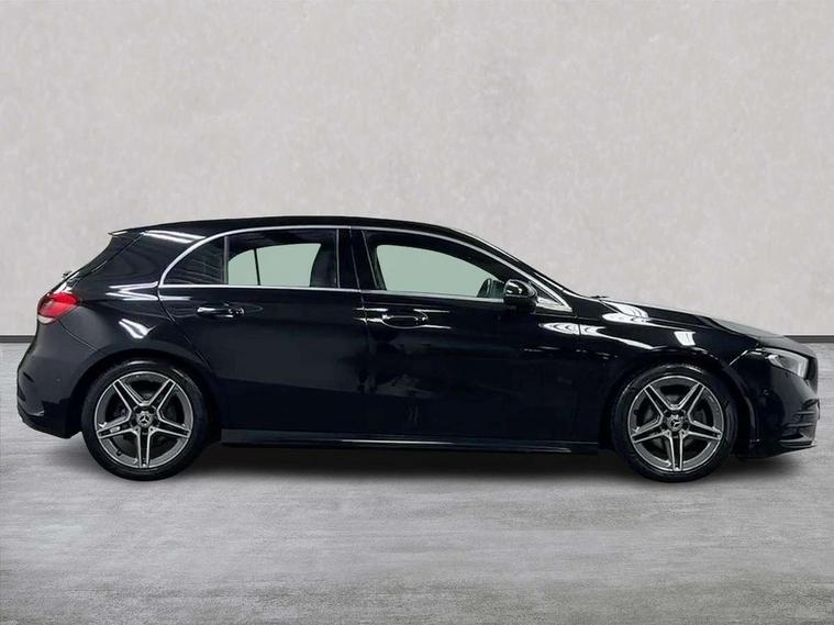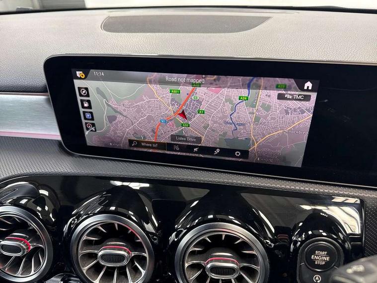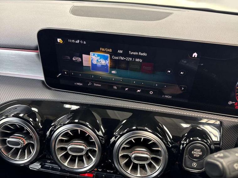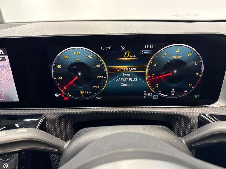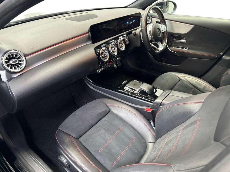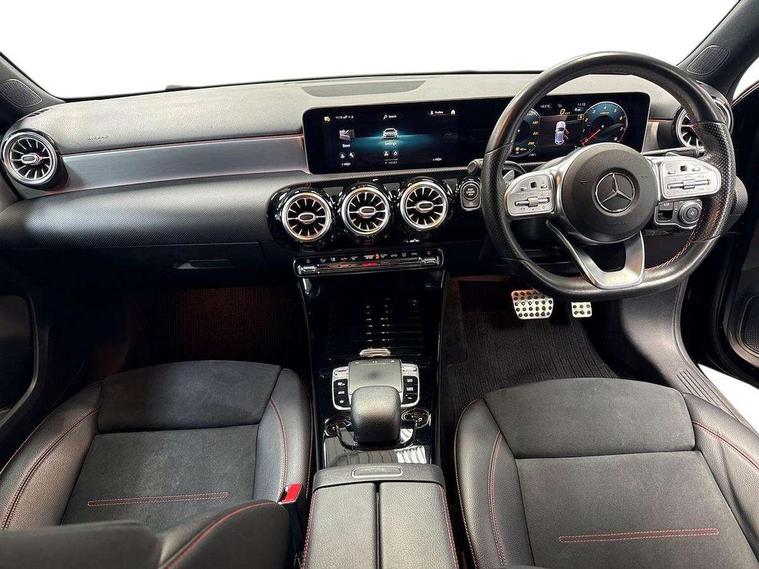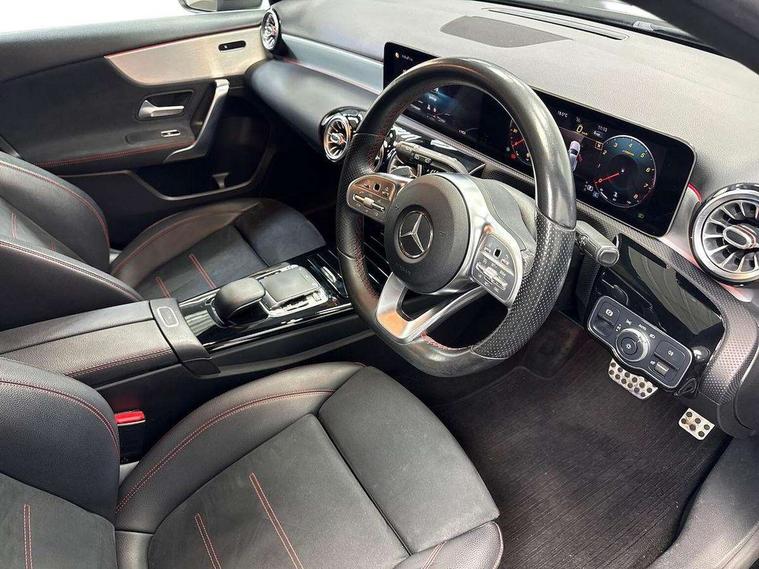 10.25" Digital instrument cluster display screen, 10.25" media display, 180 degree rear view camera with parking guidelines, Active parking assist with visual and audible warning of detected obstacles, Attention assist, Brake pad wear indicator warning light, Car wash mode, Cruise control + speed limiter, Direct steering, Dual bluetooth interfaces, DYNAMIC SELECT with a choice of driving modes (ECO, Comfort, Sport and Individual), ECO start/stop function, Fluid level warning indicator for fuel, oil, coolant and washer fluid, Hard-disk navigation, Hey Mercedes Voice activation, Lamp failure indicator, Lane keeping system, Mercedes me connect including emergency call system, accident recovery, breakdown and maintenance management, Mercedes me remote services, Outside temperature gauge, Owners manual in English, Pre-installation for private car sharing, Preinstallation for Mercedes Benz link, Service indicator (ASSYST), Smartphone integration with Apple CarPlay and Android auto, Speed limit assist, Speed sensitive power steering, Trip computer, Ultrasonic sensors positioned in the front and rear bumpers, Lowered comfort suspension, Rear axle torsion beam, 2 USB ports (type C) in rear stowage compartment and one in front of center console, 6 speakers, DAB Digital radio, MBUX multimedia system with DAB digital radio and touchpad including satellite navigation, Mercedes-Benz sound system - 100W, 4 Electric Front and Rear windows, Adaptive brake lights, AMG bodystyling - Front apron with splitter in chrome, rear apron with chrome trim and chrome visible trim elements in tailpipe, Automatic headlights, Black weather strip, Body colour bumpers, Body colour door handles with chrome inserts, Body colour side skirt, Electric adjustable and heated door mirrors with integrated LED side indicators, Exclusive diamond radiator grille, Exhaust system - Twin visible tailpipes in polished stainless steel, Headlamp assist automatic headlamp activation, Heated glass rear windscreen + timer control, LED High level third brake light, LED high performance headlamps with integrated LED daytime running lights, LED tail lamp, Privacy glass, Radio aerial, Rain sensing windscreen wipers with two sensitivity settings, Rear fog lights, Rear side wing doors, Rear wiper, 3 seat bench in 2nd row, 3 Spoke flat bottom leather multi function steering wheel with perforated leather in grip area, 40:20:40 split folding rear seats, Artico man-made leather/Microfibre Dinamica upholstery with red contrast stitching, Auto Mercedes-Benz child seat recognition sensor, Black air vents with surround in silver chrome, Black roof lining, Brushed stainless steel sports pedals with rubber studs, Controller on centre console with chrome surround, Floor mats with AMG lettering, Front centre armrest with storage compartment, Front seat backs luggage nets, Galvanished gear shift paddles on steering wheel, Heated front seats, Height/reach adjustable steering column, Illuminated Mercedes Benz lettering front door sills with changeable cover, Interior lighting - 64 colour Ambient lighting, Interior mirror with reading lamps in black and frameless, Manual height adjustable front seats, Rear armrest with 2 cupholders, Rear head restraints, Seat occupancy sensor for front passenger seat, Single front passenger seat, Sports seats with integrated headrests, Stowage compartment in centre console with retractable cover, Sunvisors with illuminated vanity mirrors, Touchpad on center console, Twin front cupholders, Two zone thermotronic luxury automatic climate control, Light and sight pack - A Class, Mirror package - A Class, Night pack - A Class Saloon/Hatchback, Seat comfort pack - A Class, 3 rear 3 point seatbelts, ABS with Brake Assist, Active bonnet, Active brake assist includes forward collision warning system with autonomous braking, Adaptive brake assist with hold function and hill start assist, Black seatbelts, Childproof locks manually operated for rear doors and electrically operated for rear power windows, Crash responsive emergency lighting, Driver and passenger head and side airbags, Drivers knee airbag, Dual stage driver/passenger airbags, Electronic parking brake, ESP curve dynamic assist, ESP with ASR, Front and rear seatbelt reminder, Front brake callipers with Mercedes Benz lettering, ISOFIX and top tether child seat fixing points in two outer rear seats, Tyre pressure monitoring system, Warning triangle and first aid kit, Window airbags, Alarm system/interior protection/immobiliser, Keyless entry lock/unlock, Keyless Go, Remote central locking and crash sensor with emergency opening function, Urban guard vehicle protection system with immobiliser and interior protection, Matrix look light longitudinal grain aluminium trim element, 18" AMG 5 twin spoke light alloy wheels aerodynamically optimised painted in black with highsheen finish, Summer tyres, Tirefit sealant kit,