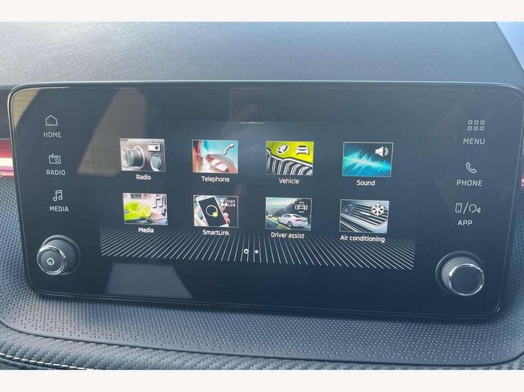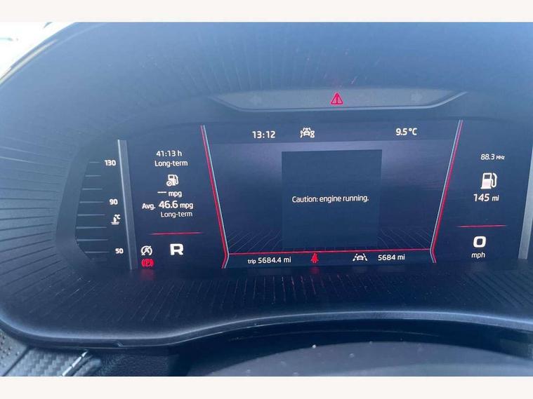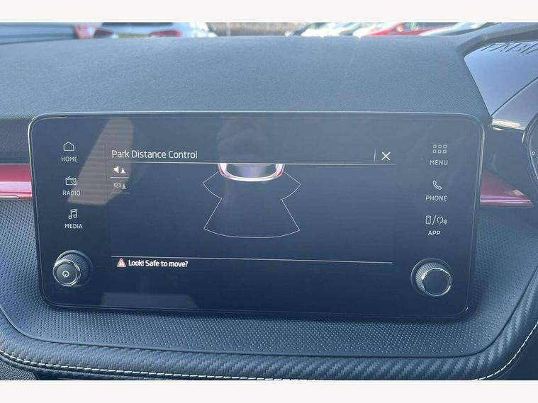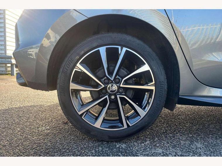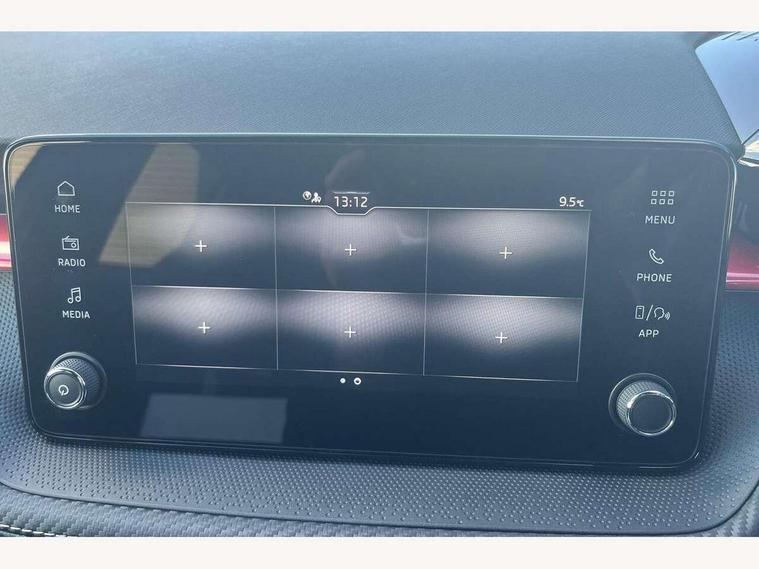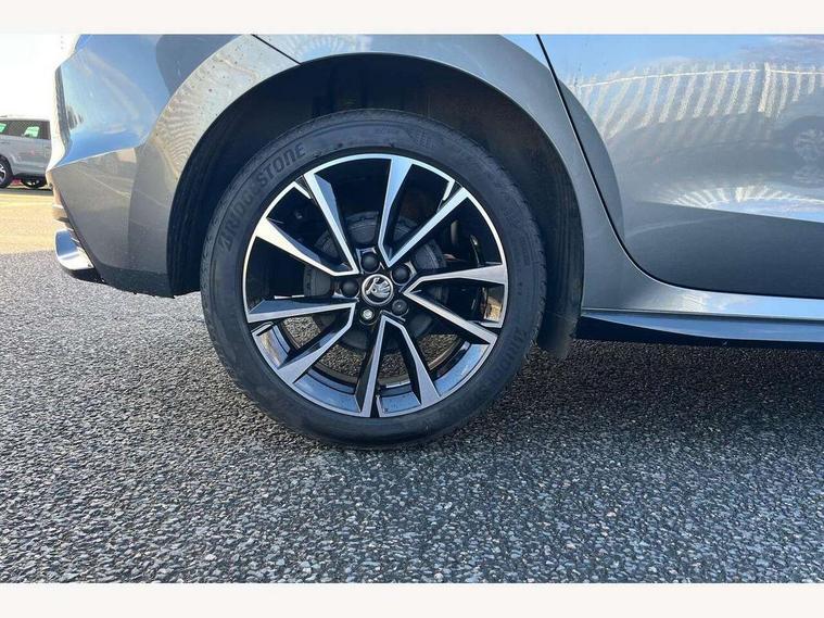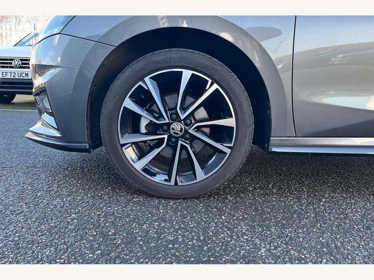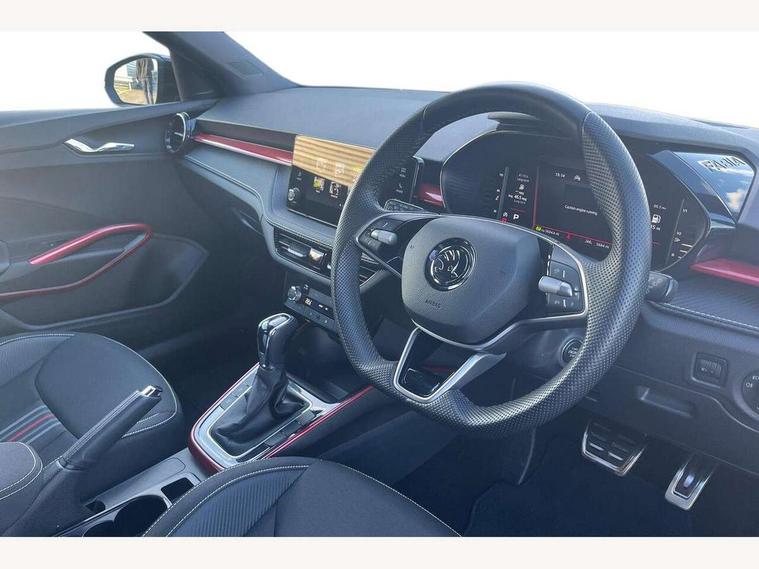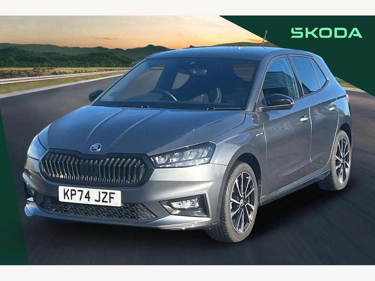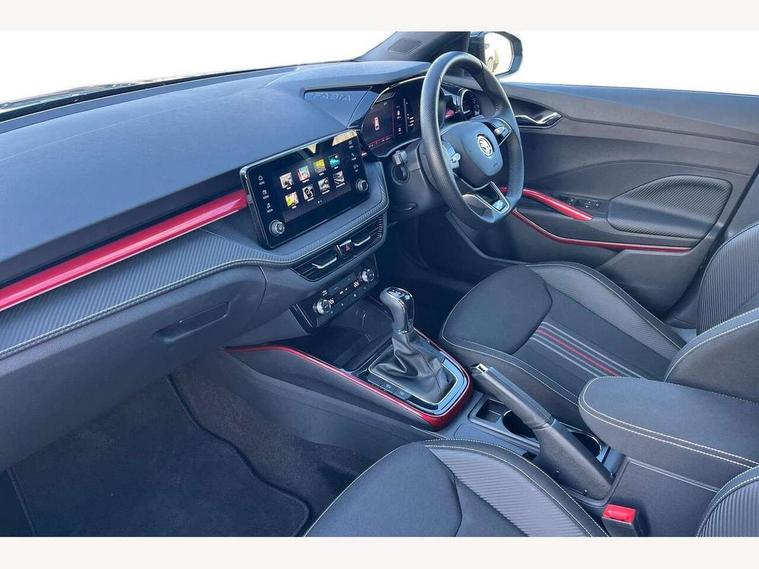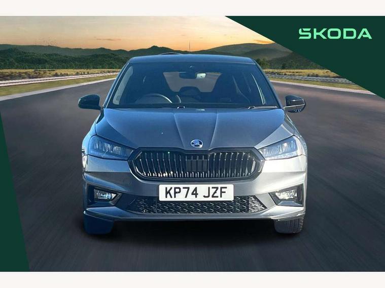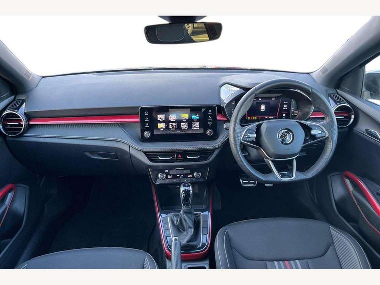 Advanced driver attention and drowsiness monitor, Bluetooth connection, Electromechanical power steering, Exterior temperature gauge, Service interval indicator, Traffic sign recognition, Virtual cockpit with 10.25" colour display, Wireless SmartLink for Apple CarPlay and Android Auto, 6 Speakers (4 in front and 2 in rear), Auxiliary socket for external MP3 player, DAB digital radio reception, Auto dimming rear view mirror, Black radiator grille, Body coloured bumpers, Door mirror integrated indicators, Front and rear electric windows, Front window wiper intermittent control, Headlight range control - Automatic, Ice scraper in fuel cap, LED daytime running lights with coming and leaving home feature, LED rear lights, Monte Carlo badging, Privacy glass, Rear LED fog light, Rear side wing doors, Rear window wiper with washing nozzles, Roof mounted spoiler, SKODA tailgate lettering in black, Sports bumpers, Third brake light, 2 reading lights in front and 2 reading lights in rear, 3 rear headrests, Aluminium pedals, Backrest split and folding, Black headlining, Central console with removable cup holder and storage box, Chrome handbrake release button, Door sills with fabia badging, Dual zone air conditioning with climatronic electronic control, Fabric/artificial leather upholstery, Front centre armrest, Front sports seats, Gearshift knob/handle in leather, Hand brake lever handle in leather, Height adjustable front headrests, Height adjustable front seats, Height adjustable steering wheel, ISOFIX and TopTether anchorage points to the outer rear seats, ISOFIX and TopTether on the front passenger seat, Luggage compartment lighting, Manually adjustable lumbar support in front seats, Metallic painted red central console cover, Metallic red interior door handles, Pollen filter, Rear seat bench unsplit, Single front passenger seat, Sun visors with mirror and airbag label on passenger side, Textile floor mats, Ticket holder, Umbrella in drivers door, 3-point height adjustable front seats belts with pretensioner and force limiter, Automatic warning lights in case of crash, Driver and passengers airbag with switch off function, e-Call+, ESC including ABS, MSR, ASR, EDS, HBA and XDS, Front and rear seat belt warning, FRONT ASSIST (AEB City and AEB Inter Urban), Front side airbags, Head airbags, Hill hold control, One tone horn, Pedestrian protection, Three rear 3-points safety seat belts with pretensioner and force limiter including stop function for outer rear seat belts, Tyre pressure monitoring system, Anti-theft alarm system including immobiliser, interior monitoring, backup horn, and towing protection, Central locking with radio remote control, interior controls, SAFE function and 2 foldable keys, Carbon effect door and side trim panels, Carbon effect lower decorative trim with white stitching, Monte carlo air vents, Red metallic upper decorative trim, Anti-theft wheel bolts protection, Super-low rolling resistance tyres,