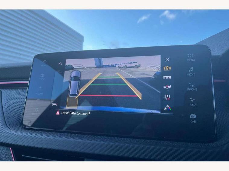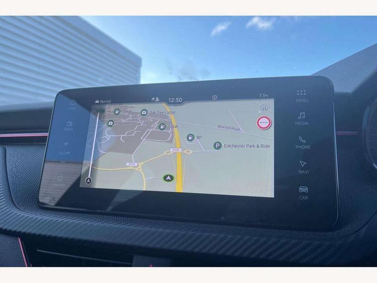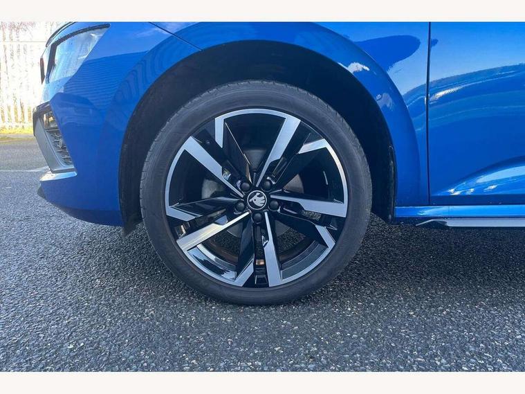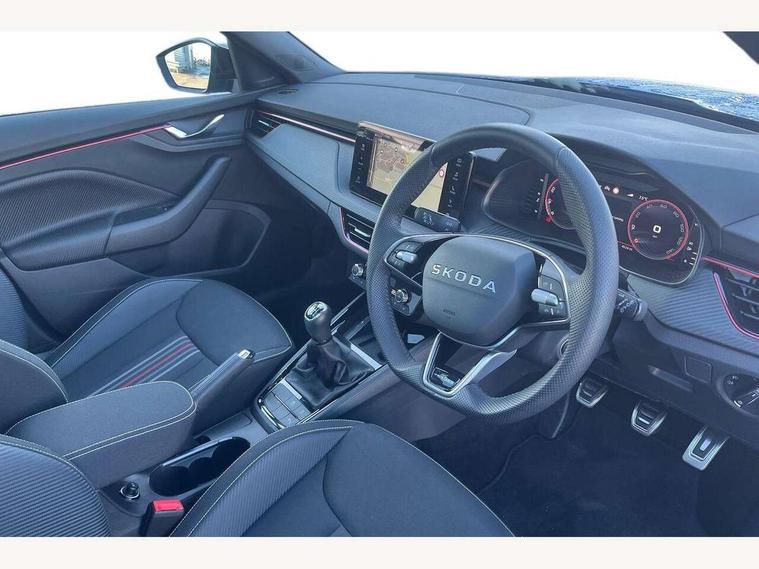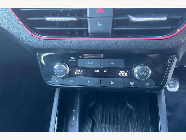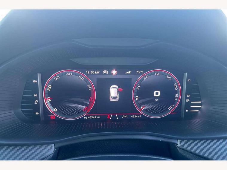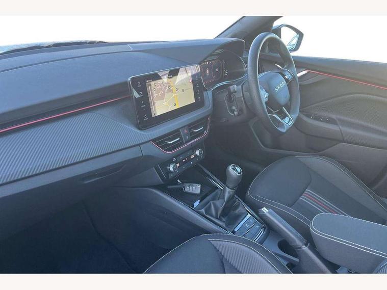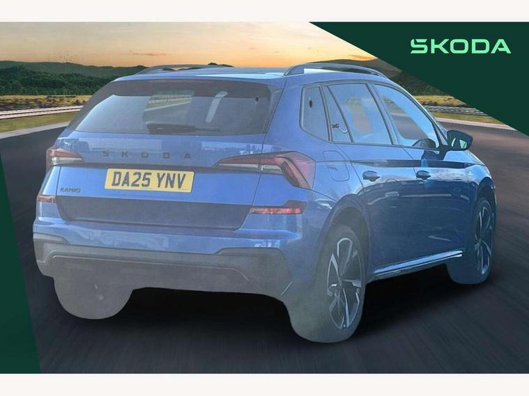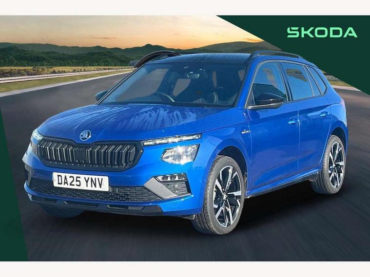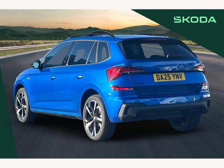 Advanced driver attention and drowsiness monitor, Bluetooth system, E-call, Front assist system, PAS, Rear parking sensors, Rear view camera, Service indicator, Speed limiter, Traffic sign recognition, Virtual cockpit with 10.25" display, Voice control system, Wireless smartlink, 4 USB C ports, 8 Speakers, 9.2" Skoda navigation display, DAB Digital radio, Auto dimming rear view mirror, Automatic headlight control with coming home and leaving home feature, Black door mirrors, Black radiator grille, Black rear diffuser, Black roof spoiler, Body colour bumpers, Body colour door handles, Boot lettering in black, Extended tailgate glass, Fixed panoramic sunroof with black roof rails, Front and rear electric windows, Heated rear window, LED daytime running lights, LED high beam, LED low beam, LED third brake light, Light sensors, Monte carlo plaque, Privacy glass, Rear side wing doors, Rear wiper, Ticket holder inside windscreen, 12V socket in luggage compartment, 3 seat bench in 2nd row, Aluminium pedals, Ambient lighting in white/red, Art leather carbon decor inserts, Art leather carbon door inserts, Black roof lining, Cargo elements, Chrome inner door handles, Driver and passenger sun visors with vanity mirror, Dual zone climate control, Front and rear roof lights, Front centre armrest, Front head restraints, Glove compartment with illumination, Height adjustable driver seat, Height adjustable front passenger seat, Ice scraper, Inner circulation control with pollen filter, ISOFIX on front passenger seat, Isofix preparation for back seats, Leather gearknob and handbrake lever, Manual lumbar support for front seats, Monte Carlo cloth upholstery, Net package and top tether hooks in boot space, Net under rear shelf, Pocket on the back of both front seats include mobile phone pockets, Rake/reach adjustable steering wheel, Reading lights, Rear centre armrests, Red hotstamping, Single front passenger seat, Sports seats, Textile floor mats, Third rear headrest, Top tether for front passenger seat, Umbrella in driver's door, Light and view plus package - Kamiq, 3x3 point rear seatbelts, Airbags - driver and front passenger, Disc brakes, ESP, Extended and predictive pedestrian/cyclist protection, Front passenger airbag deactivation switch, Front side airbags with curtain airbags, Hill hold control, Manual leather parking brake, Manual rear child locks, One tone horn, Seatbelt reminder for driver an co-driver, Traction control, Tyre pressure monitor, Anti-theft alarm system with interior monitoring, backup horn, towing protection and remote central locking with SAFE system, Anti-theft wheel bolts, Electronic engine immobilizer, 18" Ursa black diamond cut alloy wheels,