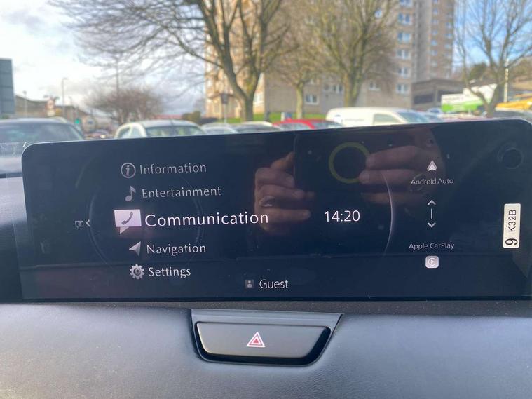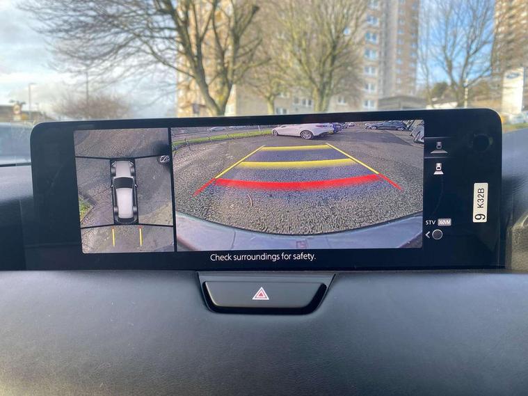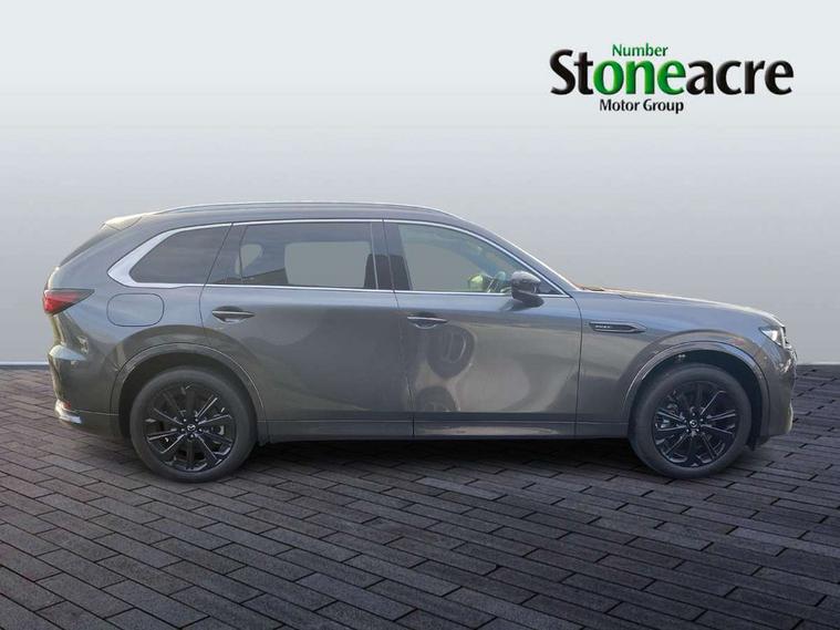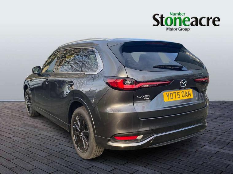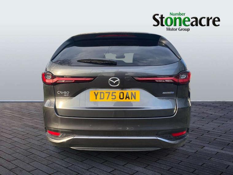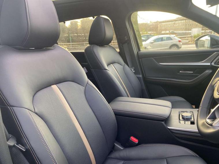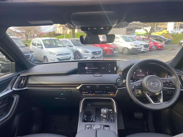 Emergency lane keeping with blind spot assist, Low washer fluid warning light, 12.3" Colour entertainment centre display with mazda connect infotainment, 12.3" TFT Colour display, Adjustable speed limiter, Blind spot assist, Blind spot monitoring with rear cross traffic alert, Distance alert system, Driver attention alert system, Driver Monitoring with personal identification, E-call with GPS, Emergency stop signalling system, Exit warning function, Front and rear parking sensors, Ingress / Egress support and automatic driver position guide, Integrated bluetooth, Intelligent speed assist, Kinematic posture control, Lane keep assist system (LAS) with Lane departure warning system (LDWS), Mazda Driver Personalisation System, Mazda Navigation System with european mapping, Multimedia Commander, PAS, Power lift gate with handsfree function, Power start/stop button, Speed alert, Traffic sign recognition enhanced with mandated excessive speed warning, Trip computer, Windscreen projected colour active driving display, Wireless apple car play/android Auto, Type 2 Mode 2 cable for AC charging via UK 3-pin plug, 7.2 kw On board Charger, Internal Combustion Engine Sound Emulator, Mi-Drive (Normal, Sport, Off-road, Towing and EV mode), Paddle shift, Type 2 Mode 3 cable for AC charging via home or public charge points, AM/FM and DAB radio, Bose surround sound system with 12 Speaker, Bose center point, Bass match and audio pilot technology, Steering wheel mounted audio/bluetooth controls, USB-C inputs (x2 front and x2 rear), Auto dimming driver's door mirror, Automatic headlight levelling, B-pillar and C-pillar garnishes in piano black finish, Body colour roof spoiler, Body coloured bumpers, Body coloured wheel arch and side mouldings, Coming/leaving home lighting function, Dark plated headlight lense, Dark plating finish signature wing in front grille, Dark plating front side garnish, Differentiated front bumper design to accentuate the intake, Dusk sensing headlights, Electric front/rear windows with one touch auto up/down, Electric panoramic sunroof, Electrically adjustable, heated auto power folding door mirrors with memory, Frameless auto dimming interior rear view mirror, Front kodo turn signal, Front wiper de-icer, Gloss black door mirrors, Headlight washers, High beam control, LED 3rd brake light, LED rear signature combination lamps, Piano black honeycomb style front grille, Rain sensing front wipers with adjustable sensitivity and speed, Rear side wing doors, Rear wiper, Signature LED daytime running lights, Silver decoration panel, 12v power outlet - front, 12V socket in boot, 2 Heated captains chairs in 2nd row, 2 seat bench in 3rd row, 3 height adjustable rear headrests, 3 seat bench featuring folding centre armrest equipped with two cup holders 2nd row, 50/50 split folding 3rd row rear seats, 60/40 split folding 2nd row rear seats, Ambient lighting, Black roof lining, Cargo net, Door panel trim - Cordovan-like Vinyl leather with matt black hairline film inlay, Driver and front passenger two rear grab handles with rear coat hooks, Driver and front passenger visors with covered vanity mirror and driver ticket holder, Driver seat electric tilt, slide, recline, height and lumbar adjustment, Driver, front passenger and two rear door pockets, Driver/passenger front seatback pockets, Electric telescopic and tilt adjustment steering wheel, Front centre storage with illumination and two cupholders, Front down lamp with front and rear foot lamps, Front headrests, Front passengers seat electric slide, recline, height and lumbar adjustment, Front seat ventilation with 3-stage setting, Glovebox illumination, Heated front seats with 3 stage setting, Heated leather wrapped steering wheel, Heated outer rear seats with 3-stage setting, ISOFIX child seat anchorage points attached on outer rear seats, Leather wrapped gear shift knob, LED illumination luggage compartment, Nappa leather upholstery, Practical and spacious front centre armrest storage, Rear seat recline function for rear passenger comfort, Remote fold down rear seats, Remote pre-heating/cooling, Roof mounted sunglasses holder, Single front passenger seat, Three zone climate control air conditioning with rear air vents for 2nd and 3rd row, Convenience and Driver Assistance Pack - CX-80 PHEV, 3 point ELR front seat belts x2 with pretensioners, 3 point ELR rear seat belts, Active bonnet, Anti-lock braking system (ABS), Drivers knee airbag, DSC - Dynamic Stability Control, Electronic parking brake with auto disengage function and auto hold function, Front and rear curtain airbags, Front dual stage driver and single stage front passenger airbags, Front passenger airbag cut-off switch, Front side airbags, Front smart city brake support, Hill decent control, Hill launch assist, Manual rear child locks, Seatbelt reminder for driver/front passenger and rear seats, Traction control, Tyre pressure monitoring system (TPMS), Remote central locking with deadlocking and automatic door lock when driving, Smart keyless entry, Thatcham accredited alarm and immobiliser, Dashboard panel - Cordovan-like vinyl leather, Mesh metal film centre console panel, 20" Black metallic alloy wheels, Emergency tyre repair kit,