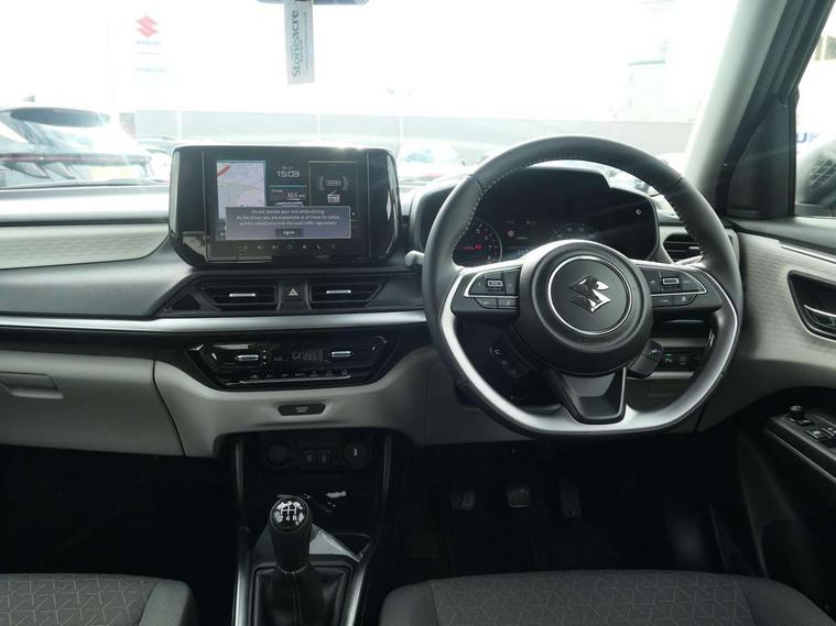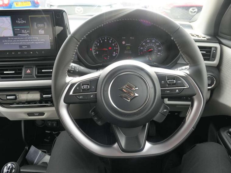 Adaptive cruise control, Automatic start/stop system, Blind spot monitoring, Colour LCD information display, Digital clock, Driver monitoring system, eCall, Fuel consumption display (average/instantaneous) and range display, Intelligent speed control support, Lane departure prevention, Lane departure warning system, Lane keeping assist (LKA), Low fuel level warning light, Navigation system, Outside temperature display, PAS, Rear cross traffic alert, Rear parking camera, Rear parking sensors, Remote fuel cap release, Smartphone integration with Apple CarPlay and Android auto, Suzuki connect, Tailgate, Traffic sign recognition, Weaving alert, 4 speakers + 2 tweeters, 9-inch infotainment display, Auxiliary input socket, Bluetooth audio streaming, DAB Digital radio, Steering wheel audio controls, USB Type A and C, 'Guide me home' headlamps, 1 speed with intermittent rear wiper + washer, 2 speeds front wiper with intermittent + washer, Automatic headlights, Black coloured A & B pillars, Black Upper and lower front grille, Body colour door mirrors and handles, C pillar trim moulding, Door mirrors with built-in turn signal lamp, Electric door mirrors, Electric folding door mirrors, Electric front windows, Electric rear windows, Green tinted glass, Heated door mirrors, High beam assist, LED daytime running lights, LED High mounted stop light, LED number plate light, LED position lamps, LED projector headlamps, LED rear combination lamp, Manual headlamp level control, Rain sensor, Rear fog lights, Rear privacy glass, Rear side wing doors, Rear spoiler, Side spoiler, 1 cup holder in rear, 12V Accessory socket in front console, 2 cup holders in front, 2 Isofix seat anchors, 3 bench rear seats in 2nd row, 3 rear head restraints, 3 spoke leather covered steering wheel, 60/40 split rear seats, Accessory socket, Automatic air conditioning, Centre console storage, Centre lower box, Child seat tether anchorages x 2, Chrome handbrake release button, Chrome interior door handles, Cloth upholstery, Door pockets with bottle holder, Driver/passenger sunvisors with ticket holders + vanity mirrors, Front cabin lights, Front headrests, Front map light, Front passenger side assist grip, Glovebox, Heated front seats, Heater, Height adjustable driver's seat, Luggage area lamp, Painted interior door trim ornament, Parcel shelf, Passenger seat back pocket, Pollen filter, Rear assist grips x2, Rear heater duct, Single front passenger seat, Tilt adjustable steering wheel, Tilt/telescopic adjustable steering wheel, 3 point ELR seatbelts for centre seat, 3 point ELR seatbelts front and rear, ABS+EBD+Brake assist, Curtain airbags, Driver airbag, Dual sensor brake support, ESP + traction control, Front and rear seatbelt reminder, Front passenger airbag, Front passenger airbag deactivation, Front seat seatbelts shoulder height adjuster, Front seatbelt pretensioners with force limiters, Hill hold control, Rear child proof door locks, Rear seatbelts with pre-tensioners and load limiters, Side airbags with incorporated into front seats, Tyre pressure indicator, Deadlocks, Freewheeling key cylinders, Immobiliser, Keyless entry and start, Light - on and Key in reminder, Locking wheel nuts, Remote central locking, Painted instrument panel ornament, 16" Polished alloy wheels, Emergency flat tyre repair kit,