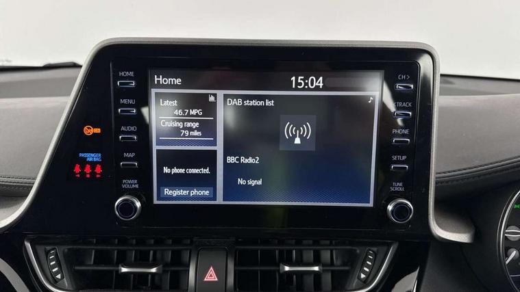 4.2" coloured TFT screen for multi-information display, Adaptive cruise control, Apple car play and Android auto, Bluetooth connectivity, E-call, Electric power steering, Hybrid system indicator, Lane departure alert with steering control, Lane trace assist, Push button start, Push button tailgate release, Remote boot door release in cabin, Remote boot door release in key, Reversing camera, Road sign assist - RSA, Smart voice assist, Trip computer, Voice recognition, Vehicle Stability Control (VSC), 6 speakers, AM/FM radio, DAB Radio (Digital Audio Broadcasting), Toyota touch 2 multimedia system with 8" display, USB connector, Wi-fi connectivity, Anti-jam protection on power windows, Auto high beam, Auto up and down function on all power windows, Automatic headlights, Automatic headlights cut-off, Black and body coloured rear bumper, Black lower front grille, Black upper front grille, Body colour door handles, Body colour door mirrors, Body colour front spoiler lip, Body coloured front bumper, Boot door release with push button, Electric heated door mirrors, Follow me home headlights, Front and rear power windows, Front fog lights, Headlight cut off reminder, Honeycomb lower front grille, LED daytime running lights, LED High mounted stop light, LED rear brake lights, LED rear combination lights, Manual headlight levelling, Manually retractable door mirrors, Noise reduction layer on front windows and windscreen, Power adjustable door mirrors, Rear side wing doors, Rear spoiler, Rear tailgate, Rear window defogger, Rear window wiper, Reflective LED headlights, Shark fin antenna, UV-filter on driver and passenger windows, UV-filter on rear windows, Variable front intermittent wipers, 12v power outlet - front, 3 rear headrests, 3 seat bench in 2nd row, 3 spoke leather steering wheel, 60/40 split folding 2nd row rear seats, Adjustable rear headrests, Adjustable speed limiter switch on steering wheel, Assist grips front and centre pillar, Audio and telephone switches on steering wheel, Black front door assist grips, Boot light, Chrome interior door handles, Cloth upholstery, Driver and front passenger personal light, Driver and front passenger Whiplash Injury Lessening seats, Dual zone automatic air conditioning, Floor mats, Front cupholders, Front head restraints, Front sports seats, Glovebox with internal light, Hard tonneau cover, Hooks for luggage holding net, Humidifying Nanoe air purifier, Illuminated entry system, Isofix attachments on outer rear seats, Leather gearshift, Light on driver sun visor, Light on passenger sun visor, Manual telescopic steering wheel, Manual tilt steering wheel, Manually adjustable lumbar support on driver seat, Manually height adjustable driver seat, Manually height adjustable front passenger seat, Manually reclining driver seat, Manually reclining front passenger seat, Manually sliding driver seat, Manually sliding front passenger seat, Microphone on front personal light, Mirror on driver sun visor, Mirror on passenger sun visor, Multimedia switches on steering wheel, Pollen filter, Shopping bag hooks, Single front passenger seat, Slow opening on lower glovebox, Voice recognition switch on steering wheel, 16 Disk front wheel brake, 3x3 point rear seatbelts, ABS+EBD+Brake assist, Electronic parking brake, Front and rear seatbelt reminder, Front passenger airbag on/off switch, Hill start assist control (HAC), Pre collision system with pedestrian detection, Pre-tensioners and force limiters, Rear door child safety locks, SRS Airbags - Driver + Front passenger, front side, front and rear curtain and driver's knee airbags, Toyota safety sense, Tyre pressure monitoring system, Tyre pressure warning system, Acoustic vehicle alert system (AVAS), Glass-breaking alarm sensors, Immobiliser, Intrusion alarm, Intrusion sensor, Motion sensor alarm, Power door locks, Power passenger window lock, Remote central locking, Black lower dashboard, Black upper dashboard, Grey deco line on upper dashboard, Matte black centre console, Tyre repair kit,