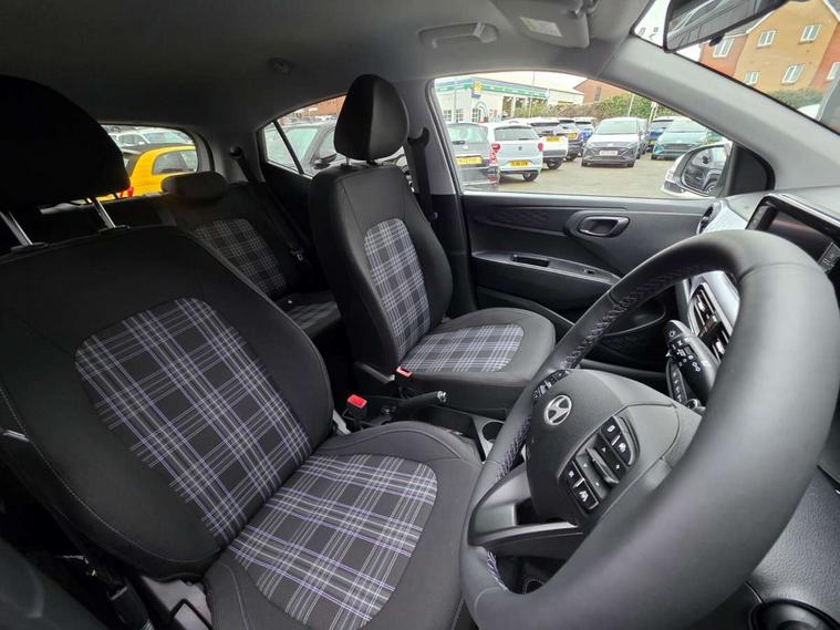 8" Touchscreen satellite navigation including mapcare and LIVE services, Apple car play/Android Auto, Bluelink mobile remote connectivity, Bluetooth connectivity with voice recognition, Cruise control, Driver attention alert system, eCall emergency call system, Forward Collision-Avoidance Assist (FCA) - Pedestrian/Cyclist, Full-width 4.2" LCD instrument cluster, Intelligent speed limit assist, Lane departure warning system with lane keep assist - LKAS, Lane follow assist, PAS, Rear parking sensors, Rear view camera with guidelines, Roadside assistance, Tailgate, Trip computer, Wireless charging pad, 2 front/2 rear speakers, Front and rear USB-C ports, Front USB connection, Leading vehicle alert (LVA), Steering wheel audio, phone and cruise controls, 1 speed non intermittent rear windscreen wiper, Black finish on B pillars, Body colour door handles, Body coloured bumpers, Body coloured door mirrors, Electric folding door mirrors, Electric front windows, Electric rear windows, Electrically adjustable and heated door mirrors, Flat metal emblem, Front fog lights, Front grille in glossy black, Front intermittent wipers, Halogen bi-function headlights, Headlights inner with Black Blade design, Heated rear window, High beam assist, Indicator light on door mirrors, LED daytime running lights, Privacy glass for rear window, Rear roof spoiler with integrated LED brake light, Rear side wing doors, 12v power outlet - front, 3 seat bench in 2nd row, 60/40 split folding flat to floor rear seats, Air conditioning climate control, Auto light control, Bottle holders in front/rear doors + front centre console, Cabin and luggage compartment interior lighting, Cloth upholstery, Driver + passenger vanity mirrors, Driver's seat height adjustment, Driver/passenger sunvisors with ticket holders, Floor mats, Front door pockets, Front Head Restraints - Vertical and Horizontal Adjustment, Front LED blue mood lighting, Glove compartment, Heated front seats, Heated steering wheel, Height adjustable steering column, Isofix child seat preparation, Leather wrapped steering wheel and gear knob, Metallic grey dashboard finisher with Meta Blue air vent rings, black/purple grey C-Pad and dark metallic garnish console, Rear door pockets, Single front passenger seat, Vertical adjustment rear head restraints, 13" Rear brake discs, 3x3 point rear seatbelts, Airbags - front, front side and curtain airbags, Anti-lock brake system (ABS), Autonomous emergency braking (AEB) with forward collision warning system, Brake assist function, Childproof rear door locks, Electronic stability control, Front and rear seatbelt reminder, Front seatbelt pretensioners, Hill start assist control (HAC), Passenger airbag deactivate switch, Traction control, Tyre pressure monitoring system, Immobiliser, Perimeter alarm, Rear occupant alert, Remote central locking, Second remote key, Smart key with keyless entry and engine start/stop button, Speed sensitive auto door locking, 16" alloy wheels, Temporary mobility kit (TMK),