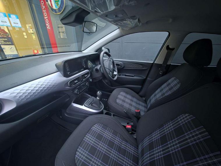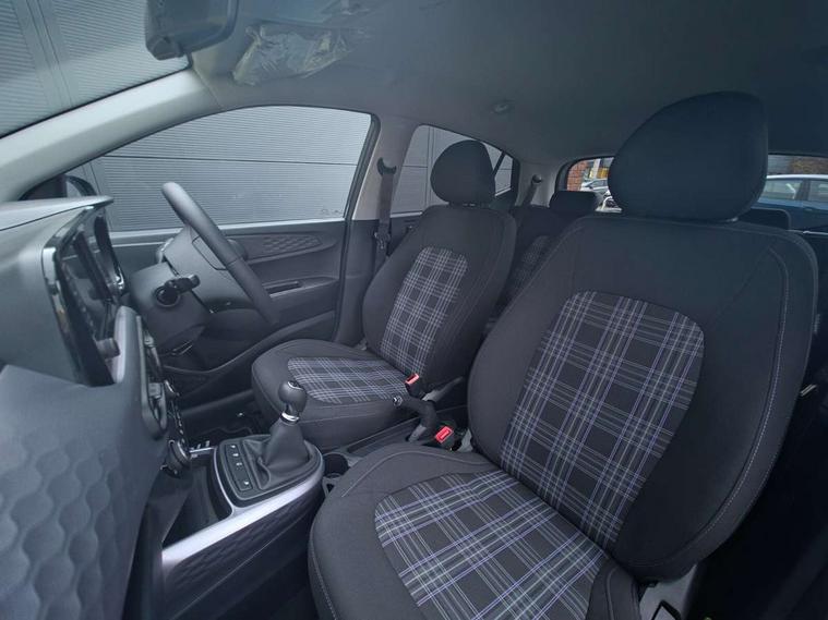 8" Touchscreen satellite navigation including mapcare and LIVE services, Apple car play/Android Auto, Bluelink mobile remote connectivity, Bluetooth connectivity with voice recognition, Cruise control, Driver attention alert system, eCall emergency call system, Forward Collision-Avoidance Assist (FCA) - Pedestrian/Cyclist, Full-width 4.2" LCD instrument cluster, Intelligent speed limit assist, Lane departure warning system with lane keep assist - LKAS, Lane follow assist, PAS, Rear parking sensors, Rear view camera with guidelines, Roadside assistance, Tailgate, Trip computer, Wireless charging pad, 2 front/2 rear speakers, Front and rear USB-C ports, Front USB connection, Leading vehicle alert (LVA), Steering wheel audio, phone and cruise controls, 1 speed non intermittent rear windscreen wiper, Black finish on B pillars, Body colour door handles, Body coloured bumpers, Body coloured door mirrors, Electric folding door mirrors, Electric front windows, Electric rear windows, Electrically adjustable and heated door mirrors, Flat metal emblem, Front fog lights, Front grille in glossy black, Front intermittent wipers, Halogen bi-function headlights, Headlights inner with Black Blade design, Heated rear window, High beam assist, Indicator light on door mirrors, LED daytime running lights, Privacy glass for rear window, Rear roof spoiler with integrated LED brake light, Rear side wing doors, 12v power outlet - front, 3 seat bench in 2nd row, 60/40 split folding flat to floor rear seats, Air conditioning climate control, Auto light control, Bottle holders in front/rear doors + front centre console, Cabin and luggage compartment interior lighting, Cloth upholstery, Driver + passenger vanity mirrors, Driver's seat height adjustment, Driver/passenger sunvisors with ticket holders, Floor mats, Front door pockets, Front Head Restraints - Vertical and Horizontal Adjustment, Front LED blue mood lighting, Glove compartment, Heated front seats, Heated steering wheel, Height adjustable steering column, Isofix child seat preparation, Leather wrapped steering wheel and gear knob, Metallic grey dashboard finisher with Meta Blue air vent rings, black/purple grey C-Pad and dark metallic garnish console, Rear door pockets, Single front passenger seat, Vertical adjustment rear head restraints, 13" Rear brake discs, 3x3 point rear seatbelts, Airbags - front, front side and curtain airbags, Anti-lock brake system (ABS), Autonomous emergency braking (AEB) with forward collision warning system, Brake assist function, Childproof rear door locks, Electronic stability control, Front and rear seatbelt reminder, Front seatbelt pretensioners, Hill start assist control (HAC), Passenger airbag deactivate switch, Traction control, Tyre pressure monitoring system, Immobiliser, Perimeter alarm, Rear occupant alert, Remote central locking, Second remote key, Smart key with keyless entry and engine start/stop button, Speed sensitive auto door locking, 16" alloy wheels, Temporary mobility kit (TMK),