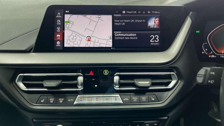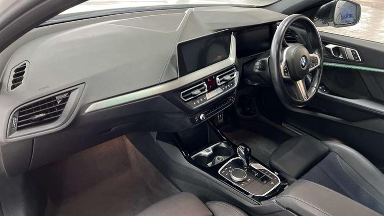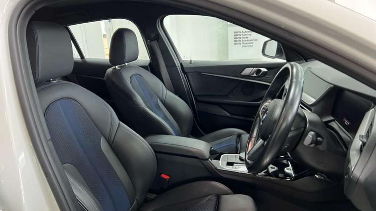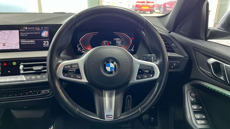 Active guard plus, Attentiveness assist, BMW Online services, BMW Teleservices, Check Control warning system for monitoring of lights and door/luggage compartment open warning, Connected eDrive Services, Eco pro mode, Integrated owners handbook, Oil sensor for level and grade, On board computer, Optimum shift indicator, Personal Profile, Pull away assistant, Speed limiter, Aluminium lightweight construction, Anti roll bar front and rear, Balancer shaft, Double VANOS, Drive Performance Control, Electronic differential lock, High precision injection, M sport suspension, Petrol Particulate Filter, VALVETRONIC engine management, Bluetooth audio streaming, DAB Digital radio, Auto dimming rear view mirror, Automatic headlight beam throw control, Automatic windscreen wipers and automatic headlight, Body colour door handles, Body colour mirror caps, Chrome 'M' logo side designation, Chrome exhaust tailpipe in single, round (Exhaust tailpipe, stainless steel - single, round), Chrome kidney grille frame with Satin Aluminium struts, Direction indicator side lights in exterior mirrors, Electric folding and anti dazzle exterior mirrors, Fading support, Follow me home headlights, Front and rear bumper system with replaceable deformation elements, Front and rear electric windows with open and close fingertip control, anti trap facility and comfort closing, Front door sill finishers in black plastic with M designation in metallic look, Green tinted heat protection glazing, Heated, electrically adjustable exterior mirror aspheric on driver side, convex on passenger side, High gloss shadowline window frame, Recess cover mirror frames and B/C pillar embelisher trim, High level third brake light, LED daytime running lights, LED eyebrow turn indicators, LED front fog lights, Lightweight engineering, Matt black air guide grilles, Model designation on right side of tailgate, Nearside reverse light in rear light cluster, Preparation for high beam assistant, Rain sensor including auto headlights activation, Rear fog lights, Rear window wiper, Shark fin antenna, Visible VIN plate, Welcome lighting, 12V power socket in centre console, 3 rear seat head restraints, 3 spoke M sports design leather steering wheel finished in nappa leather with specific M badge, Anthracite headlining, Anthracite Velour floor mats, Child seat ISOFIX attachment for two outer rear seats and front passenger seat with anchorage points, Conditioned based service, Dakota leather upholstery with perforation and contrast stitching, Driver and front passenger seat heating, Folding rear clothes hook, Four grab handles integrated in roof lining, Front and rear door pockets, Front and rear door pockets with bottle holders, Front and rear side armrest integrated into door trim, Front armrest foldable with integrated storage compartment, Front sports seats with electric side bolster adjustment, Glove compartment, Height adjustable front head restraints, Manual adjust steering wheel, Multi-function controls for steering wheel, Storage compartment in centre console, Sun visors with vanity mirrors and insert tab, Two zone automatic air conditioning, Additional interior lighting pack - 1 Series, Connected pack professional - 1 Series, Extended storage pack - 1 Series, Interior lights pack - 1 Series, Luggage compartment pack - 1 Series, M Sport exterior styling aerodynamics pack - 1 Series, 2 tone horn, 3 point seatbelts on all seats, front pyrotechnic belt tensioners, stopper and belt force limiters, rear coded belt buckles, Airbags - front driver/passenger, front & rear curtain, front side, Anti lock braking system (ABS) with brake assist, BMW emergency call, Brake drying, Braking readiness, Crash sensor activating central locking release, hazard warning lights, fuel cut off, interior lighting + activation of safety battery terminal clamp, Driver and front passenger seat belt security check, Dynamic stability control + (DSC+), Dynamic Traction Control - DTC, Electrically operated hand brake, Front and rear disc brakes, Front passenger manual airbag deactivation, Seatbelt warning, Side impact protection, Tyre pressure monitoring system, Warning triangle and first aid kit, Automatic drive away locking facility, Central locking switch for all doors, fuel filler cap and luggage compartment, Deadlocking function system to all doors, Locking wheel bolts, Remote control with integrated key with High-gloss Black inlay and M designation and 1 button for open/ close lock, window, open luggage compartment, Start/stop button with comfort go keyless engine start and auto start stop deactivation button, Thatcham Cat.1 alarm and immobiliser, Contrast stitching on instrument panel, Reduced rolling resistance tyres,