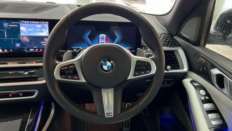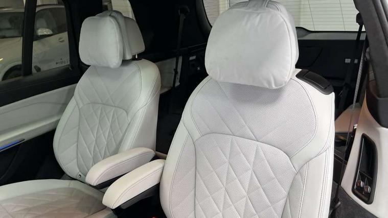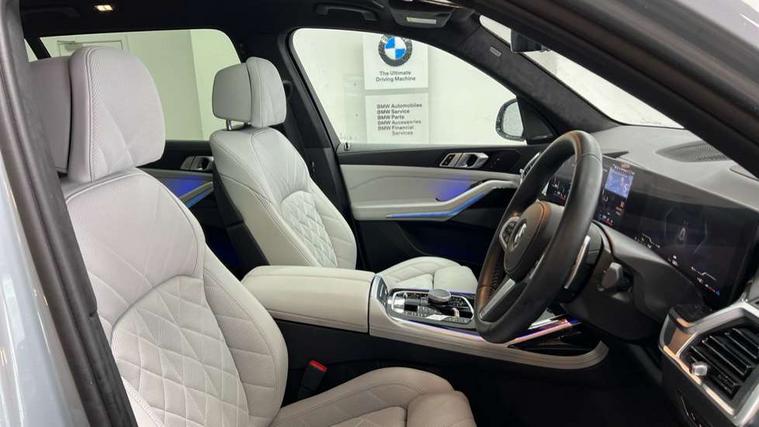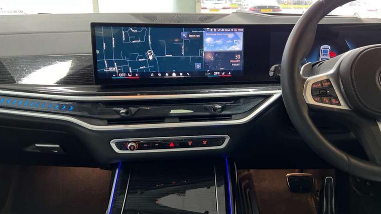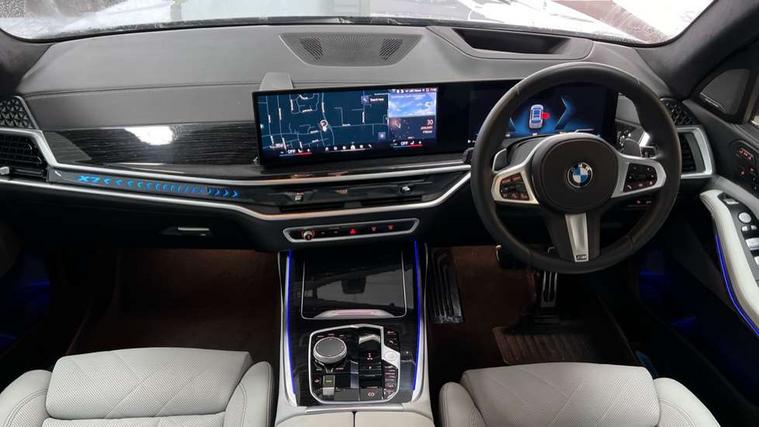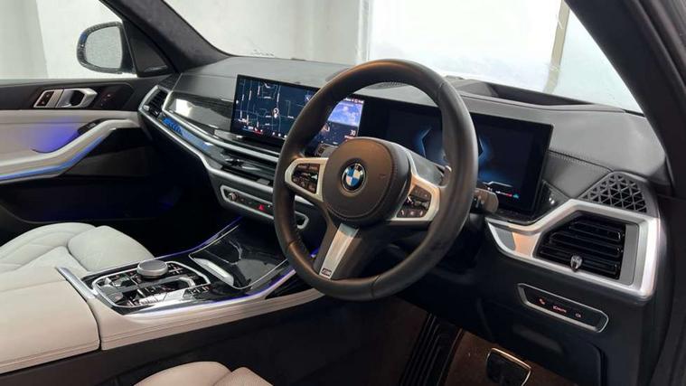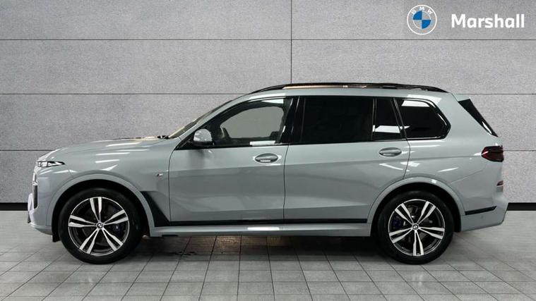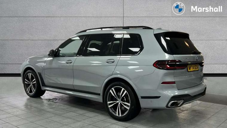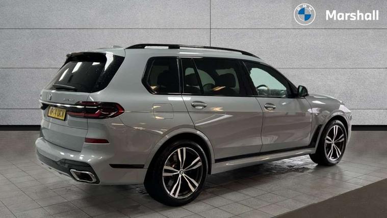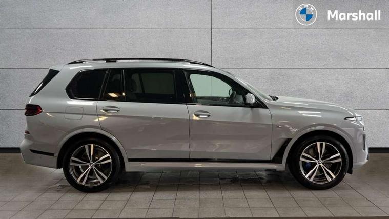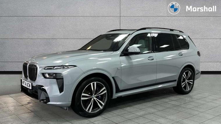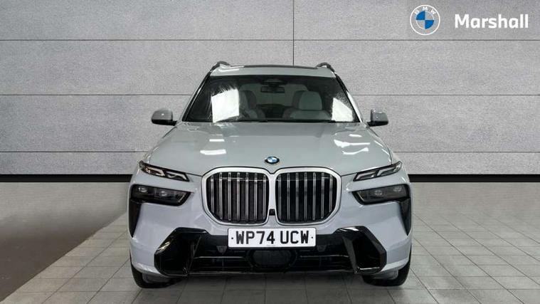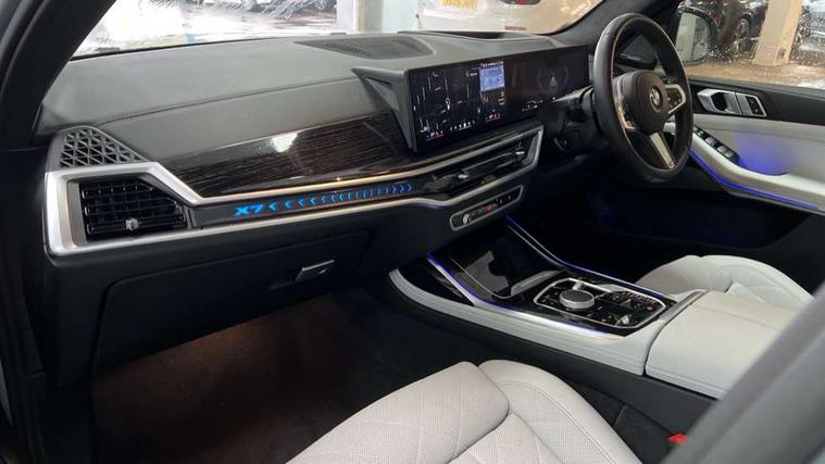 2 rear USB-C ports, Attentiveness assist, Automatic start/stop function, Automatic tailgate operation, BMW ConnectedDrive online services, BMW Drive recorder, BMW gesture control, BMW Teleservices, Brake pad wear indicator in front and rear, Condition based service, Electric power steering with Servotronic steering optimised at all speed ranges, Integral active steering, Integrated owner's handbook, Live Cockpit Professional with head up display including 12.3" instrument cluster and 14.9" central display, Parking assistant pro including reversing assistant, PDC, lateral parking aid, reversing assist camera, parking drive off monitoring, Speed limiter, 48V Mild hybrid technology, 8 speed automatic with steptronic transmission including automatic hold function and gearshift paddles on the steering wheel, Drive experience switch with comfort mode + ECO PRO + sport mode, Permanent all wheel drive, 2x Front USB (1x USB-C, 1x USB-A), DAB radio, Acoustic glazing, Adaptive air flap control bars in high gloss black, Air breather and door claddings in high gloss chrome, Aluminium roof rails, Aluminium Running Board, Body coloured wheel arches, Dynamic brake lights with LED technology, Electrically adjustable and heated aspheric folding side mirrors with auto dimming, electric fold in function, automatic parking function, Exterior and central air inlets in front bumper painted pearl chrome, Follow me home headlight function, Frameless interior mirror, Front and rear electric windows, Front ornamental grille struts in chrome high gloss, Heated windscreen washer nozzles, High beam assist, High gloss black shadowline trim in side/window frame, window recess cover, window guide, B and C pillar, mirror triangle, mirror base, mirror frame, Integrated turn indicators, Kidney grille iconic glow, LED daytime running lights, LED rear lights, LED third brake light in rear spoiler, One piece front ornamental grille frame in pearl gloss chrome, Rain sensor with automatic headlight activation and windscreen wiper control, Rear side wing doors, Side window graphic in satinated aluminium, Sump guard front and rear painted in silver, Trailer stabilisation logic, 12V - Power sockets with 2x centre console and 1x luggage compartment, 2 seat bench in 3rd row, 2x cupholders in front, rear centre armrest and two in third row seats, 3 seat bench in 2nd row, 40:20:40 split folding rear seat backrests, BMW inscription in front and rear door entry sills with illuminated, Compartment in front of cupholder, Driver and front passenger sunvisors with illuminated vanity mirrors and ticket holder, Electrical steering column with adjustable height and length with activation and control on the steering column, Front and rear colour co-ordinated with all standard carpet colours, Front and rear door pockets, Front and rear side armrests integrated into door trim, Front seat back pockets, Grab handles, Height adjustable front headrests, Height adjustable rear headrests, Lockable glove compartment, M leather steering wheel, Nano filter, Single front passenger seat, Soft close doors, Storage tray and compartment with lid in centre console, Wireless charging tray, Additional storage compartment pack - X7, Ambient light interior pack - X7, Connected Package Professional - X7, Interior lighting pack - X7, Luggage compartment pack - X7, M aerodynamics pack - X7, 3 point seatbelts on all seats, front pyrotechnic belt tensioners, stopper and belt force limiters, front and outer rear seats, Acoustic protection for pedestrians, Active protection, Airbag - Front driver and passenger, side airbags and Head airbags, Anti lock braking system (ABS) with cornering brake control, Automatic Stability Control (ASC), BMW emergency call, Child seat ISOFIX attachment rear outer seats in 2nd row and both seats in 3rd row includes top tether, Comfort cushion seats for outer seats in 2nd row, Crash sensor inclu activation of airbags, interior light, safety battery terminal clamp, hazard warn flasher, unlock doors, deactivation of fuel pump, DSC - Dynamic Stability Control, Dynamic Traction Control - DTC, Electromechanical parking brake with automatic drive away release and auto hold function, Front and rear brake discs with interior ventilation, Hill descent control, Integrated braking system, Manual child lock in rear doors, PC iBrake PostCrash approach control warning with light braking function, Tyre pressure monitoring system, Tyre pressure sensors, Variable torque distribution, Warning triangle and first aid kit, Alarm, Central locking including 2 vehicle keys with integrated emergency key, Comfort access system, Engine immobiliser, Locking wheel bolts, Galvanic embellisher for controls,