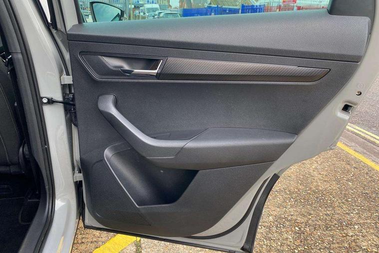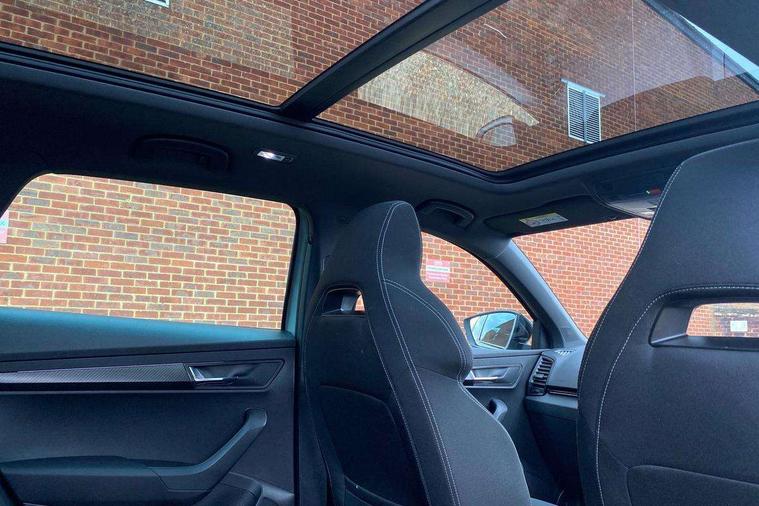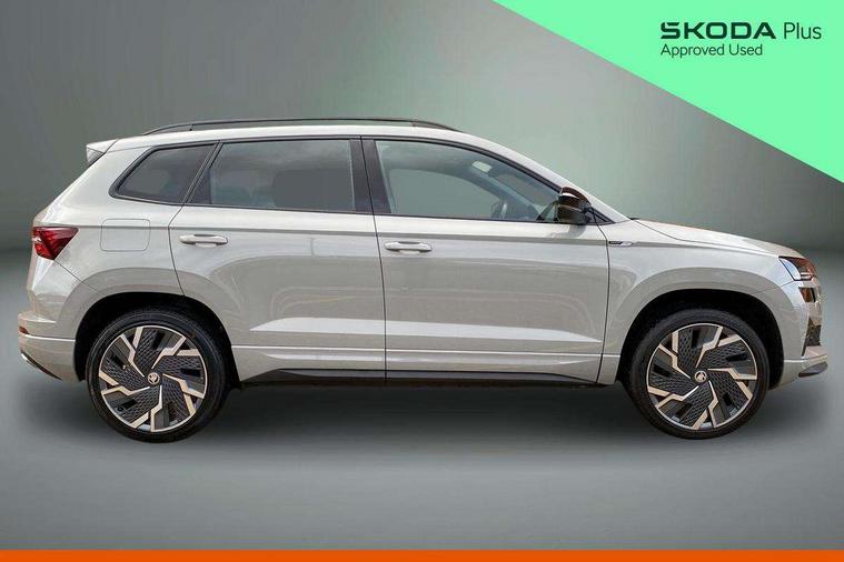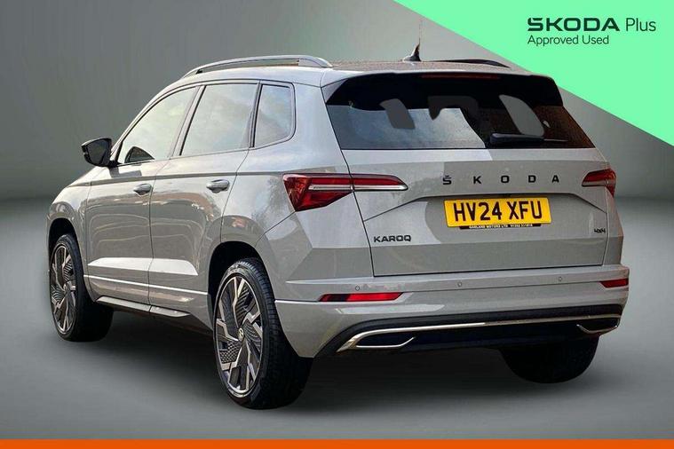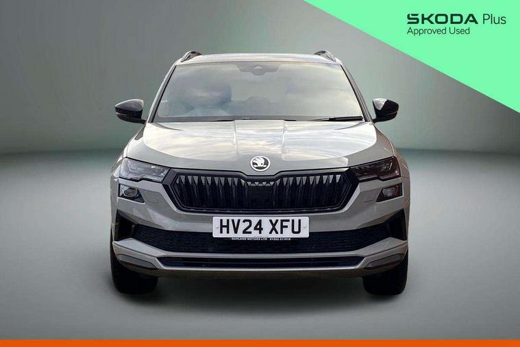 8" Digital display, Care connect, Driver fatigue sensor, Emergency services call system, Outside temperature gauge, Service interval indicator, SmartLink wireless for Apple and wired for Android, Start/stop system with regenerative braking, USB C Port x 2 in front centre console, Virtual cockpit, Virtual pedal with electrically operated boot door, Diesel particulate filter, 8 Speakers, DAB radio with Bluetooth, USB connection, Wireless charging without wireless aerial connection, Acoustic glass, Aero front windscreen wipers with intermittent function, Auto dimming rear view mirror with light and rain sensors, Black door mirrors, Black electric window control buttons, Black radiator grille, Black roof rails, Body colour door handles, Electric front and rear windows with child proof lock, Front door steps with SportLine logo, Heated rear windscreen, LED 3rd brake light, LED daytime running lights, LED rear lights with high functionality welcome effect and dynamic indicators, Light assistant (coming/leaving home/tunnel light), Panoramic sliding sunroof, Plastic scuff plates, Privacy glass, Protective door side sills in body colour, Rear diffuser, Rear side wing doors, Rear spoiler, Rear window wiper with washer system and intermittent control, Safety reflectors on front doors, Skoda lettering on tailgate in black, Sportline badge on front fender, Sportline decorative inserts with badging, Sports front and rear bumpers, 1.5 litre bottle holders in driver and front passenger door panels, 12V socket in boot, 12v socket in front centre armrest with storage compartment and rear air vents, 3 rear height adjustable headrests, 3 seat bench in 2nd row, 3 spoke leather sports multifunction steering wheel and silver stitching with gear shift paddles, 4 foldable roof handles with rear coat hooks, Black floor carpet, Black roof headlining, Chrome inner door handles, Double sided boot floor, Foldable hooks in the boot, Front head restraints, Height adjustable front three point seats belts with tensioners, Height/reach adjust steering wheel, Ice scraper, Illuminated glovebox, Illuminated luggage compartment, Interior noise suppression, Isofix child seat preparation outer rear, Manual lumbar support for front seats, Pen holder, Pollen filter, Rear boot cover, Rear reading lights, Rear seats fixed folding and divided 60:40, Rubbish bin door, Safety vest holder, Single front passenger seat, Storage box in upper central dashboard closed, Sunvisors with illuminated vanity mirrors, Textile floor mats, Ticket holder, Titan black interior ceiling, Welcome animation with sportline logo, Boot pack - Karoq, Light Pack - Karoq, Parking pack - Karoq, Automatic door unlocking in case of crash, Automatic fuel cut off in case of crash, Child locks on rear doors, Driver airbag, Electronic parking brake with auto hold function, Emergency rear braking signal, ESC including ABS, MSR, ASR, EDS, HBA, DSR, RBS, MKB and traction control, Front side airbags, Hill hold control, Knee airbags, Passenger airbag with switch-off function, Pedestrian monitor, Seatbelt reminder signalisation and pretensioner for all seats, Three point seatbelts rear, Two tone horn, Tyre pressure display, Tyre pressure monitor, Alarm with interior monitoring, back up horn and tilt sensor with safe function, Electronic engine immobiliser, Keyless entry and start/stop, Remote central locking with 2 remote folding keys, Black air vent surround, Black centre console, Satin black dashboard, Satin black door trim, 19" Sagitarius anthracite alloy wheels with matt black aero inserts, Anti-theft wheel bolts protection, Matt black aero hub caps, Tool kit,