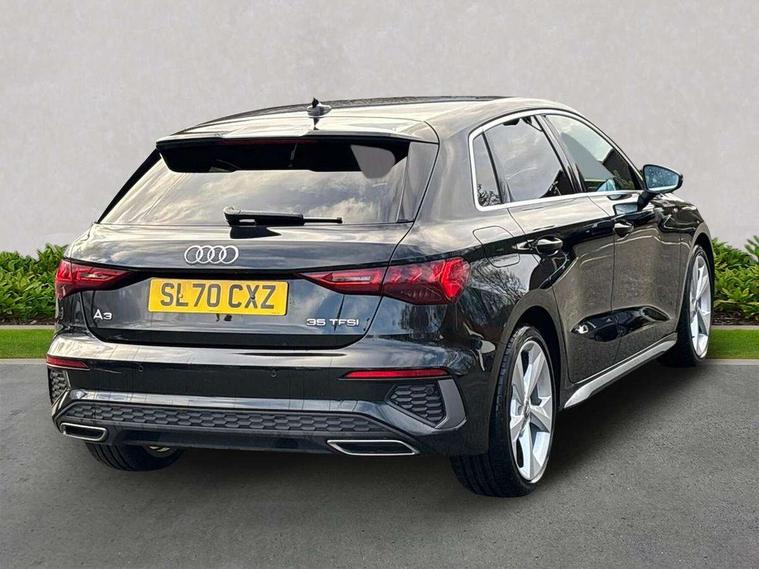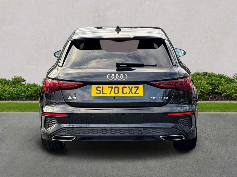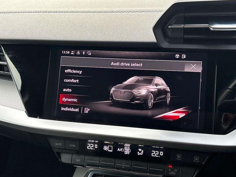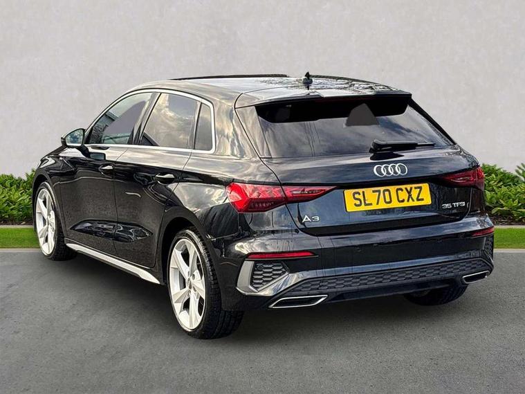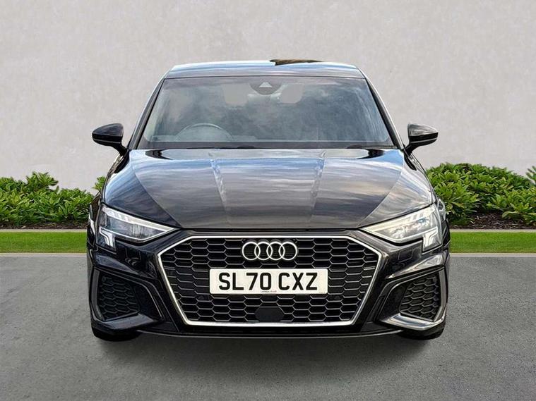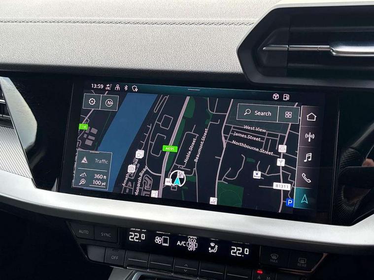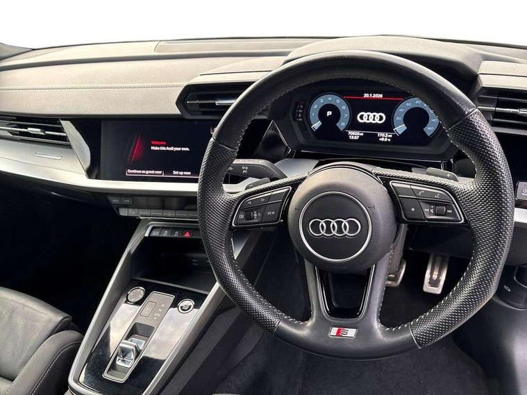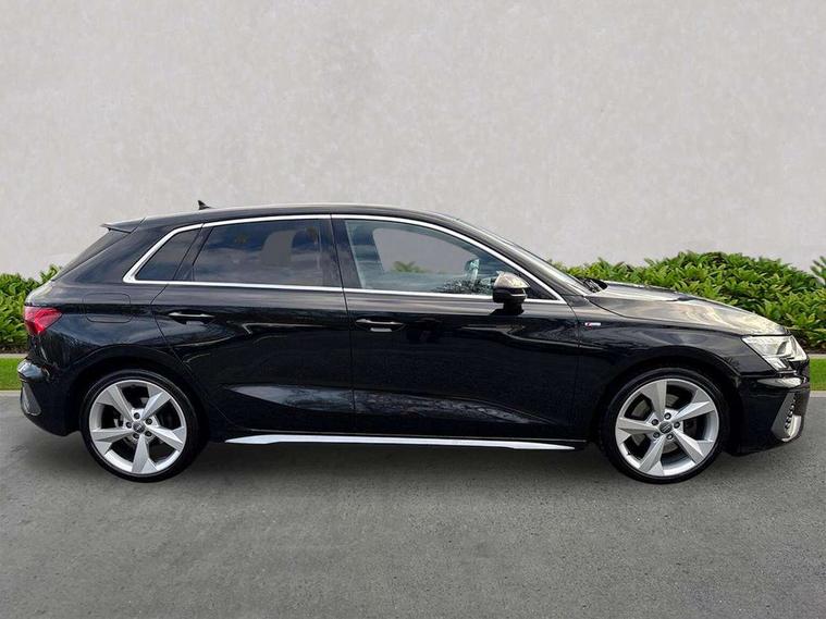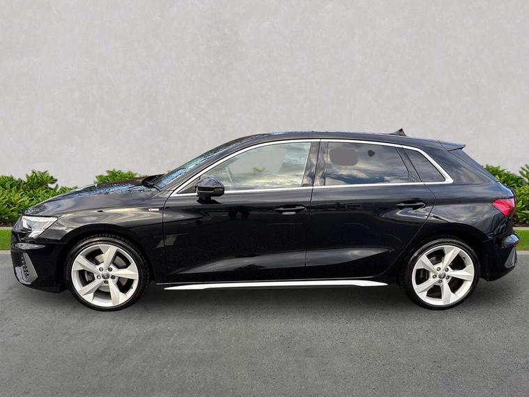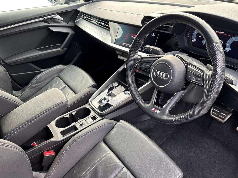 Audi connect emergency call and service, Audi drive select (Auto, Comfort, Dynamic, Efficiency and Individual), Audi smartphone interface, Audi Virtual Cockpit - 10.25" digital and colour instrument cluster, Automatic start/stop system with recuperation, Bluetooth interface, Collision avoidance assistant, Electromechanical power speed sensitive steering, Lane departure warning system, MMI Navigation Plus with high resolution 10.1" colour touch screen display, Service indicator, Trip computer, Voice control system with natural language interaction, 1xUSB-A and 1xUSB-C connection, 6 passive loudspeakers, DAB Digital radio, Acoustic glass windscreen, Aluminium window trim, Auto dimming frameless rear view mirror, Body colour exterior mirrors, Electrically adjustable/heated/folding/dimming door mirrors with kerb view includes integrated LED indications + kerb view function for passenger side, Front electric windows, Illuminated aluminium inserts front door sills with S logo, LED daytime running lights, Light and rain sensors, Privacy glass - dark tinted rear window, rear door and side windows, Rear electric windows, Rear side air outlets in grained matt black, Rear wiper, S line bumpers, S roof spoiler, 12V socket and storage compartment in front centre console, 40/20/40 split folding rear seat bench with cupholder, Black cloth headlining, Dual zone electronic climate control, Front and rear centre armrest in leather, Front and rear headrests, Front/rear floor mats, Height and reach adjustable steering wheel, Interior lighting - glove compartment light and right hand side, Luggage compartment floor covering, Manual boot compartment lid, Manually adjustable front seats, Seat side bolsters, Stainless steel pedals and front footrest, Twin leather upholstery with front sports seats S embossed logo, Aluminium interior elements pack - A3 Sportback, S line styling pack - A3 Sportback, 3x3 point rear seat belts, Driver and front passenger airbag with passenger airbag deactivation, Electronic Stabilisation Control (ESC) including ABS, ASR and EDL, First aid kit with warning triangle and 2 safety vests, Hill hold assist, Pre-sense front with pedestrian and cyclist detection, Seatbelt monitoring, Tyre pressure loss indicator, Anti theft alarm, Anti-theft wheel bolts, Electronically operated child lock, Immobiliser, Remote control central locking, Accent surfaces in the dashboard and centre console in platinum grey silk effect paint finish, Dark spectrum aluminium inlays,