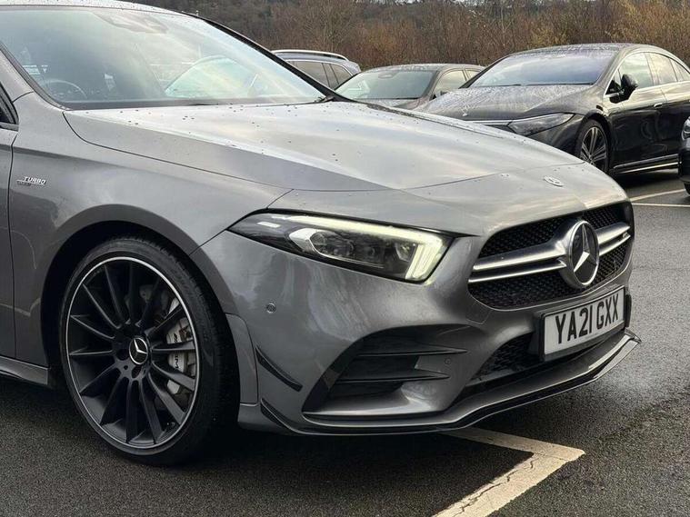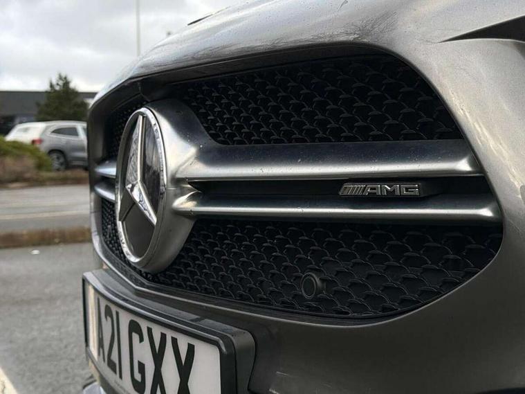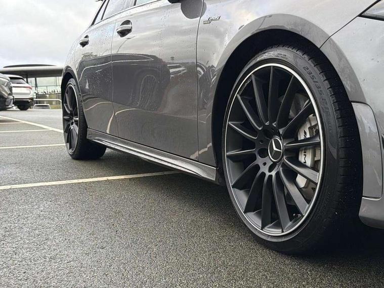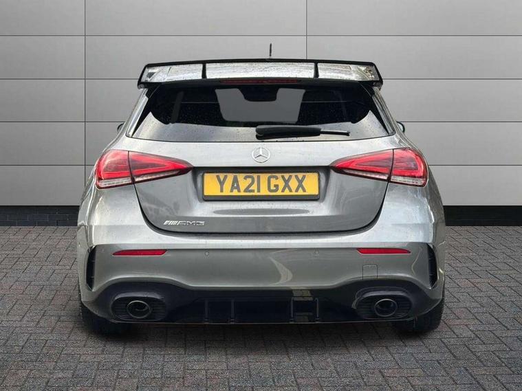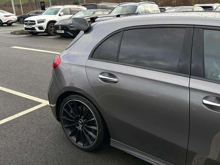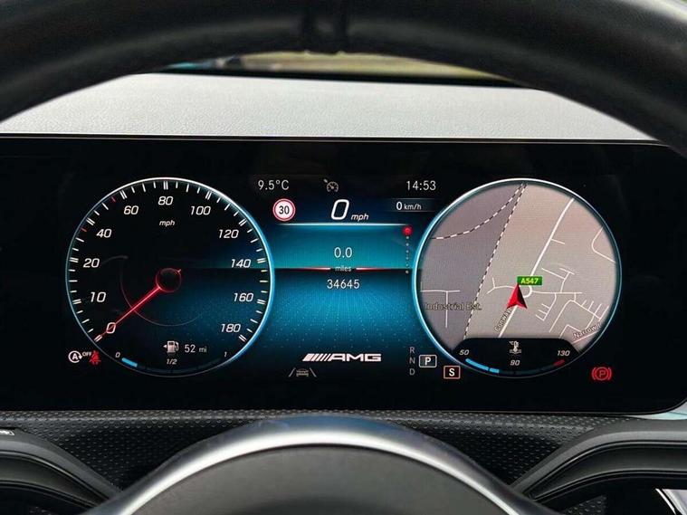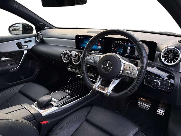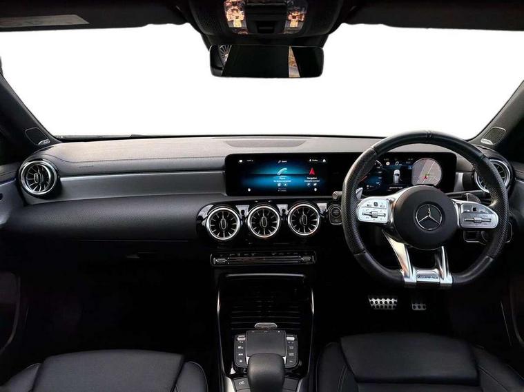 10.25" Digital instrument cluster display screen, 10.25" media display, 180 degree rear view camera with parking guidelines, Active parking assist with visual and audible warning of detected obstacles, Attention assist, Brake pad wear indicator warning light, Car wash mode, Direct steering, Dual bluetooth interfaces, DYNAMIC SELECT with driving programs (Slippery, Comfort, Sport, Sport+ and Individual), ECO start/stop function, Fluid level warning indicator for fuel, oil, coolant and washer fluid, Hard-disk navigation, Hey Mercedes Voice activation, Lamp failure indicator, MBUX augmented reality for navigation, Mercedes me connect including emergency call system, accident recovery, breakdown and maintenance management, Mercedes me remote services, Outside temperature gauge, Owners manual in English, Pre-installation for private car sharing, Preinstallation for Mercedes Benz link, Service indicator (ASSYST), Smartphone integration with Apple CarPlay and Android auto, Traffic sign assist, Trip computer, Ultrasonic sensors positioned in the front and rear bumpers, Wireless charging, Rear axle multi-link, 2 USB ports (type C) in rear stowage compartment and one in front of center console, Burmester surround sound system - 590W, DAB Digital radio, MBUX multimedia system with DAB digital radio and touchpad including satellite navigation, 4 Electric Front and Rear windows, Adaptive brake lights, AMG bodystyling - Front apron with splitter in chrome, rear apron with chrome trim and chrome visible trim elements in tailpipe, AMG Front apron with flics as air deflector elements on the outer air intakes, AMG radiator grille with twin blade lamella and AMG Lettering, AMG Rear apron with specific diffuser look with four vertical fins and two round chrome plated tailpipe trim elements with a diameter of 90 mm, AMG spoiler lip on roof, AMG Sports exhaust system with two round tailpipes measuring 90 mm in diameter attached in rear apron, AMG lettering plus ribbing on the inside of the, Black weather strip, Body colour bumpers, Body colour door handles, Body colour side skirt, Electric adjustable and heated door mirrors with integrated LED side indicators, Front wings wheel arches with TURBO 4MATIC lettering, Headlamp assist automatic headlamp activation, Heated glass rear windscreen + timer control, High gloss black beltline, LED high performance headlamps with integrated LED daytime running lights, LED tail lamp, LED third brake light, Multibeam LED with adaptive highbeam assist plus, Panoramic sliding sunroof, Privacy glass, Radio aerial, Rain sensing windscreen wipers with two sensitivity settings, Rear fog lights, Rear wiper, Trim elements on louvres in outer air inlets in silver chrome, Wider wheel arches for AMG wheels, Window line trim strip in high gloss black, 40:20:40 split folding rear seats, AMG Performance steering wheel in nappa leather, Auto Mercedes-Benz child seat recognition sensor, Black air vents with surround in silver chrome, Black roof lining, Brushed stainless steel sports pedals with rubber studs, Controller on centre console with chrome surround, Electrically adjustable front memory seats including lumbar support, Floor mats with stitched edging and AMG lettering, Front centre armrest with storage compartment, Front seat backs luggage nets, Front seat cushion length adjustment, Heated front seats, Height/reach adjustable steering column, Illuminated front door sills with changeable cover, Interior lighting - 64 colour Ambient lighting, Interior mirror with reading lamps in black and frameless, Rear armrest with 2 cupholders, Rear head restraints, Seat occupancy sensor for front passenger seat, Silver coloured aluminium gear shift paddles on steering wheel, Sports seats with integrated headrests, Stowage compartment in centre console with retractable cover, Sunvisors with illuminated vanity mirrors, Touchpad on center console, Twin front cupholders, Two zone thermotronic luxury automatic climate control, Aerodynamic pack - A Class, AMG night pack - A Class, Light and sight pack - A Class, Mirror package - A Class, Seat comfort pack - A Class, 3 rear 3 point seatbelts, ABS with Brake Assist, Active bonnet, Adaptive brake assist with hold function and hill start assist, Black seatbelts, Childproof locks manually operated for rear doors and electrically operated for rear power windows, Crash responsive emergency lighting, Driver and passenger head and side airbags, Drivers knee airbag, Dual stage driver/passenger airbags, Electronic parking brake, ESP curve dynamic assist, ESP with ASR, Front and rear seatbelt reminder, Front brake calipers with AMG lettering, ISOFIX and top tether child seat fixing points in two outer rear seats, Perforated front brake discs, Tyre pressure monitoring system, Warning triangle and first aid kit, Window airbags, Alarm system/interior protection/immobiliser, Keyless entry lock/unlock, Keyless Go, Remote central locking and crash sensor with emergency opening function, Urban guard vehicle protection system with immobiliser and interior protection, Light aluminium with longitudinal grain interior trim, 19" AMG multi-spoke matt black painted light alloy wheels with high sheen finish, Summer tyres, Tirefit sealant kit,