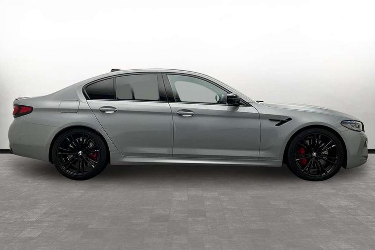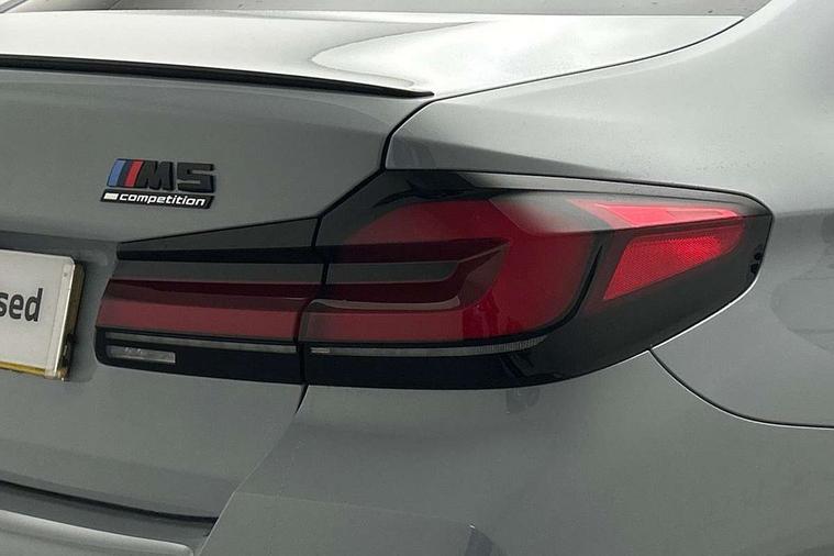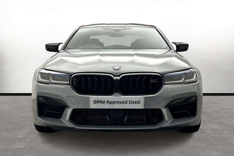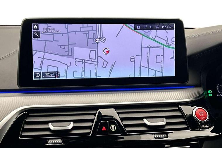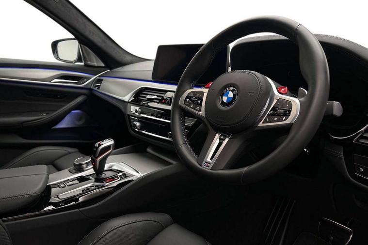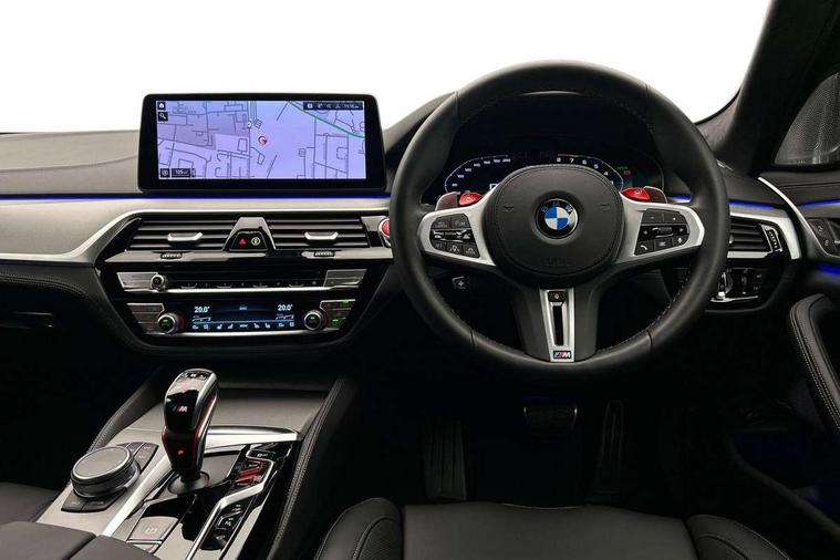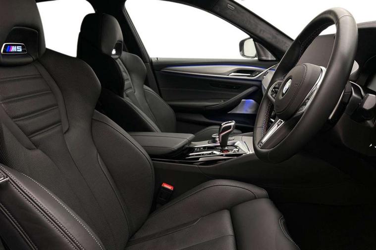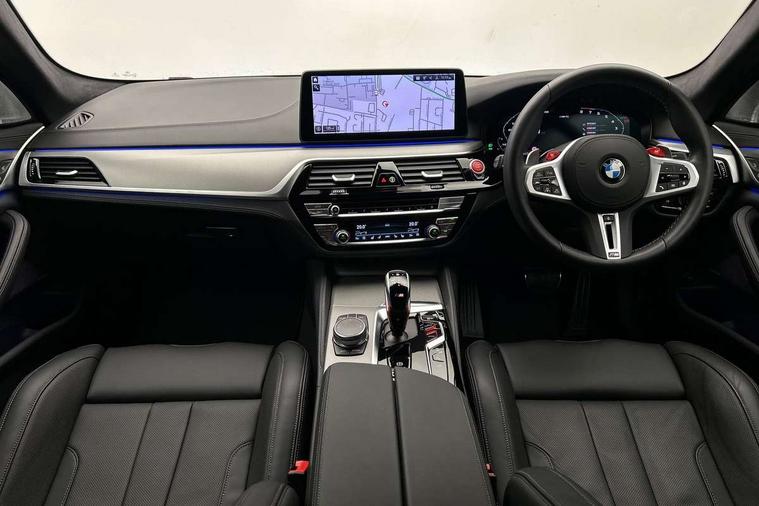 32GB hard disc drive (HDD) memory, Active Guard, BMW ConnectedDrive online services, BMW Drive recorder, BMW gesture control, BMW Head up display, BMW legal emergency call, BMW Live Cockpit Professional sat nav system with 12.3" instrument display and high resolution control display, BMW Teleservices, Brake force display, Comfort access system with smart opener, Electric boot lid - electrically opening/closing rear tailgate, Enhanced bluetooth with wireless charging, iDrive touch controller with shortcut buttons, M Servotronic steering, Oil sensor for level and grade, On board computer (OBC) includes average speed, fuel consumption and range, journey computer, outside temperature display, personal profile functions, On-board diagnosis - OBD, Powered by Operating System 7.0, Service interval indicator, Start/stop button in red, Wi-Fi hotspot, Adaptive suspension with dynamic damping control, Catalytic converter, Double wishbone front axle, Eight speed M Steptronic sport transmission with drivelogic and gearshift paddle switches on steering wheel includes launch control, Engine cover with M designation, High precision direct injection, Integral rear axle, Petrol Particulate Filter, Rear biased M specific xDrive setup, VALVETRONIC with Double VANOS, DAB tuner, Favourite buttons, All round anti-corrosion system, Auto dimming door mirrors, Black exhaust tailpipes, BMW Individual high gloss shadow line includes exterior mirror frame, window frame surround, B pillar finish, air breather in high gloss black, BMW individual lights shadow line, Body coloured bumpers, Body coloured door handles inserts, Carbon fibre roof, Door handle illumination, Dynamic brake lights with LED technology, Electric front and rear windows with fingertip open/close + anti-trap all round and comfort closing function, Follow me home headlight function, Heated windscreen washer jets, High beam assistant, High level LED brake light, Illuminated door sill finishers with M5 designation, Interior rear view electrochromatic mirror with automatic anti dazzle function, LED daytime running lights, M rear spoiler, M specific electrically adjustable/foldable/heated exterior mirrors with integrated direction indicators, M Sport exhaust system, Rain sensor including auto headlights activation, Rear boot, Rear side wing doors, Sun protection glazing, 12V power sockets 2 x rear, 1 x luggage compartment (additional 1 X double USB adaptor with 2A charging current), 3 seat bench in 2nd row, 4 zone control automatic air conditioning, Ambient interior lighting with 11 pre-defined selectable light designs including 6 colours, Armrest - front and rear integrated door trim, centre console includes storage compartment, rear centre includes 2 cupholders, Battery in luggage compartment with jump start facility in engine bay, Black velour front and rear floor mats with M piping, Child seat ISOFIX attachment with rear outer seats includes top tether, Cup holders (2 front and 2 rear), Driver and front passenger lumbar support, Electric seat adjustment with memory, Front and rear footwell lights, Front and rear reading lights, Headrests for all seats, Height and length electric adjustment steering column, Lockable glove compartment with light, M leather steering wheel, M multifunctional sport seats driver and front passenger with comfort electric height adjust headrests and illuminated M5 logo headrests, Multifunction controls for leather steering wheel, Single front passenger seat, Through loading system with 40/20/40 split folding rear seat, BMW Individual high gloss shadow line with extended contents pack - M5, Connected package professional - M5, Parking assistant plus pack - M5, Airbags - driver/front passenger, rear and side, first and second row seats head airbags, front passenger seat airbag deactivation, Anti-lock braking system (ABS), Automatic Stability Control (ASC), Brake assist function, Brake energy regeneration, Child locks on rear doors, Cornering brake control (CBC), Crash sensor activating central locking release, hazard warning lights, fuel cut off and interior lighting, Deformation zones - front and rear with door reinforcements and bumpers up to 2.5 mph, DSC - Dynamic Stability Control, Dynamic brake control, Dynamic Traction Control - DTC, Electromechanical parking brake with automatic drive away release and auto hold function, Electronic brake force distribution, Impact-dependent airbag system, M Sport seatbelts, Motor Slip Regulation (MSR) - Engine Drag Torque Control, Seat belts front inertia reel with pyrotechnical belt latch tensioner, belt force limiter and belt restrainer, Side impact protection, Three inertia reel rear seatbelts, Two tone horn, Tyre pressure indicator, Warning triangle and first aid kit, Alarm system (Thatcham 1) with remote control and electronic engine immobiliser, Locking wheel bolts, Galvanic embellisher for controls, Tyre repair kit,