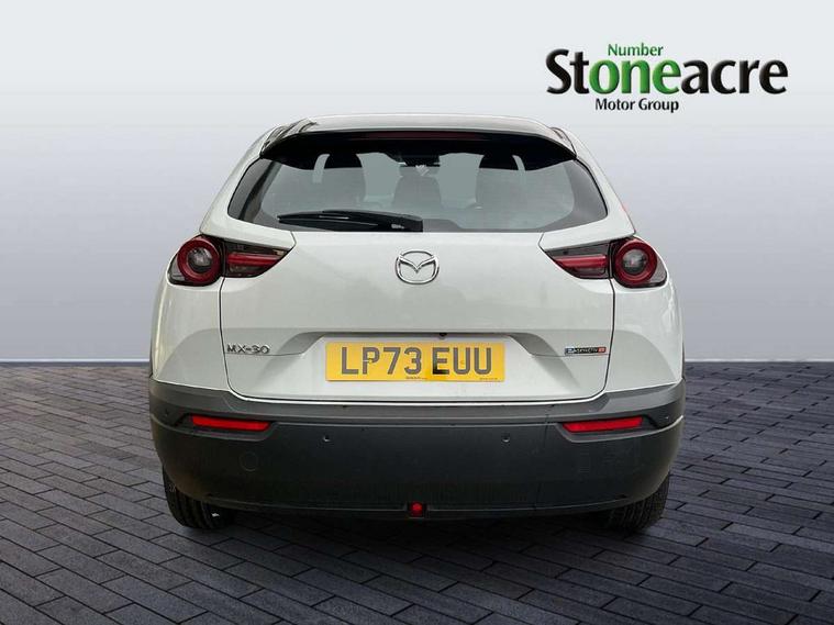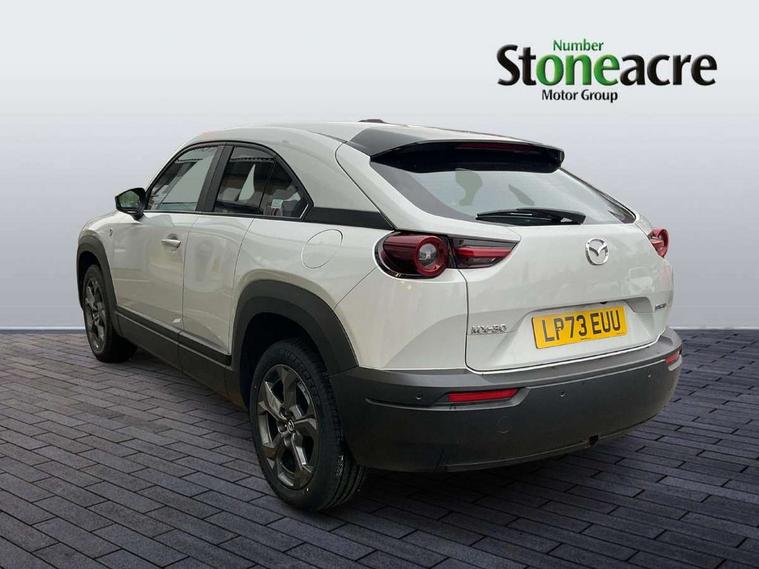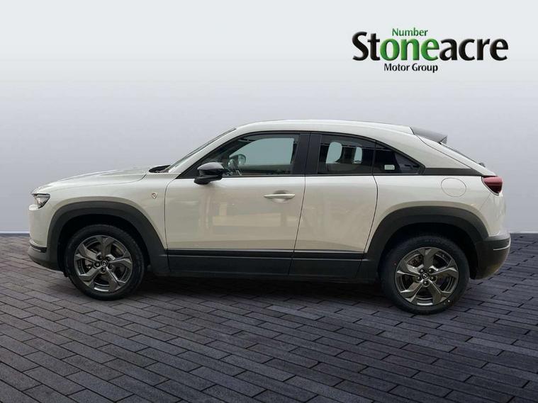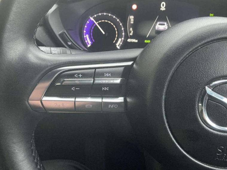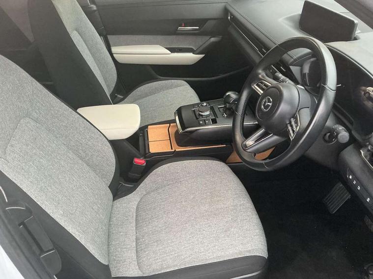 7" TFT Colour driver instrument panel display, 8.8" Colour centre touch screen display with Mazda Connect infotainment, Adaptive cruise control (Mazda radar cruise control) features stop and go, Apple car play/Android Auto, Blind spot monitoring with rear cross traffic alert, Driver attention alert system, E-call with GPS, Emergency lane keeping with blind spot assist and road keep assist, Emergency stop signalling system, Front and rear parking sensors, Integrated bluetooth, Integrated Mazda navigation system, Intelligent speed assist, Lane keep assist system (LAS) with Lane departure warning system (LDWS), PAS, Power start/stop button, Reversing camera, Service indicator, Trip computer, Windscreen projected colour active driving display (head up display) with traffic sign recognition, 11 kW triphase onboard charger, DC socket for rapid charging up to 40KW, Internal Combustion Engine Sound Emulator, Type 2 for mode 2 AC charging via 3-point plug, Type 2 for mode 3 AC charging via home or public charge points, 8 Speakers, DAB Digital radio, FM, Multimedia Commander including separate volume dial, Steering wheel mounted audio/bluetooth controls, Auto headlight levelling, Black door mirrors, Black front grille, Body coloured bumpers, Coming/leaving home lights, Dusk sensing headlights, Electric front windows with one touch auto up/down, Electrically adjustable door mirrors, Front, rain-sensing wipers with adjustable sensitivity and speed, Gloss black rear roof spoiler, Heated and auto power-folding door mirrors in black with integrated indicator lights, High beam control, LED 3rd brake light, LED daytime running lights, LED Headlights, LED rear combination lights, Rear side wing doors, Rear wiper, Satin black B-pillar and C-pillar garnish, Unique R-EV exterior badging, 12v electrical power outlet, 3 seat bench in 2nd row, 60/40 split fold down rear seats, Climate control air conditioning operated by the central 7" touchscreen control panel, Cloth upholstery, Door panel trim - cloth with soft touch armrest, Driver and front passenger two rear grab handles with rear coat hooks, Driver seat manual slide, recline and height adjust, Driver, front passenger and two rear door pockets, Drivers and front passengers sun visors with vanity mirrors and driver's ticket holder, Front and rear LED lighting, Front centre armrest with storage and two cupholders, Front passenger seat manual slide, recline and height adjust, Illuminated glovebox, ISOFIX child seat anchorage points attached on outer rear seats, Leather wrapped steering wheel and shift lever, Luggage compartment LED lighting, Mazda heritage cork accents on the console tray and cupholder lids, Rear centre armrest with two cup holders, Roof mounted sunglasses holder, Seatback pocket at rear of the front passenger seat, Single front passenger seat, Steering wheel telescopic and tilt adjustment, Tonneau cover, Two front and three rear height-adjustable head restraints, USB and 12V Outlet, 3 point ELR front seat belts x2 with pretensioners, 3x3 point rear seat belts, Anti-lock braking system (ABS), Collision avoidance braking, Driver central airbag, Drivers knee airbag, DSC - Dynamic Stability Control, Electric G-Vectoring control plus, Electronic parking brake with auto disengage function and auto hold function, Front and rear curtain airbags, Front dual stage driver and single stage front passenger airbags, Front passenger airbag cut-off switch, Front side airbags, Hill hold assist, Pre-crash safety system - Smart brake support (SBS) with turn-across traffic, Rear door child safety locks, Regenerative braking system (5 modes. Selected via paddle shift switches), Seatbelt reminder audible warning for driver, passenger and rear seats, Traction control system (TCS), Tyre pressure monitoring system (TPMS), Keyless Go, Remote central locking with deadlocking and automatic door lock when driving, Thatcham accredited alarm and immobiliser, 18" Grey metallic alloy wheels, Emergency tyre repair kit,