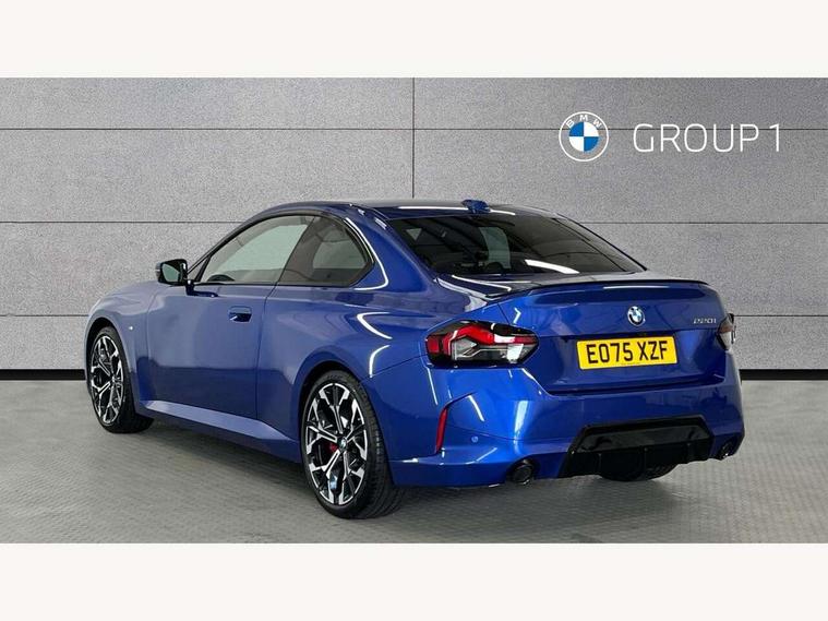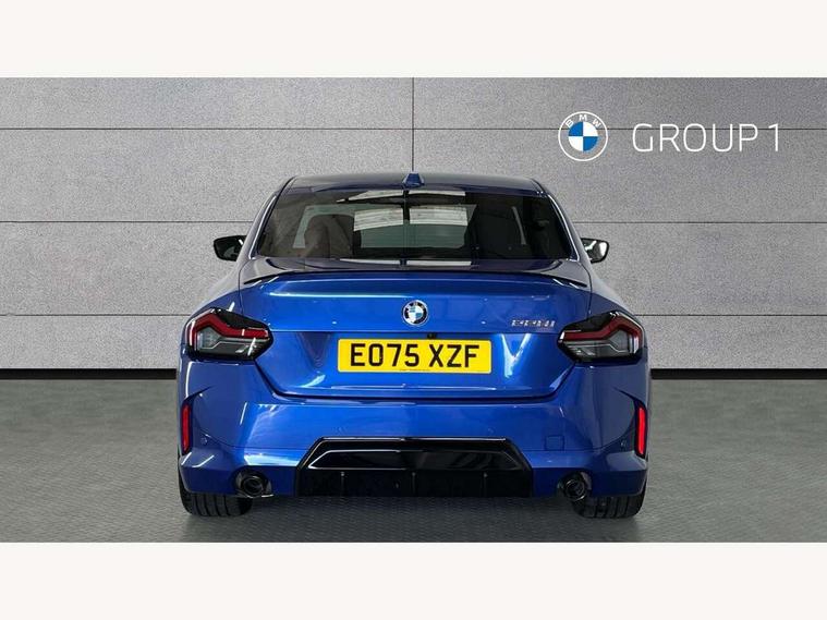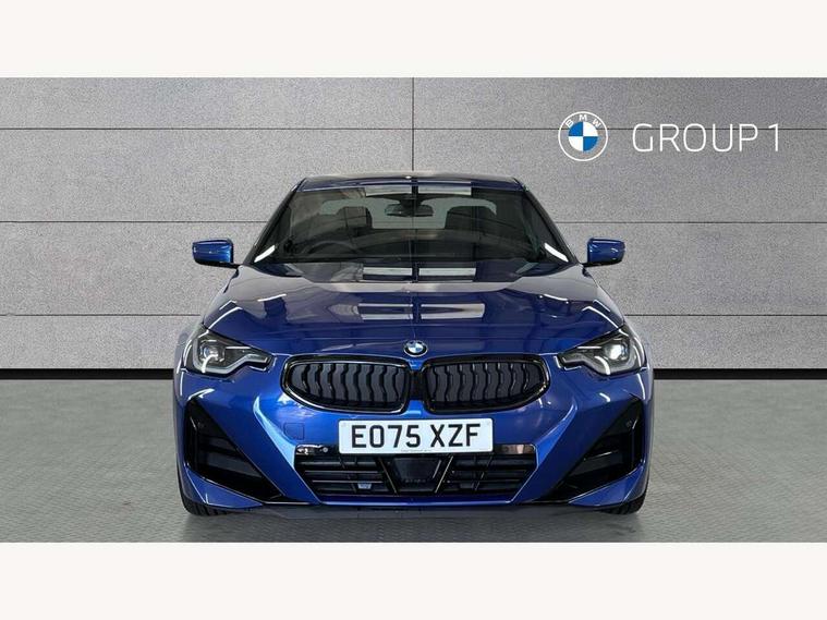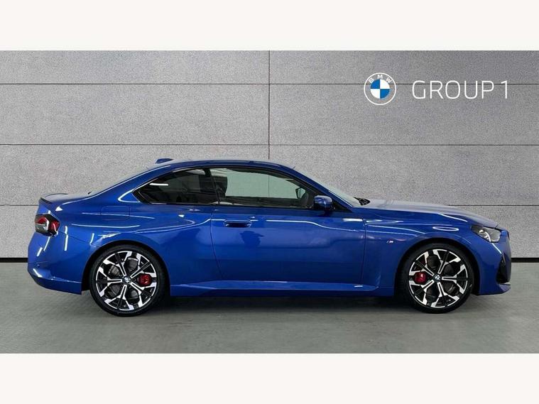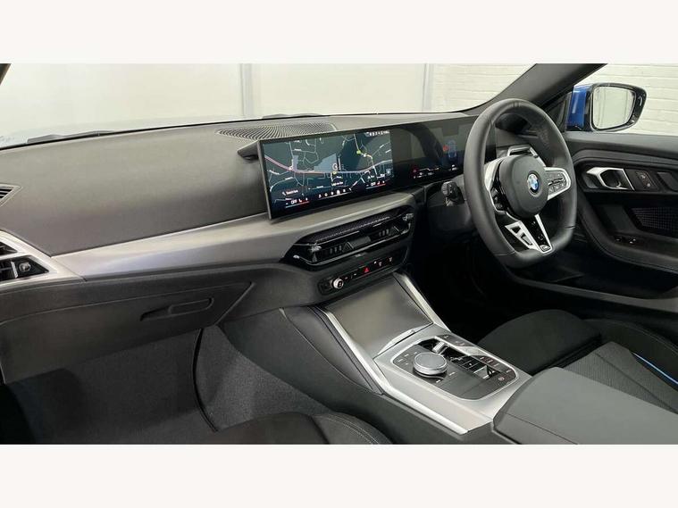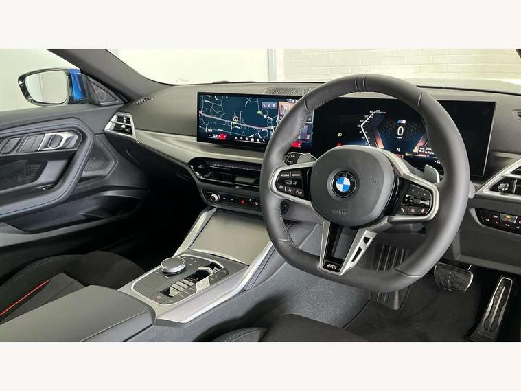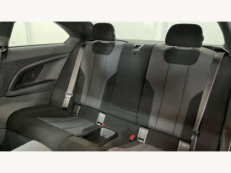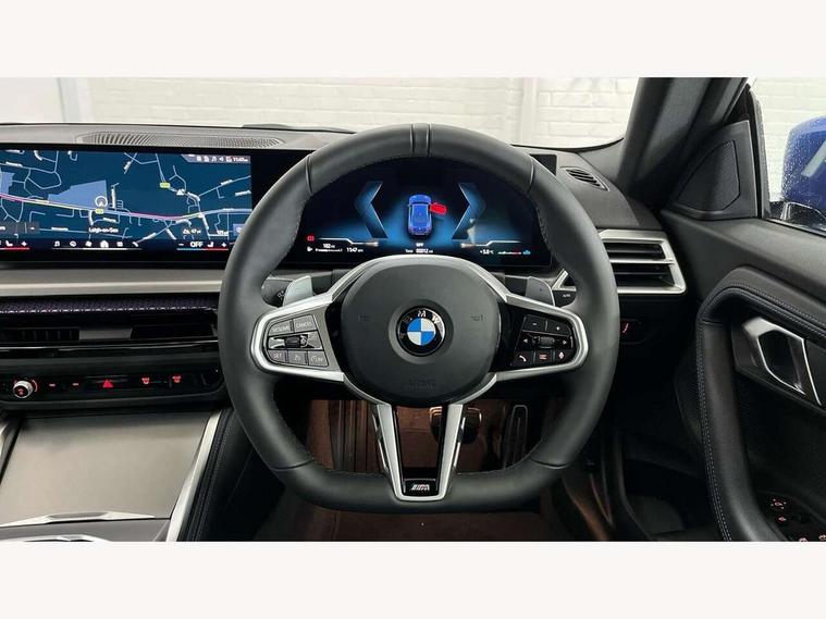 Active guard plus, Attentiveness assist, Bluetooth with USB, BMW ConnectedDrive online services, BMW Intelligent Personal Assistant, BMW Live cockpit plus, BMW Teleservices, Check Control warning system for monitoring of lights and door/luggage compartment open warning, Control Infotainment, Direct selection buttons, Drive off assistant, eSim with 5G connectivity, Front and rear parking sensors, iDrive controller with turn and press function, Intelligent functions, Oil sensor for level and grade, Optimum shift indicator, Parking assistant with active park distance control, reversing assistant, lateral parking aid and rear view camera, Personal Profile, Smartphone integration, Touch operation on control display, Variable sport steering, Widescreen display with 12.3" fully digital instrument cluster and 14.9" control display, WiFi interface for wireless connection of mobile terminal devices, Aluminium lightweight construction, Balancer shaft, BMW TwinPower Turbo four-cylinder petrol engine, Double VANOS, Drive performance control with ECO PRO comfort + sport mode, Dynamic stability control, Electronic differential lock, High precision injection, M sport suspension, Petrol Particulate Filter, Steptronic transmission with gearshift paddles, Twin scroll turbocharger with Valvetronic, 1 x USB Type A with data transfer and 1.5 Ampere charging function in the centre console, 1 x USB Type C with 3 Ampere charging function in the front centre armrest, DAB tuner, Acoustic windscreen wipers for reduced driving noise, Automatic windscreen wipers and automatic headlight, Body colour door handles flush with door surface, Body colour door mirrors, Body colour front and rear bumpers, Daytime running lights, Electric windows - front and rear, with open/close fingertip control and trap release, Exhaust tailpipes x2 - 90mm in left and right, Fading support, Front and rear bumper system with replaceable deformation elements, Front door sill finishers in black plastic with BMW designation, Front windscreen wipers with integrated washer jets, Green tinted heat protection glazing, High gloss black sill, bumper trim sides and diffuser insert, High level third brake light, Indicators integrated int mirror housing, Interior rear-view mirror with automatic anti-dazzle function, LED registration plate light, LED technology rear tail lights, brake lights and turn indicators, M high gloss shadowline, Radiator grille frame and tailpipe trims in pearl chrome, Rear boot, Rear fog lights, Reversing light in rear light cluster, Shark fin antenna, Single part LED rear lights with smoked glass components, Trailer stabilisation logic, Visible VIN plate, 12V power socket in front centre console with blanking plug, 2 cupholders in front centre console, 2 zone automatic air conditioning, Ambient door pocket lighting in the cetre console, Ambient inside door handle light, Area lighting in the door trim panel, Conditioned based service, Door entry lights in the front door trim panel, Dynamic ambient lighting for welcome, goodbye, open doors, phone call, English handbook, Folding rear seat head rests, Front ambient footwell lighting, Front ambient lighting, Front and rear side armrests integrated into door trim, Front armrest, Front door pockets, Front head restraints, Heated front seats, Illuminated glove compartment with separate small compartment, M headliner Anthracite, M sport leather steering wheel, Manually adjustment steering wheel column, Rear seat backrest with manual 40:20:40 split folding, Rear seat centre foldable armrest with integrated cup holder, Single front passenger seat, Storage compartment between rear seats, Storage tray and compartment with cover in centre console, Sun visors with vanity mirrors and insert tab, Through loading system with 40/20/40 split folding 2 rear seat in 2nd row, Velour floor mats, Connected pack professional - 2 Series Coupe, M Sport exterior styling aerodynamics pack - 2 Series Coupe, Storage compartment pack - 2 Series Coupe, 2 tone horn, Anti lock braking system (ABS) with cornering brake control, BMW emergency call, Brake drying, Child seat ISOFIX attachment for the two outer rear seats, Crash sensor activating of airbags, Unlocking doors, hazard warning lights, interior light, safety battery terminal, Deactivation of fuel pump in the event of a crash, Driver and front passenger airbags, Driver and front passenger side airbags, integrated in the door side seat backrest bolsters for all seat variants, Dynamic brake control, Dynamic Traction Control - DTC, Electrically operated hand brake including automatic hold function and automatic release when driving off, Front and rear disc brakes, Front centre airbag between driver and front passenger seats, Front passenger airbag deactivation, Head airbags for all 4 outer seats, PC iBrake (Post crash approach control warning with light braking function), Seat belt security check for driver and front passenger, Seatbelt warning, Side impact protection, Three point seat belts on 4 seats including front belt stopper, pyrotechnic belt tensioners and belt force limiters, Tyre pressure monitoring system, Warning triangle and first aid kit, Alarm system (Thatcham 1) with remote control and electronic engine immobiliser, Central locking switch for all doors, fuel filler cap and luggage compartment, Deadlocking function system to all doors, Drive away locking system on all doors and luggage compartment, Locking wheel bolts, Start/Stop button (illuminated) in centre console with keyless engine start and Auto Start-Stop deactivation button, Two remote control key with integrated key - one button for open and close doors/fuel flap/tailgate and separate button for unlock luggage compartment, Electrically powered 12V compressor, Reduced rolling resistance tyres, Tyre repair kit,