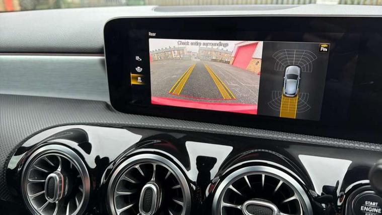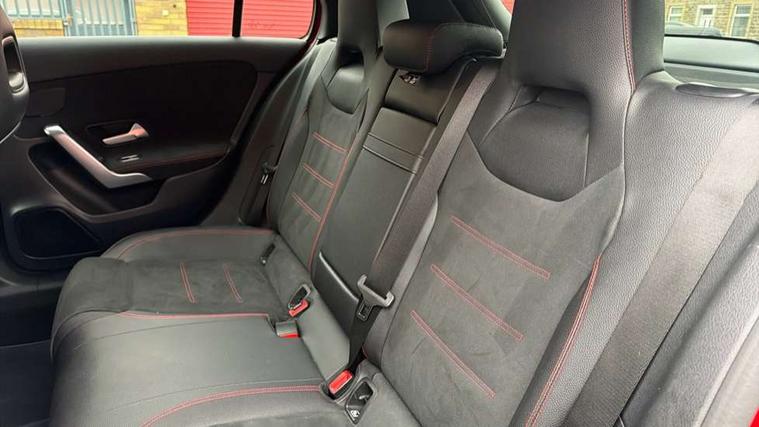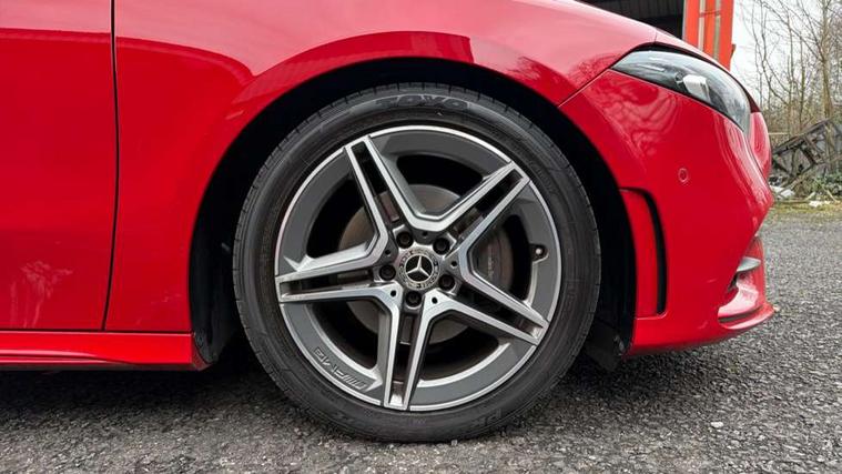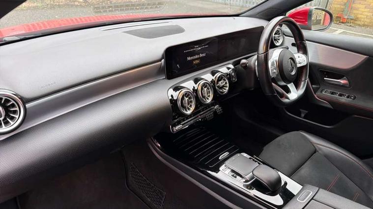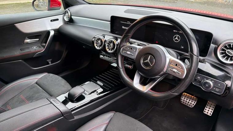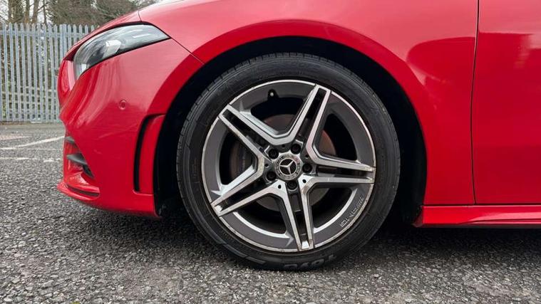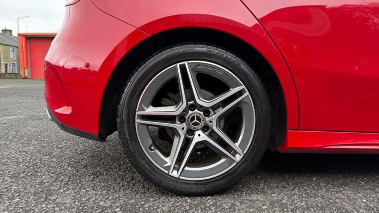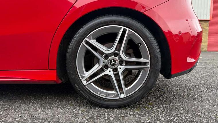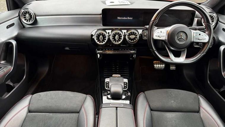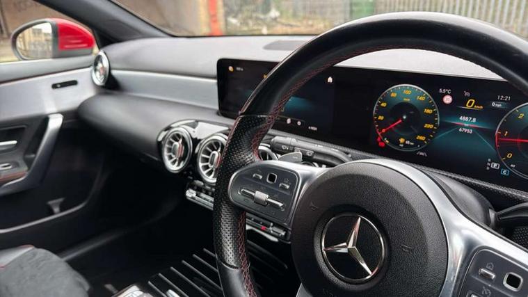 10.25" Digital instrument cluster display screen, 180 degree rear view camera with parking guidelines, Active lane keep assist, Active park assist with parktronic system including front and rear parking sensors, Attention assist, Brake pad wear indicator warning light, Direct steering, DYNAMIC SELECT with a choice of driving modes (ECO, Comfort, Sport and Individual), ECO start/stop function, Fluid level warning indicator for fuel, oil, coolant and washer fluid, Hard-disk navigation, Hey Mercedes Voice activation, Lamp failure indicator, MBUX multimedia system with DAB digital radio and touchpad including satellite navigation, Mercedes me connect including emergency call system, accident recovery, breakdown management and maintenance, Outside temperature gauge, Radio aerial integrated into roof spoiler, Service indicator (ASSYST), Speed sensitive power steering, Trip computer, Lowered comfort suspension, DAB Digital radio, Dual bluetooth interface, 2 USB ports (type C), Mid-range sound system, 4 Electric Front and Rear windows, Adaptive brake lights, AMG front, rear apron and side skirts, Blue tinted glass, Body colour bumpers, Body colour door handles, Body colour side skirt, Body coloured door mirrors, Chrome beltline trim, Diamond radiator grille with chrome pins and silver louvre + chrome insert, Electric adjustable and heated door mirrors with integrated LED side indicators, Exhaust system - Twin trapezoidal tailpipes in polished stainless steel, Headlamp assist automatic headlamp activation, Heated glass rear windscreen + timer control, LED high performance headlamps with integrated LED daytime running lights, LED tail lamp, LED third brake light, Privacy glass, Rain sensor windscreen wipers, Rear fog lights, Rear wiper, 12V socket, 3 Spoke flat bottom leather multi function steering wheel with perforated leather in grip area, 40:20:40 split folding rear seats, Air vents surround and cruciform nozzle in silver chrome, AMG floor mats with red stitching, Artico man-made leather/Microfibre Dinamica upholstery with red contrast stitching, Auto Mercedes-Benz child seat recognition sensor, Black roof lining, Brushed stainless steel sports pedals with rubber studs, Controller on centre console with chrome surround, Cup holder and stowage compartment lighting, Freight packaging without tie-down hooks, Front centre armrest with storage compartment, Front door sills with Mercedes benz lettering, Front footwell lights, Front reading lamps in left and right console downlighter, Front seat backs luggage nets, Front seat cushion length adjustment, Front signal exit lamp, Front vanity lights, Gearshift paddles on steering wheel, Handle recess/closing light, Heated front seats, Height/reach adjustable steering column, Illuminated door sills, Illuminated glove compartment stowage, Interior lighting - 64 colour Ambient lighting, ISOFIX Child seat top tethers and anchor fixings, Luggage compartment cover, Manual height adjustable front seats, Oddments tray lighting, Rear armrest, Rear head restraints, Rear Reading Lamps, Seat occupancy sensor for front passenger seat, Spectacles compartment for driver, Sports seats with integrated headrests, Storage compartment under load area floor, Stowage compartment in centre console with retractable cover, Sunvisors with illuminated vanity mirrors, Touchpad, Touchpad illumination, Twin front cupholders, Two zone thermotronic luxury automatic climate control, Light and sight pack - A Class, Mirror package - A Class, Seat comfort pack - A Class, 3 rear 3 point seatbelts, ABS with Brake Assist, Active bonnet, Adaptive brake assist with hold function and hill start assist, Black seatbelts, Childproof locks manually operated for rear doors and electrically operated for rear power windows, Crash responsive emergency lighting, Driver and passenger head and side airbags, Drivers knee airbag, Dual stage driver/passenger airbags, Electronic parking brake, ESP curve dynamic assist, ESP with ASR, Front and rear seatbelt reminder, Front brake callipers with Mercedes Benz lettering, Tyre pressure monitoring system, Warning triangle and first aid kit, Window airbags, Alarm system/interior protection/immobiliser, Keyless entry lock/unlock, Remote central locking and crash sensor with emergency opening function, 18" AMG 5 twin spoke light alloy wheels in titanium grey with highsheen finish, Summer tyres, Tirefit sealant kit,