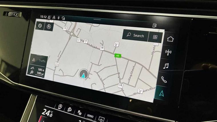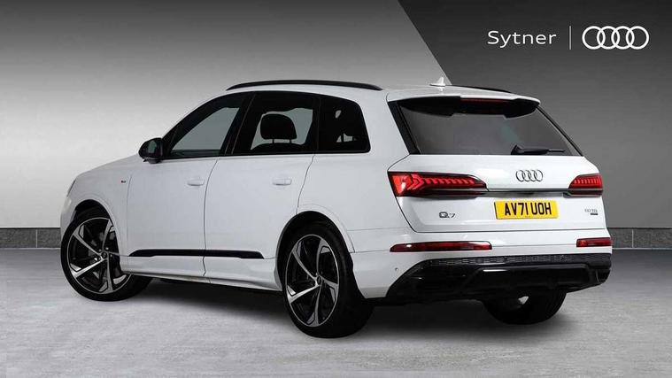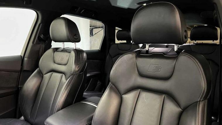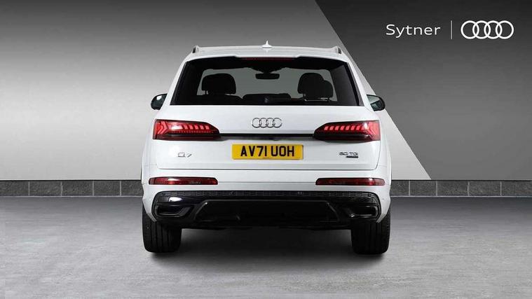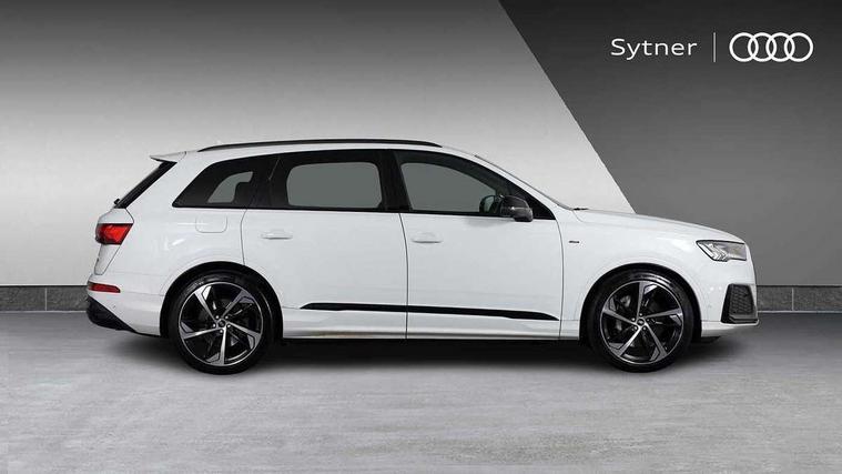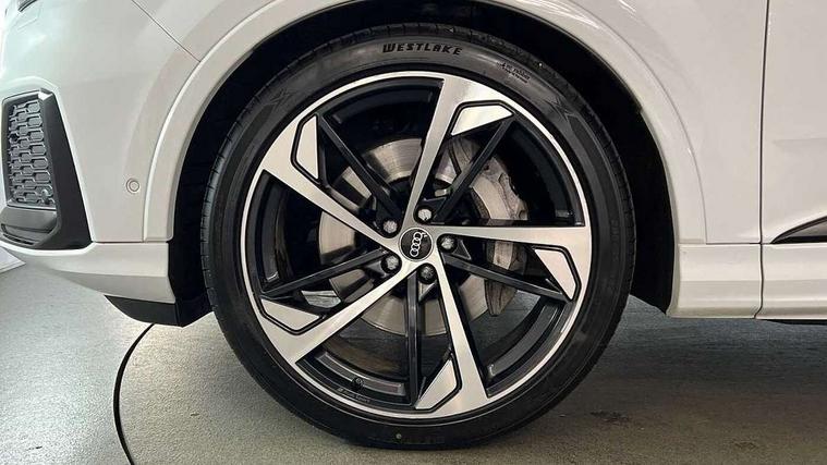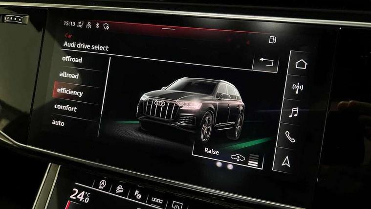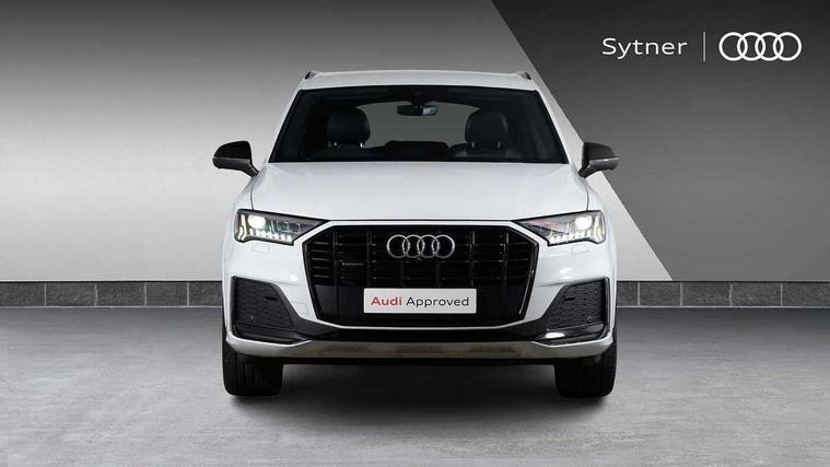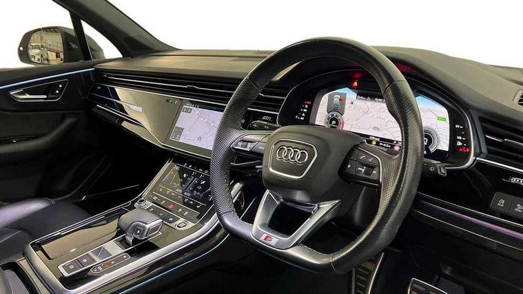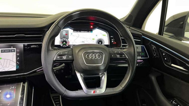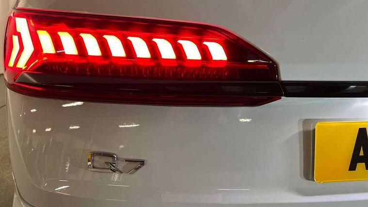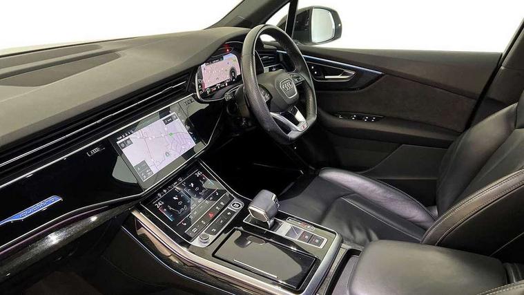 Audi connect safety and service (e-call), Audi connect with Amazon Alexa Integration, Audi drive select (Auto, Comfort, Dynamic, Efficiency, Individual, Off-road and All road), Bluetooth interface, Camera based traffic sign recognition, Electromechanical steering, MMI navigation plus with MMI touch screens includes 10.1" and 8.6" screens with haptic feedback, Natural voice recognition, Parking system plus with 360 degree display (front, rear and side sensors) - acoustic and visual park assist system, Power operated tailgate, Rear view camera, Smartphone interface includes wireless Apple carplay/Android Auto, Start/stop system, 48V Mild hybrid technology, Adaptive air sports suspension, Quattro all wheel drive with self locking centre differential, Audi music interface - front 2 USB-C ports with charger and data functions, Audi sound system with 6 channel amplifier, 180 watt amplifying capacity and 10 loudspeakers including subwoofer, DAB digital radio module, 3rd brake light, Audi matrix LED headlights with dynamic front and rear indicators, Auto dimming frameless rear view mirror, Black roof rails, Bumpers in contrast paint scandium grey finish includes door trim and wheel arch trim strips, inlays in door strip contain quattro embossing, Electrically adj heated/folding + automatically dimming exterior mirrors with memory + automatic kerb side function for passenger side exterior mirror, Heat insulating glass in windshield, Integrated LED indications in door mirrors, LED daytime running lights, LED rear tail lights, Privacy glass - dark tinted rear and rear side windows from B-pillar backwards, Rear side wing doors, Rear wiper, 2 seat bench in 3rd row, 3 seat bench in 2nd row, 4 zone deluxe automatic climate control, 7 seat layout with ISOFIX points for the front passenger seat and rear passenger seat, Black cloth headlining, Comfort front centre armrest, Electric adjustable front seat with 4 way lumbar support, driver memory functionality, Folding rear seats, Front head restraints, Front/rear floor mats, Heated front seats, Illuminated door sill trims with S logo, LED interior ambient lighting, Luggage compartment cover, Luggage compartment sill protection in stainless steel, Rear head restraints, Single front passenger seat, Stainless steel pedals, Sunvisors with illuminated vanity mirrors, Titanium black styling pack - Q7/SQ7, 3 point seatbelts on all rear seats, Audi pre sense front, Child locks on rear doors, Driver and front passenger, front side and curtain airbags, Electromechanical parking brake, Electronic Stabilisation Control (ESC) including ABS, ASR and EDL, Extended pedestrian protection measures, Hill hold assist, Seatbelt monitoring, Tyre pressure loss indicator, Warning triangle and first aid kit, Anti theft alarm, Anti-theft wheel bolts and wheel loosening detection, Keyless Go, Remote central locking, Polished oak trim with grey finish inlay, Tool kit, Tyre repair kit,
