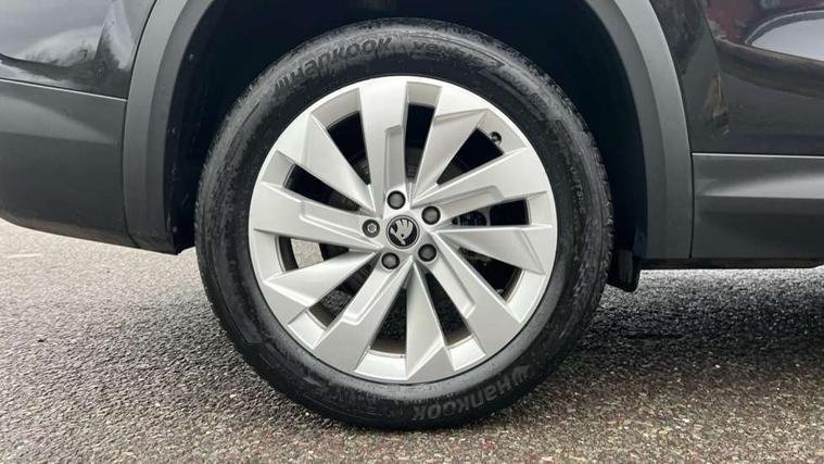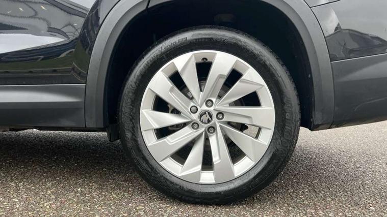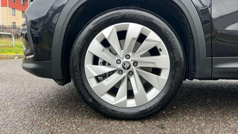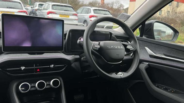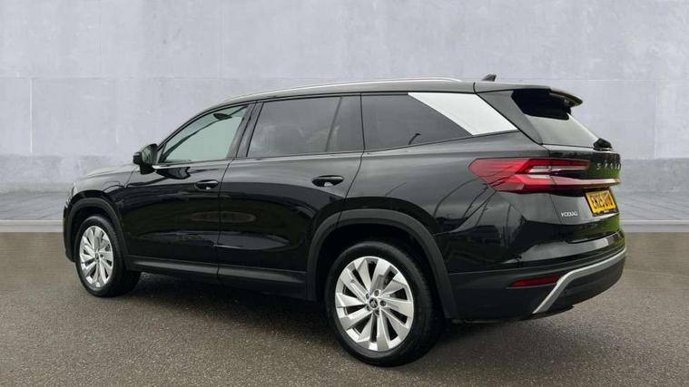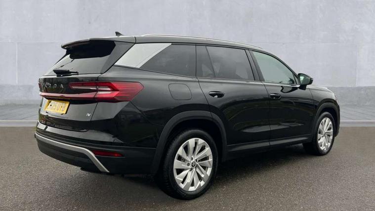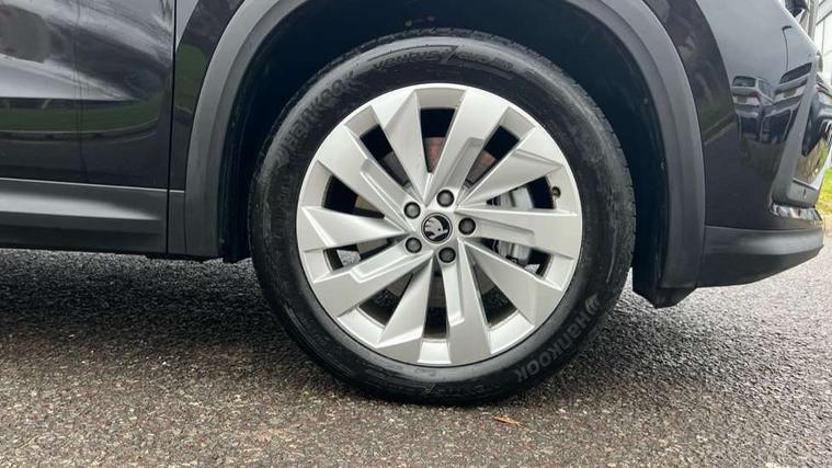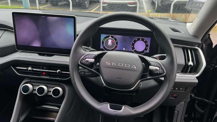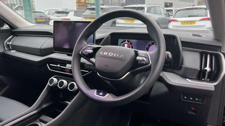 13" satellite navigation touchscreen display, Blind spot detection with door exit warning, Bluetooth system, ChatGPT functionality, Driver alert - Fatigue and drowsiness monitor, Dry display cleaner, Emergency call, Front and rear parking sensors, Front cross traffic assist, Lane assist, PAS, Rear traffic assist, Tailgate unlocking from outside, Traffic sign recognition, USB C Port x 2 in front centre console, Virtual Cockpit - 10.25" digital display, Voice control system, Wireless charging for two smartphones (15W) with cooling function, Wireless SmartLink for Apple CarPlay and Android Auto, 32A charging cable, Stop/start function, 2x USB-C in the rear, DAB Digital radio, Aero front windscreen wipers with intermittent function, Auto dimming rear view mirror, AWL (all weather lighting) and all weather light with cornering function, Black wheel arch surrounds, Body colour bumpers, Body colour door mirrors and handles, Cornering light and poor weather light, Electric folding /adjustable/separted heated/folding door mirrors, auto dimming with boarding sports and memory function, Electric front and rear windows, Exterior black decorative trims, Heat insulating glass in windshield, Heated rear window, Ice scraper in fuel tank cap, Invisible tailpipe, LED daytime running lights, LED third brake light in rear spoiler, Light assistant with automatic headlight control and coming home feature, Logo projection in door mirrors, Privacy glass, Rear roof spoiler, Rear side wing doors, Rear window wiper, Red decorative strip between rear LED lights, Safety reflectors on front and rear doors, Unique dark chrome design logo on alloy wheels, Window control switches with black trim, Windscreen wipers with rain sensor, Without engine designation, 1.5l bottle holder points in all door, 1x centre rear reading light, 3 configurable smart dials with 32mm coloured display, 3 seat bench in 2nd row, 4 foldable roof handles with rear coat hooks, Ambient interior lighting - Dashboard, front-door stowage compartments, front and rear door panels and footwell lighting, Automatic gear selector on steering column, Chrome interior door handles, Driver/front passenger reading lights, Fabric headlining, Fixed bench 40:60:40 split folding backrests, Front and rear floor mats, Front centre armrest with jumbo box storage compartment, cup holder and 12V socket, Height adjustable front headrests, Isofix child seat fittings in outer rear seats and front passenger with top tether, iV badging on boot, Manually adjustable steering column, Pollen filter, Rear centre armrest with cupholders, Rear seat boot backrest release, Single front passenger seat, Skoda lettering on steering wheel, Storage pocket including mobile phone pockets on the backs of the front seats, Sunvisors with illuminated vanity mirrors, Three rear height adjustable headrests, Ticket holder on A Pillar, Tri zone climate control, Umbrella in door panel x1 made from sustainable materials, Upper and lower glovebox with card holder and coin compartment, USB C port by rear view mirror for charging only (15W), Exterior styling pack - Kodiaq, Auto door release and activation of warning lights in the event of an accident, Driver and front passenger airbag with knee airbag and front passenger airbag deactivation, Electric child locks, Electronic parking brake, ESC (incl. ABS+EMD+MSR+ASR+EDL+HBA+DSR+RBS+ESBS+MCB+TSA+XDS), Front assist with braking reaction to vehicles, pedestrians and cyclists, Front disc brakes, Fuel cut off safety device, Height adjustable front 3 point seatbelts + pretensioners, Hill hold assist, Junction assist with automatic emergency braking, Rear disc brakes, Safety vest holder in door, Seat belt reminder for all seats, Three point rear seat belts, Two tone horn, Tyre pressure monitor, Anti-theft wheel bolts, Immobiliser, Remote central locking with 2 keys, Breakdown kit, Tool kit,