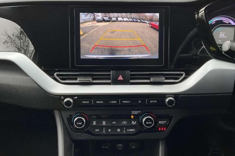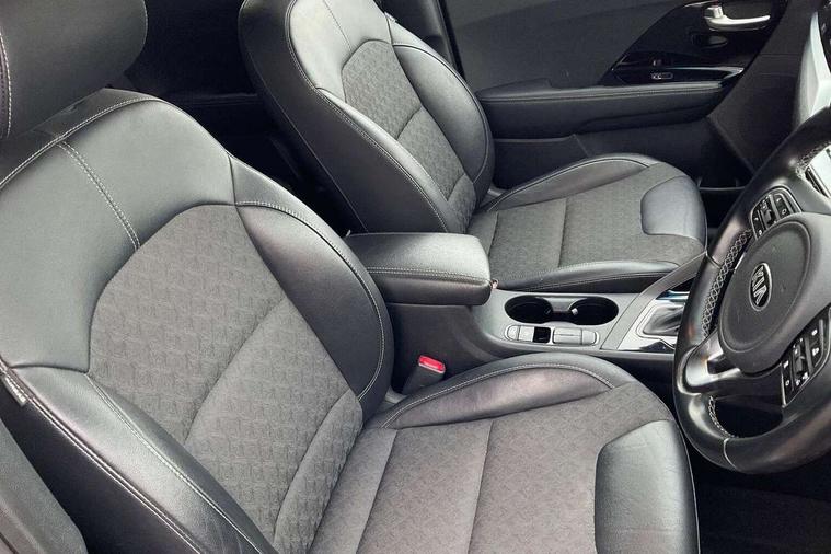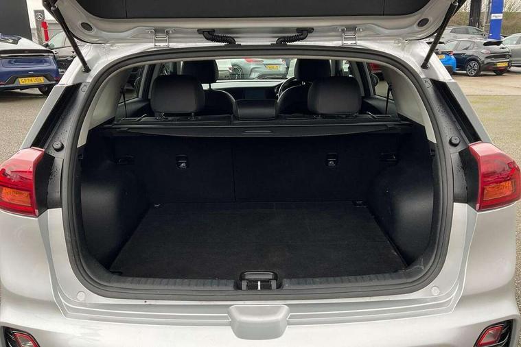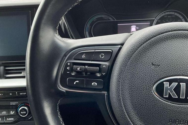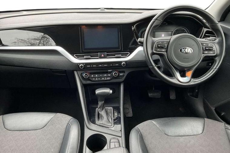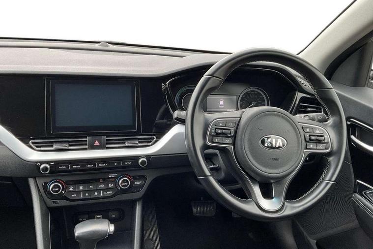 8" touch screen, Adaptive smart cruise control function (SCC) with stop and go, Apple car play/Android Auto with voice control, Digital clock, Drive mode selector, Driver attention warning, Emergency stop signalling system, Forward collision avoidance assist, Lane Following Assist (LFA), Lane keep assist, Motor driven power steering, Rear parking sensors, Reversing camera, Speed limiter, Trip computer with distance/fuel consumption/average speed, 'Shark fin' mobile antenna, 4.2" supervision cluster with TFT colour display, 6 speakers, Bluetooth with music streaming, DAB Radio with MP3, Steering wheel mounted controls, USB connection located in centre console, USB port, All round electric windows with drivers auto up/down function, Auto dimming rear view mirror, Automatic defog system, Automatic headlight control system, Black beltline mouldings, Black side sills, Body colour bumpers, Body coloured/high gloss door mirrors, Chrome door handles, Driver's side wide angle mirror, Electrically folding/adjustable/heated door mirrors with LED indicators, Front fog lights, LED daytime running lights, LED rear combination lights, Manual headlight levelling, Matt black radiator grille, Privacy glass - Rear windows and tailgate, Projector headlamps, Rain sensing front wipers, Rear spoiler, Rear wiper, Roof rails, Solar glass, Welcome and follow-me home light functionality, Wheel arch mouldings, 3 x passenger assist grips, 60/40 split/folding 2nd row of seats, All-round height adjustable headrests, Centre console storage box, Centre room lamp, Cloth/leather upholstery, Cupholders in rear armrest, Door armrest in leather, Driver's seat height adjuster, Driver/passenger sunvisors with illuminated vanity mirrors, Dual zone automatic air conditioning, Front and rear door storage, Front/rear centre armrests, Headlining in Light grey, High gloss black lower console trim, High gloss black steering wheel trim, Illuminated ignition key hole, Interior door lock/unlock function, ISOFIX Child seat top tethers and anchor fixings, Leather trimmed gearshift, Leather trimmed steering wheel, Luggage area lamp, Luggage compartment cover, Luggage net with hooks, Overhead console lamp with sunglasses case, Passenger seat height adjuster, Satin finish inner door handles, Seatback pocket - front passenger, Steering wheel mounted paddle shift, Tilt/telescopic adjustable steering wheel, Under floor storage box, Ventiliation ducts to rear compartment, Towing pack - Niro, 3 point seatbelts on all seats, ABS, Automatic unlocking of doors in case of impact, Drivers knee airbag, Electric parking brake with auto hold function, Electronic stability control, Front passenger airbag cut-off switch, Height adjustable front seatbelts, Hill start assist control (HAC), Traction control, Twin curtain airbags with roll over sensor, Twin front and side airbags, Tyre pressure monitoring system, Alarm system and engine immobiliser, Deadlocks, Locking wheel nuts, Remote central door locking with fold away key, Speed sensitive auto door locking, Visible vehicle identification number, High gloss black centre fascia, High gloss black door inserts, 16" alloy wheels, Tyre mobility kit,